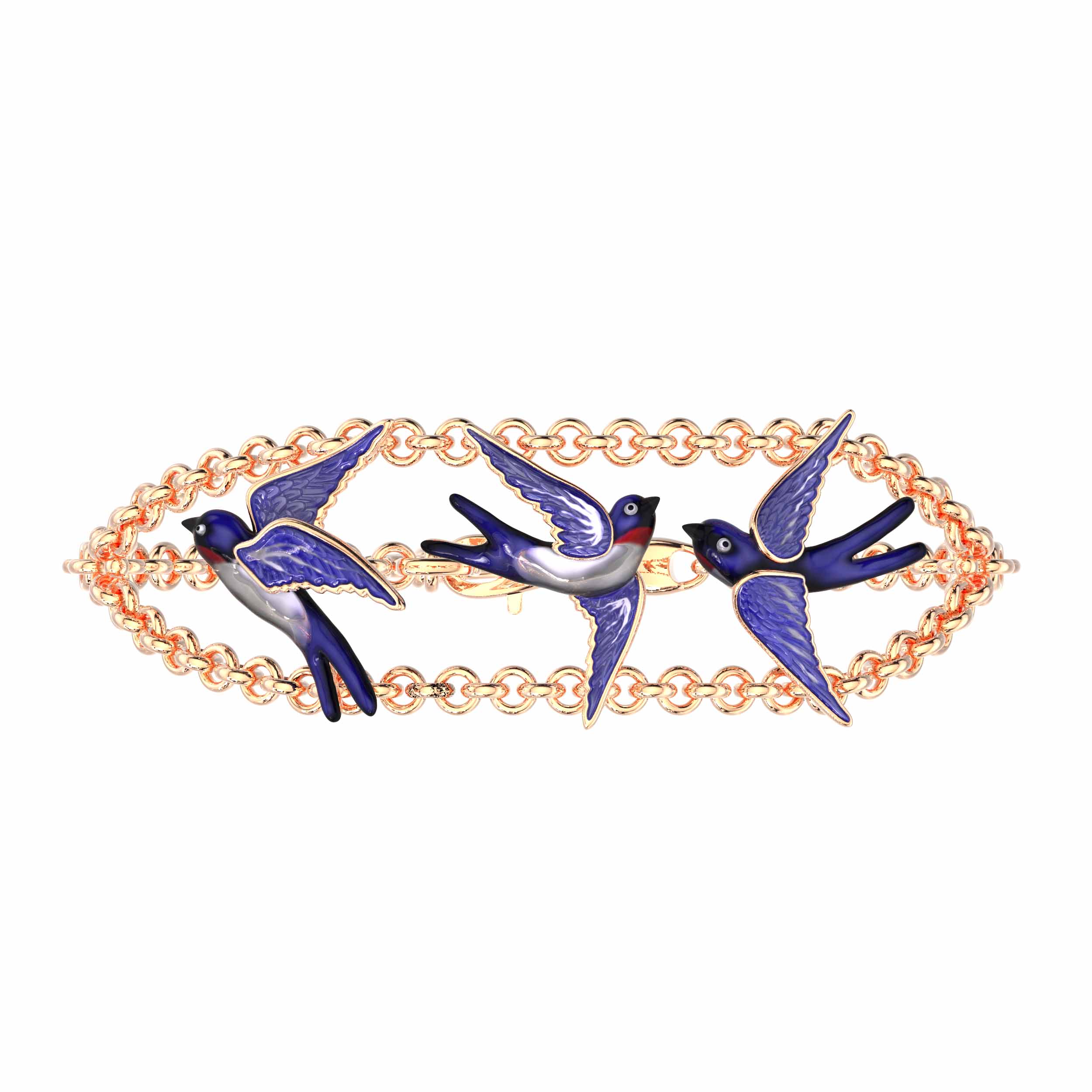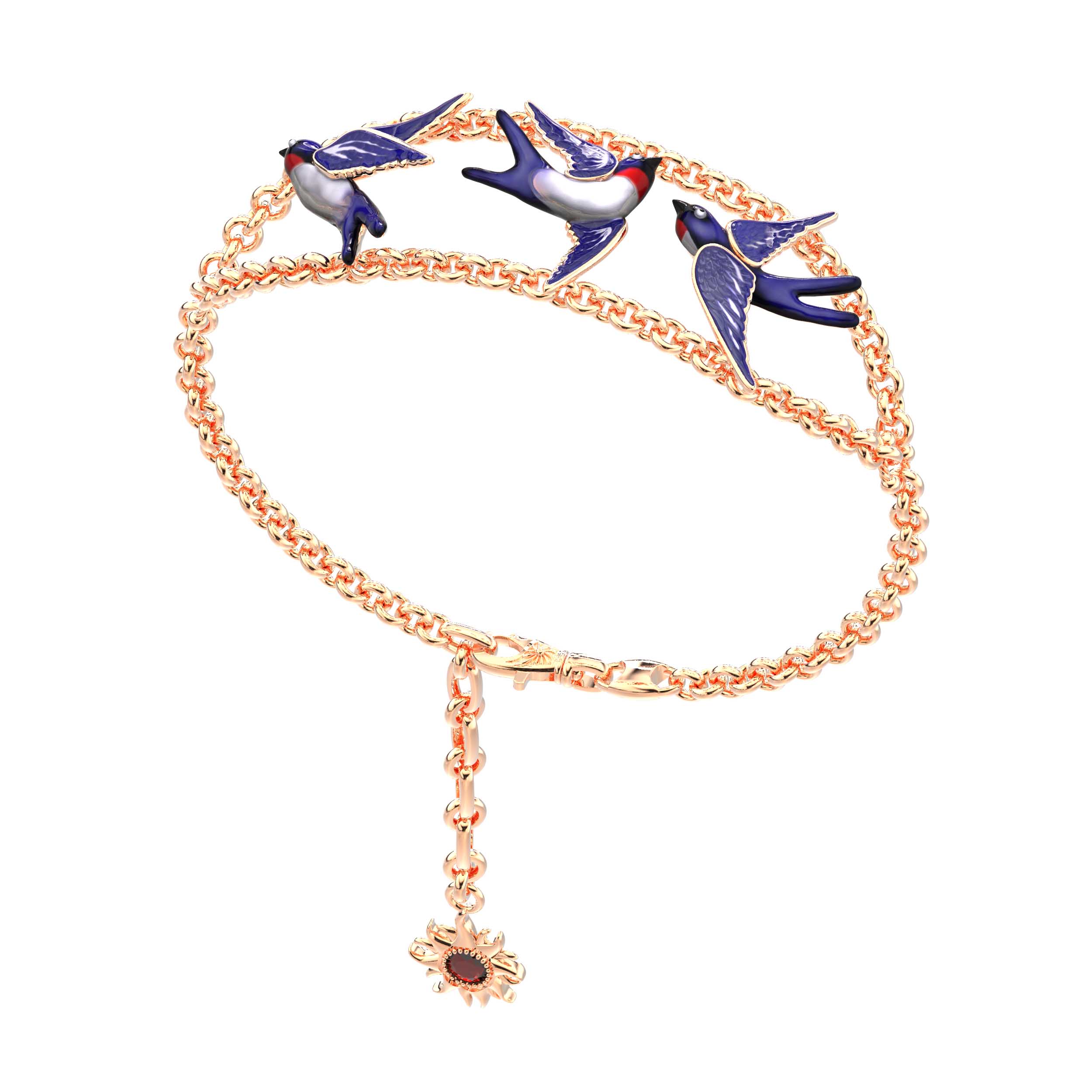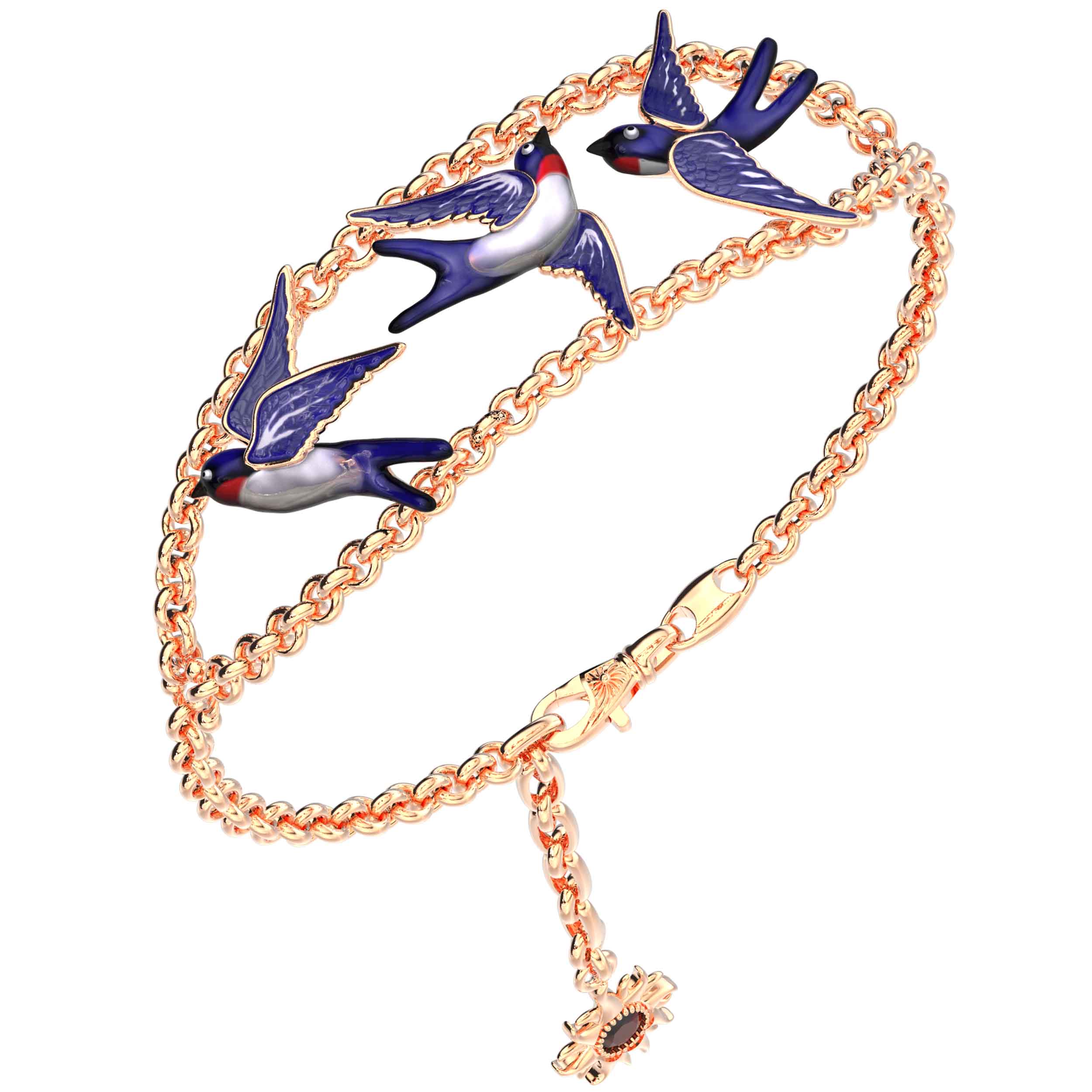 Этот золотой браслет с эмалью и рубином универсален и подходит как для женщин, так и для мужчин, предпочитающих утонченные и символичные украшения. Изделие станет прекрасным дополнением образа и может быть дополнено другими украшениями из этой же серии для создания гармоничного комплекта. Ювелирный браслет с птицами — это не только аксессуар, но и отражение вашего безупречного вкуса.