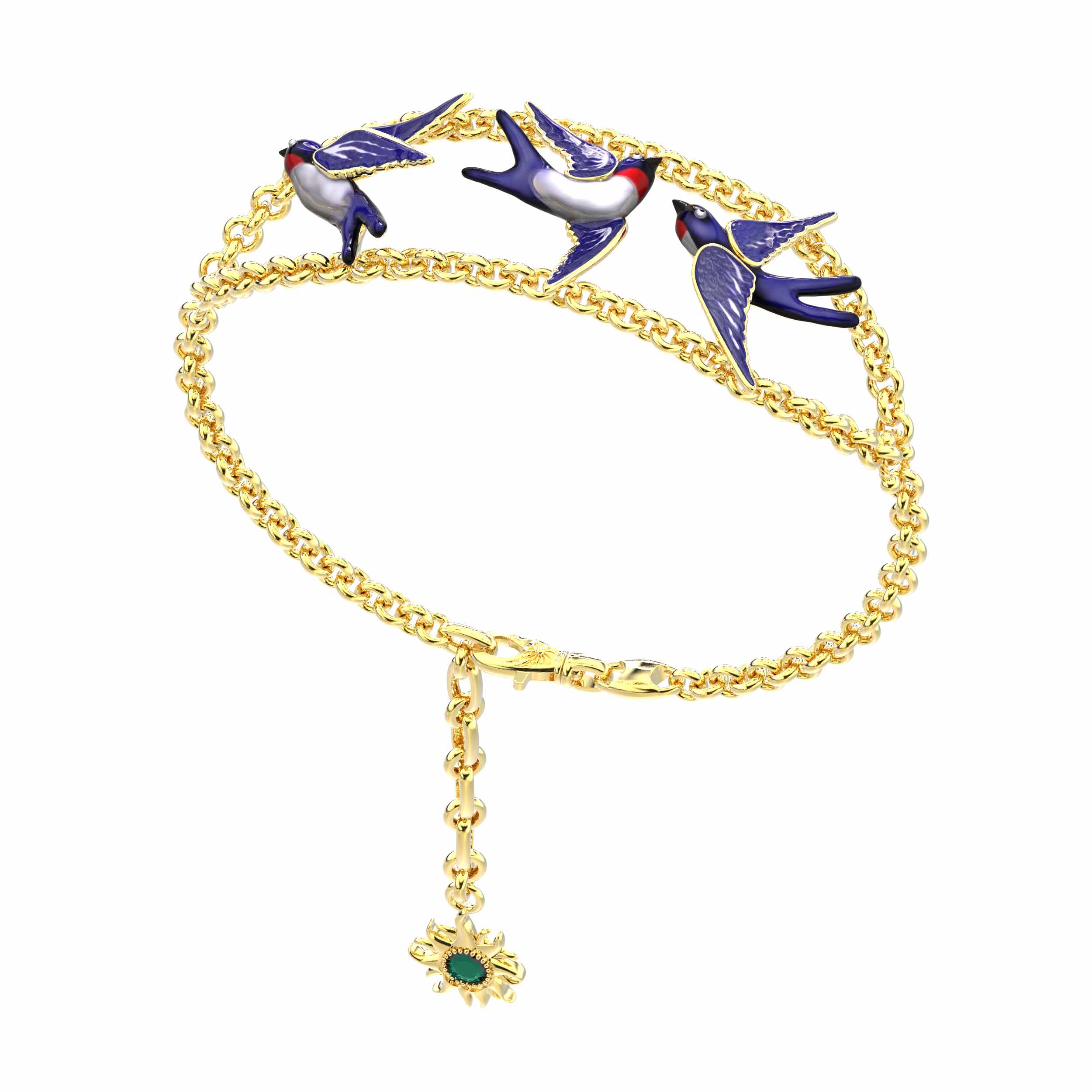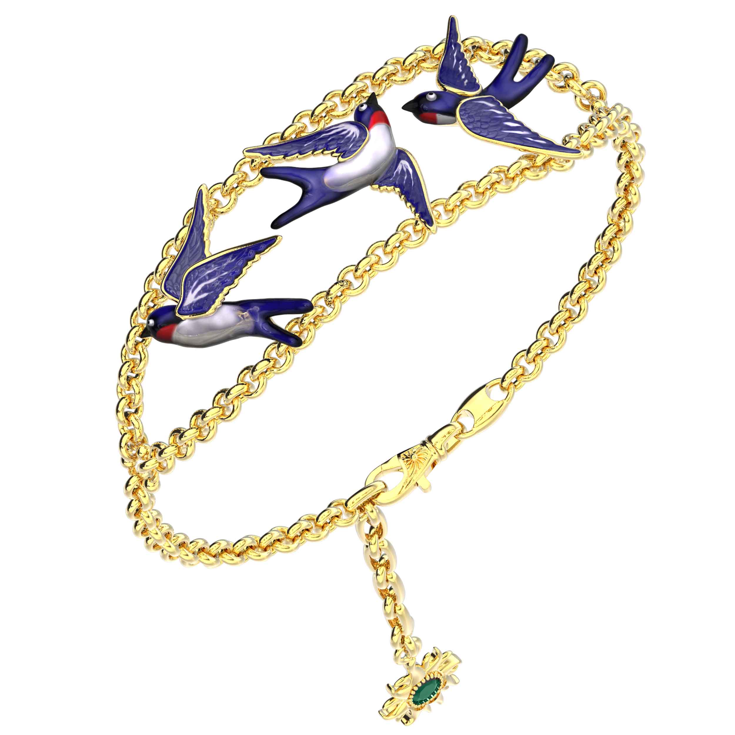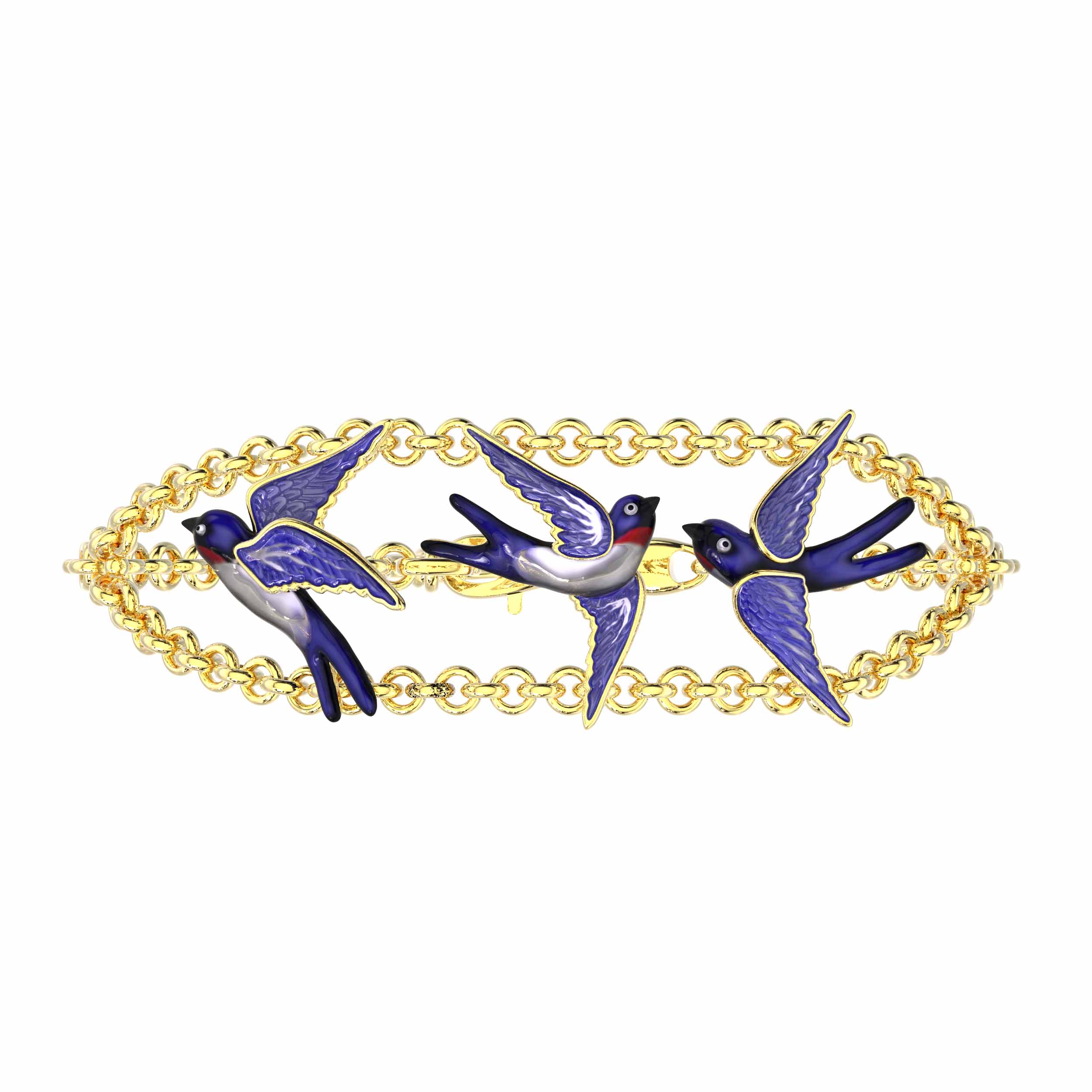 Изысканный браслет из лимонного золота 585 пробы из коллекции De Luxe — Ласточки станет ярким акцентом в вашем образе. Дизайн украшения воплощает легкость и свободу: центральным элементом стали декоративные вставки в форме грациозных птиц, покрытые разноцветной эмалью. Такое художественное решение придает изделию динамику и делает его узнаваемым аксессуаром для тех, кто ценит ювелирное искусство.