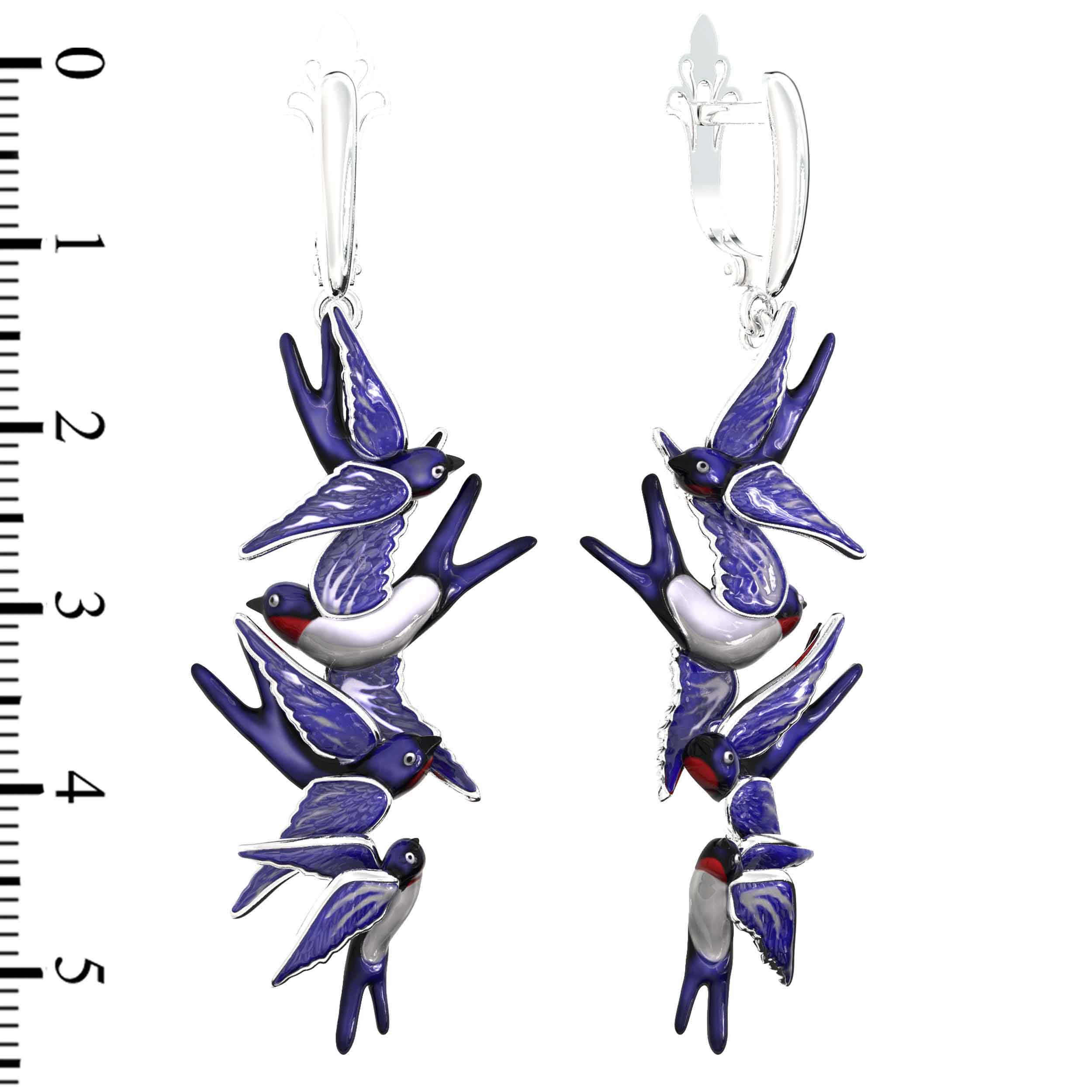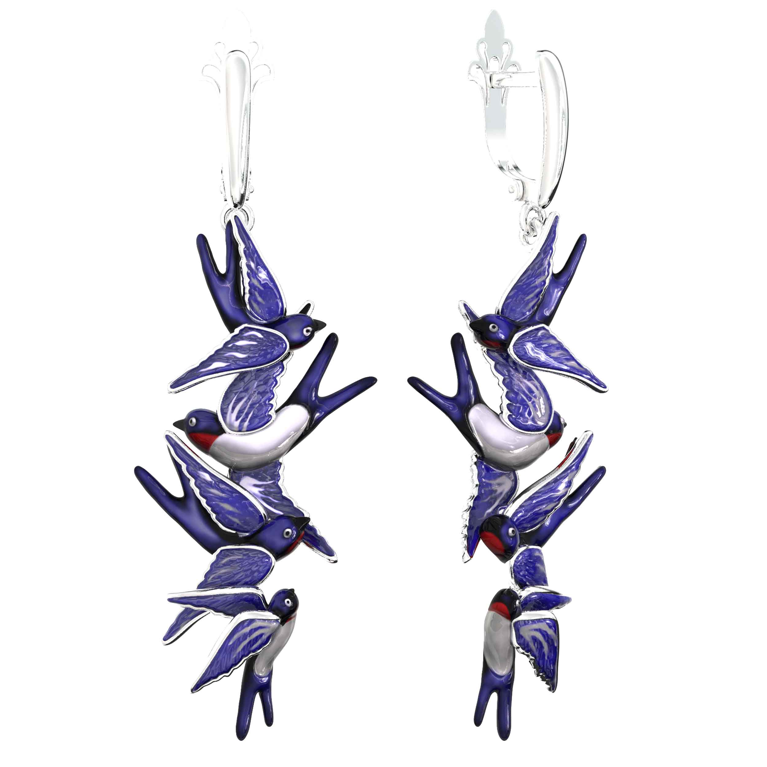 Серьги из белого золота 585 пробы из коллекции De Luxe — Ласточки — это воплощение утонченности и свободы. Дизайн изделия вдохновлен грацией птиц: искусные подвески выполнены в форме парящих ласточек, которые создают ощущение легкости и динамики при каждом движении. Холодный блеск белого металла гармонично сочетается с выразительной художественной эмалью, придающей украшению глубину и особую эстетику. Разноцветные вставки на эмали подчеркивают детали оперения, делая каждую пару уникальной.