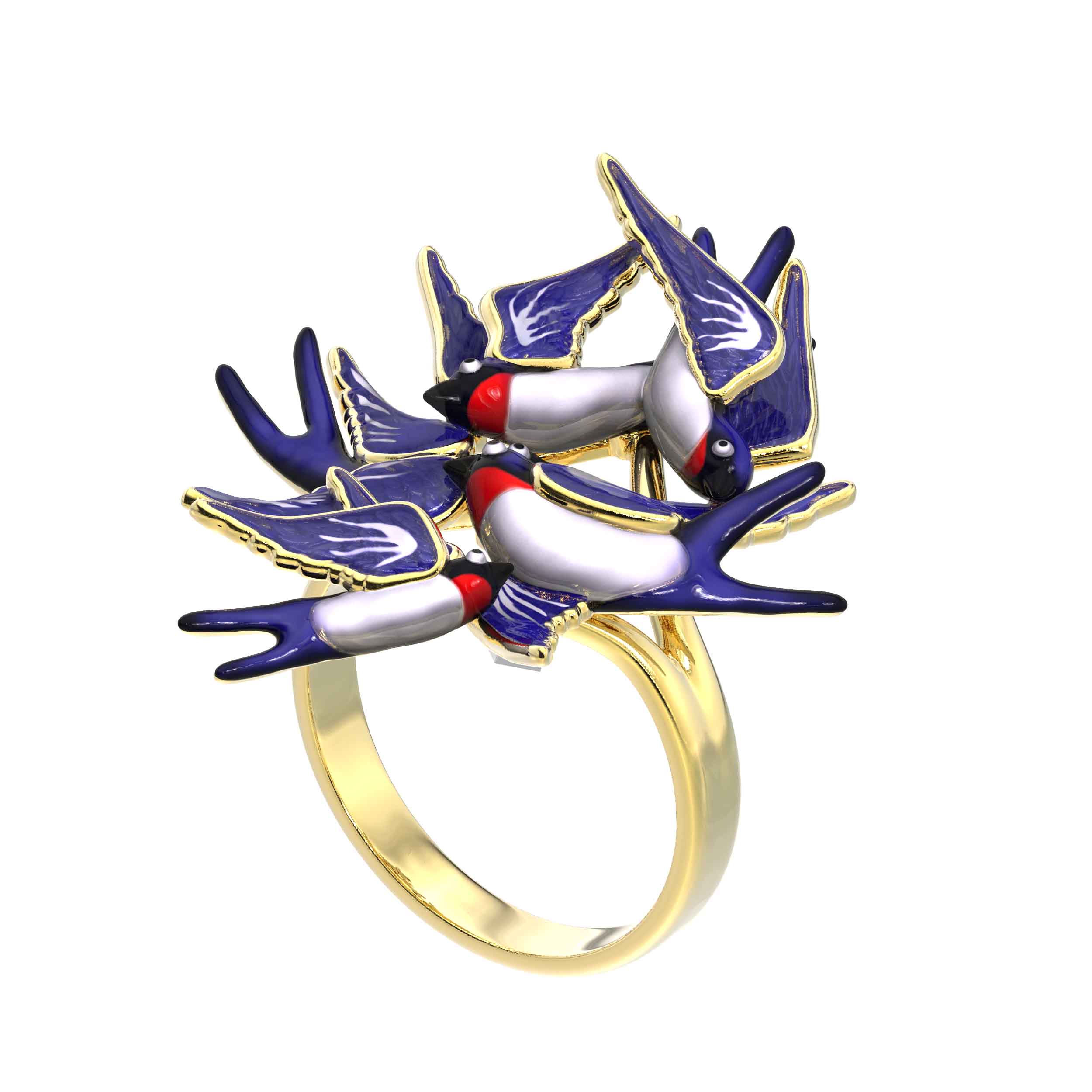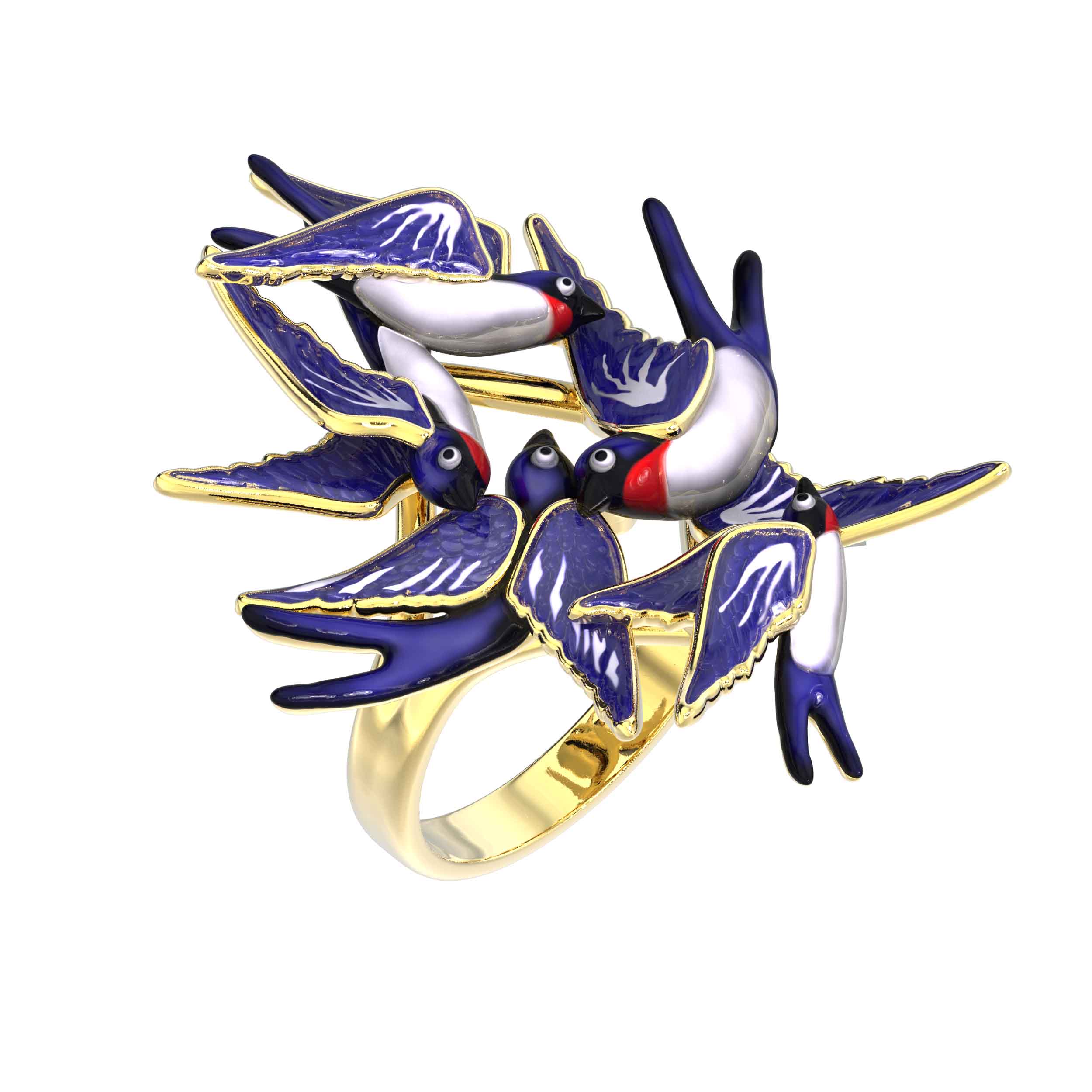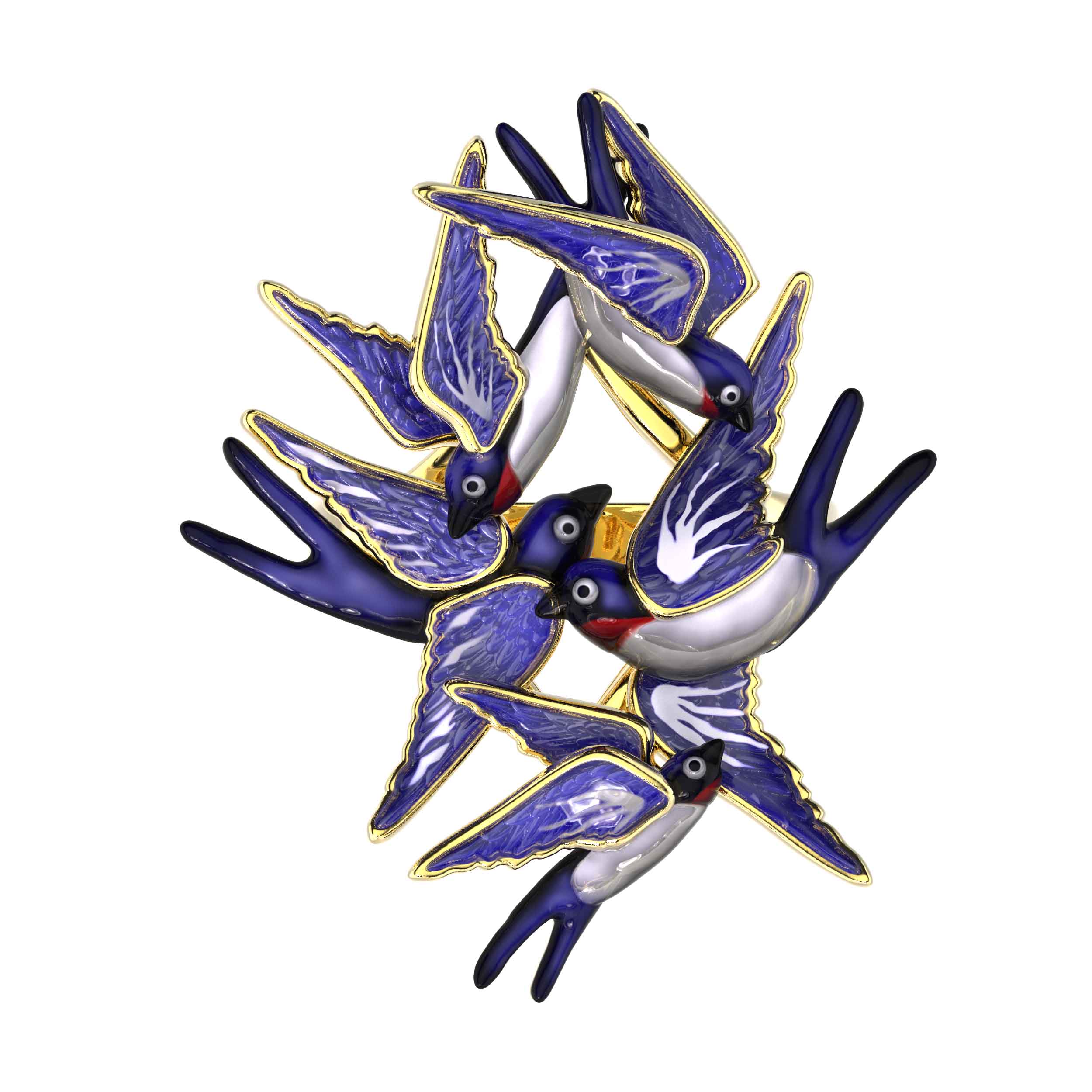 Оригинальное кольцо из лимонного золота 585 пробы — это изысканный аксессуар, который притягивает взгляд своим необычным художественным исполнением. Изделие входит в коллекцию De Luxe — Ласточки, вдохновленную грацией и свободой полета. Центральным элементом украшения стал выразительный дизайн — птицы, которые словно замерли в динамичном движении на вашей руке. Ювелиры детально проработали каждую фигурку, подчеркнув их природную красоту при помощи мастерски нанесенной разноцветной эмали.