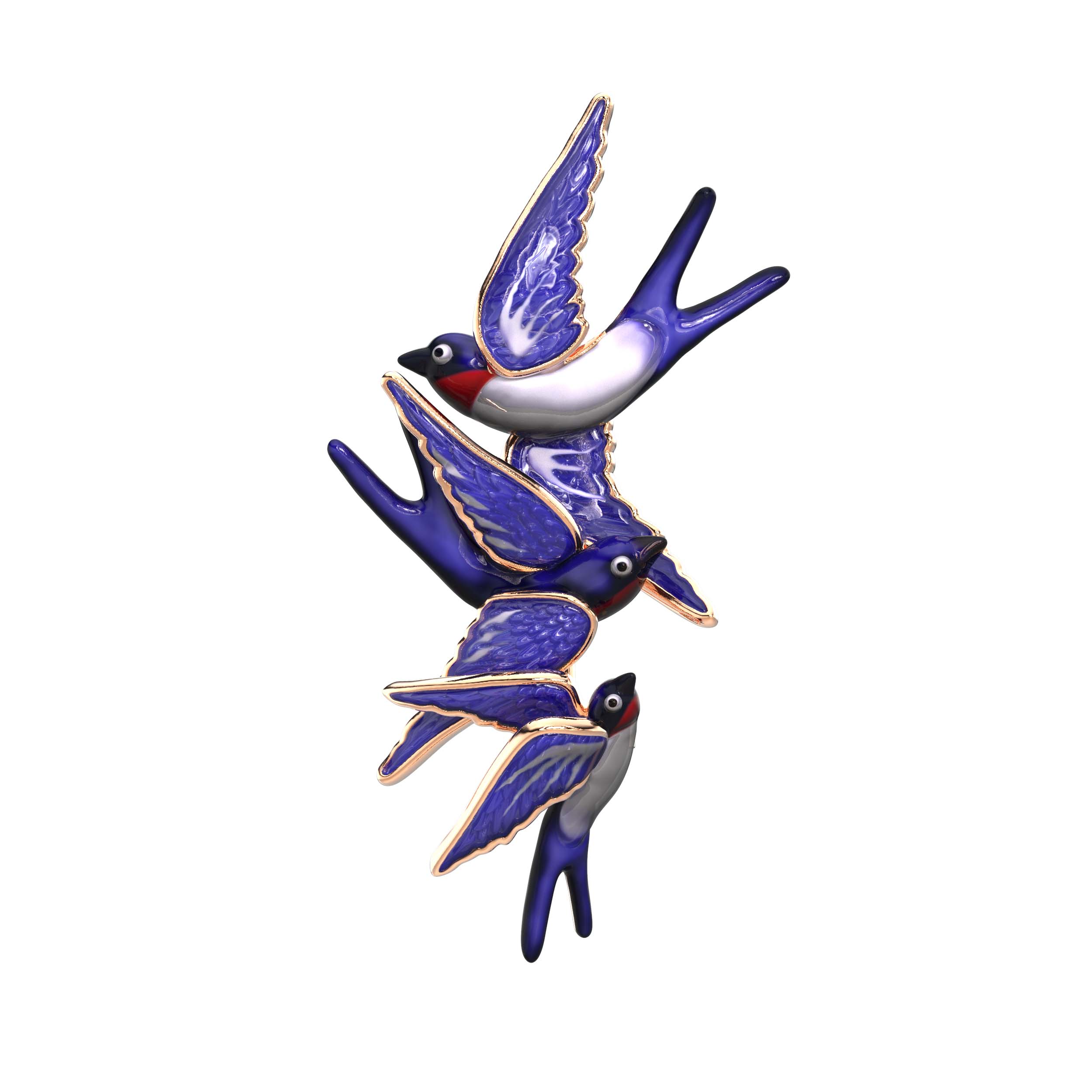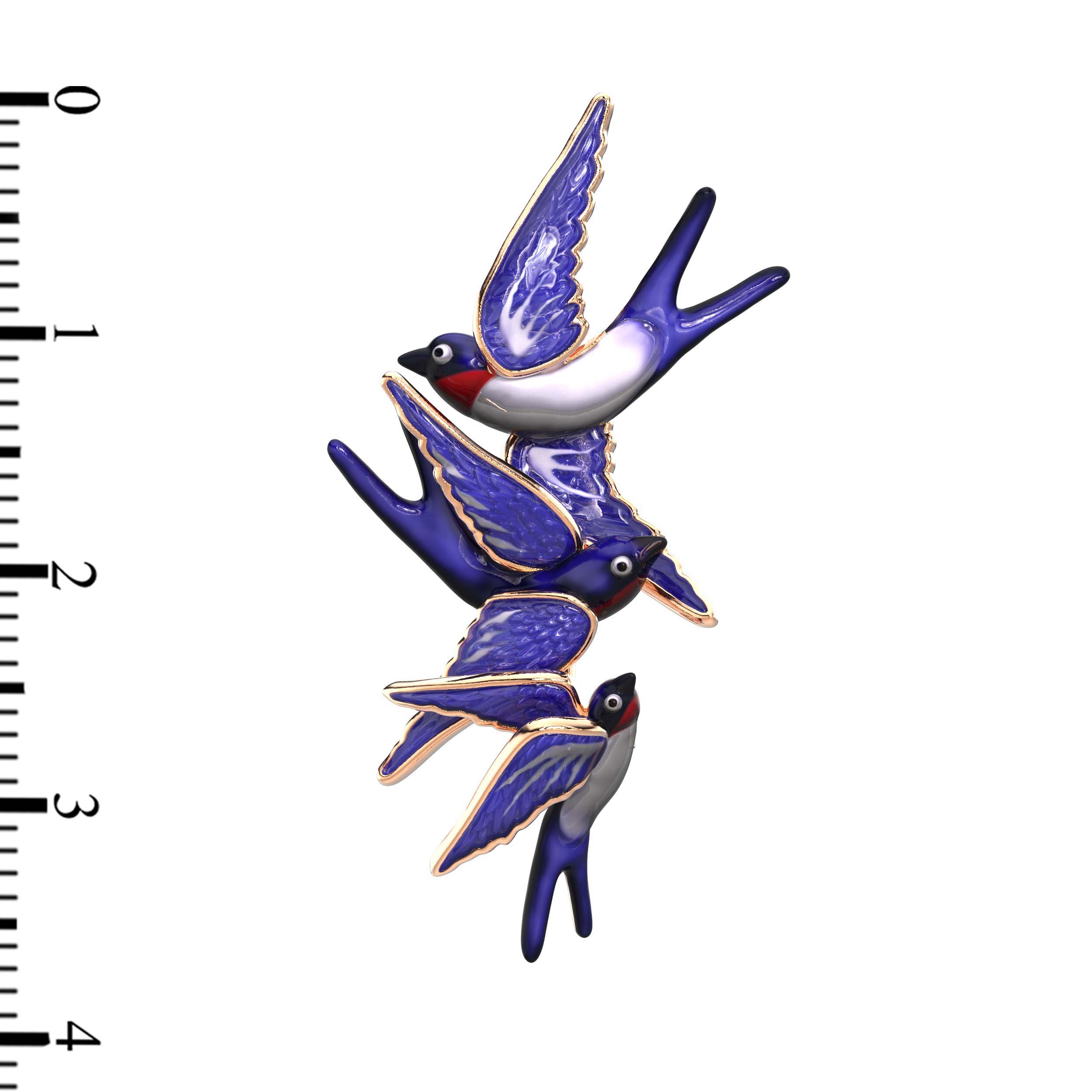 Особую художественную ценность изделию придает художественная эмаль. Разноцветные вставки наполняют брошь живыми красками, делая каждое оперение птиц выразительным и реалистичным. Насыщенные синие и белые оттенки эмали эффектно контрастируют с золотым контуром, создавая роскошный визуальный эффект.