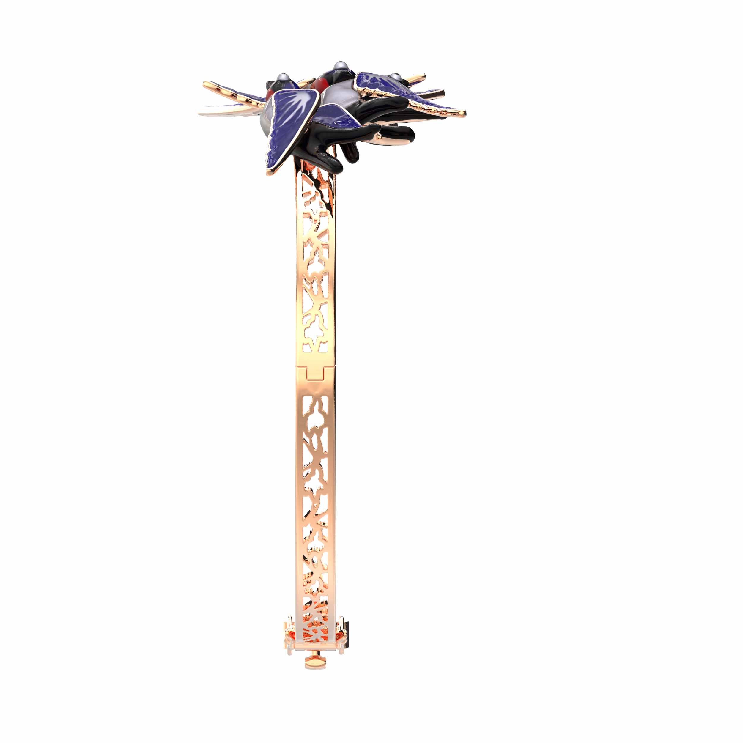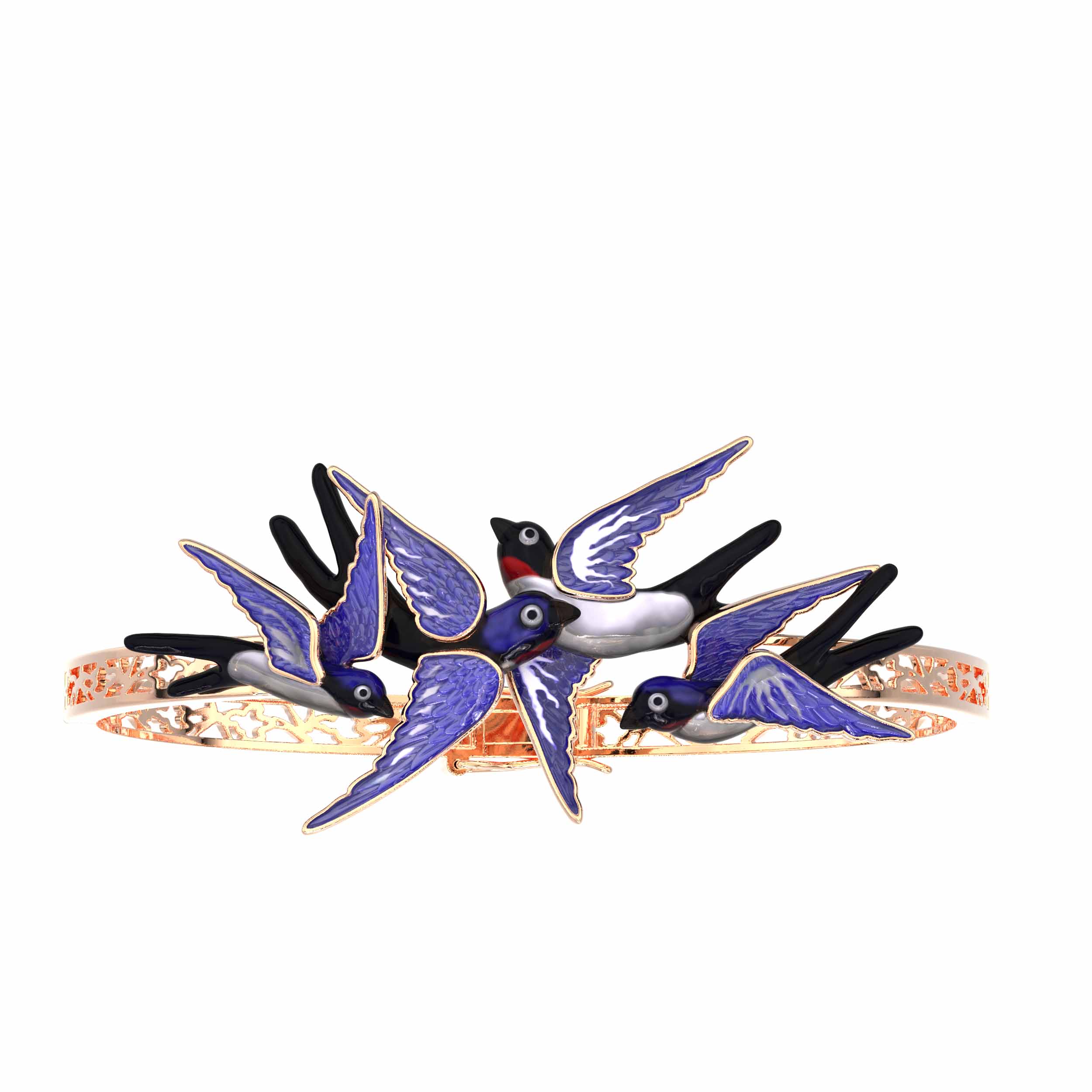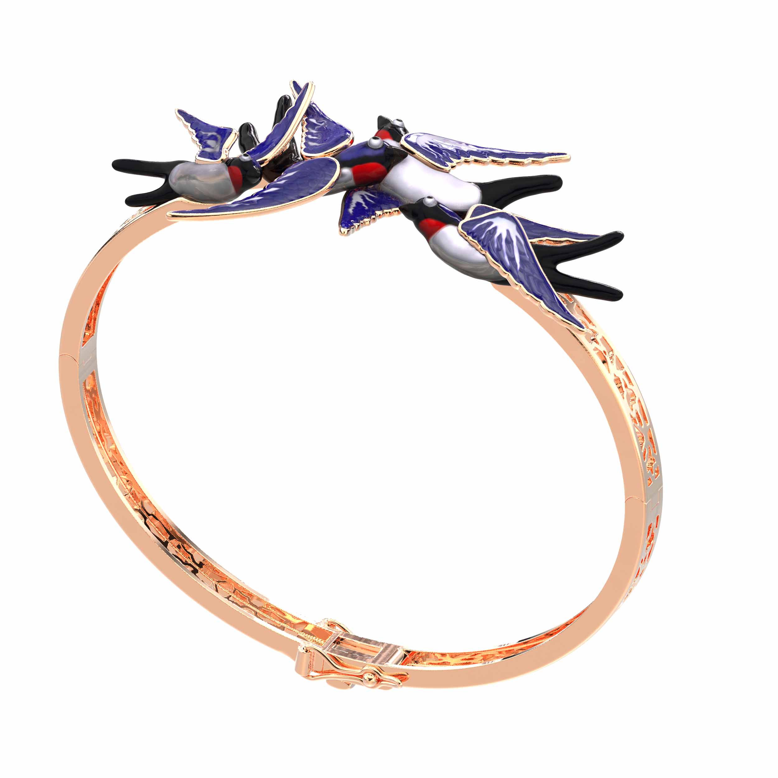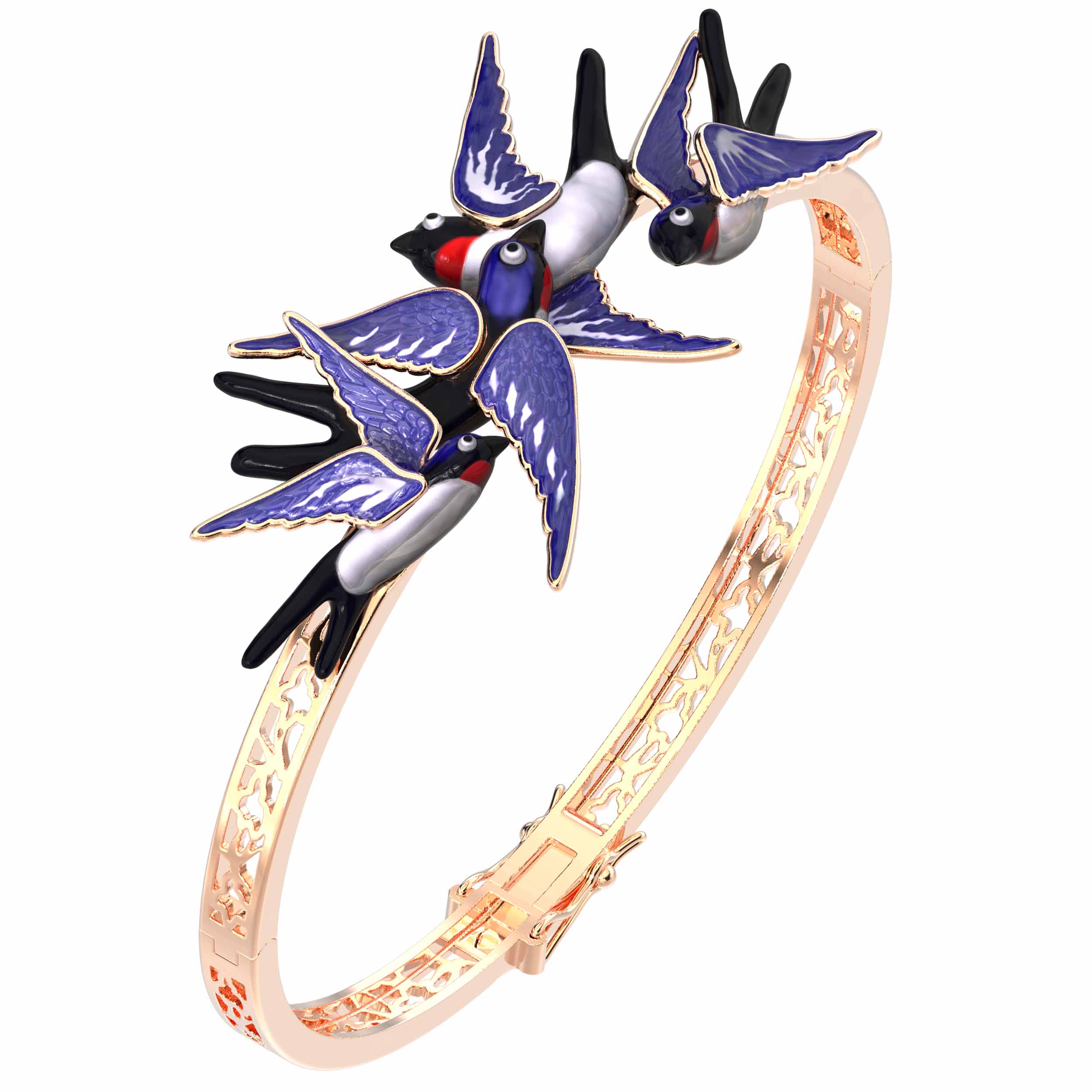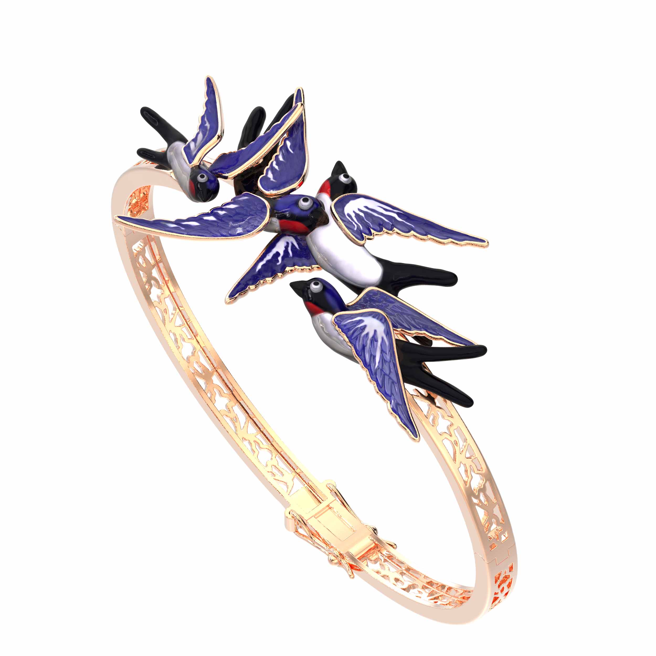 Эффектный золотой браслет из коллекции De Luxe — Ласточки станет безупречным акцентом вашего образа, подчеркивая тонкий вкус и любовь к оригинальным ювелирным решениям. Изделие выполнено из красного золота 585 пробы, что обеспечивает украшению долговечность и благородный теплый оттенок. Искусный дизайн модели обыгрывает изящную тему природы: центральным элементом декора стали мастерски проработанные птицы, украшенные ювелирной эмалью. Разноцветная эмаль придает композиции живость и объем, делая этот аксессуар настоящим произведением ювелирного искусства.