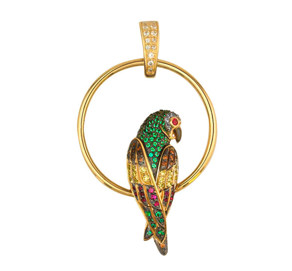 Яркая и выразительная подвеска из лимонного золота 585 пробы станет центральным акцентом вашего образа. Дизайн украшения, вдохновленный экзотической тематикой коллекции De Luxe — Попугаи, отличается необычной формой и мастерской проработкой деталей. В центре композиции расположена фигура попугая, выполненная с ювелирной точностью, которая гармонично вписана в лаконичный золотой круг.