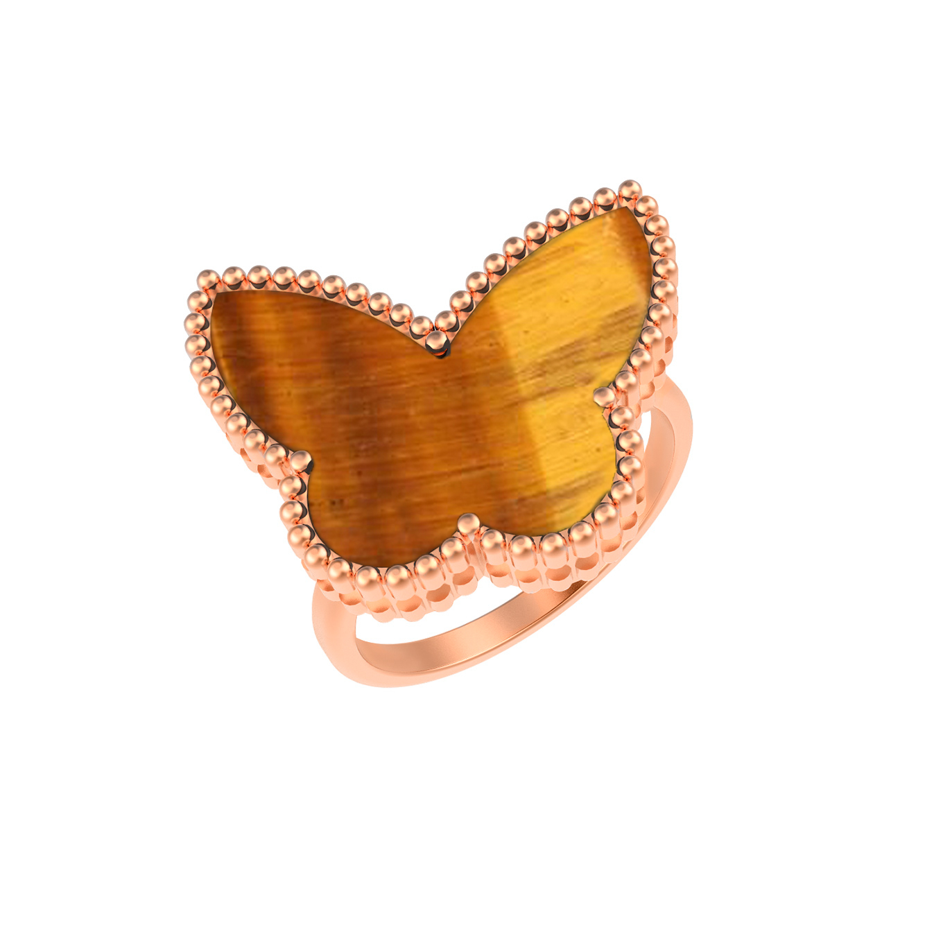Элегантное кольцо из красного золота 585 пробы станет утонченным дополнением вашего образа. Это украшение входит в изысканную коллекцию De Luxe — Бабочки и привлекает внимание своим оригинальным дизайном в форме бабочки. Центральным элементом композиции является вставка из натурального тигрового глаза с глубоким оранжевым цветом, который красиво играет на свету, подчеркивая благородный блеск металла.