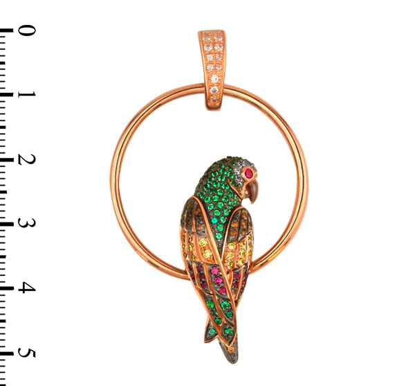 Особую художественную ценность изделию придает россыпь вставок. Ювелиры использовали 187 фианитов круглой формы, которые создают неповторимую игру света на поверхности украшения. Вставки красного и других ярких оттенков подчеркивают детализацию оперения птицы, создавая динамичный цветовой переход. Золотая основа изделия выполнена в теплом красном оттенке металла, который гармонично сочетается с блеском камней. Подвеска станет не только статусным дополнением к повседневному или вечернему наряду, но и отличной идеей для подарка. Если вы планируете дополнить ювелирный гардероб, обратите внимание, что изделие входит в категорию комплектов — к нему можно подобрать гармонирующие украшения.