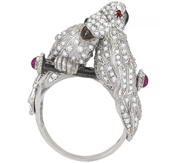 Кольцо из белого золота 585 пробы из коллекции De Luxe — Попугаи — это ювелирное произведение искусства, которое станет центральным акцентом вашего образа. Дизайн украшения, выполненный в виде пары экзотических попугаев, притягивает взгляд своей детализацией и оригинальным исполнением. Искусная работа мастеров подчеркивает статусность изделия, превращая обычный аксессуар в выразительное заявление о безупречном вкусе.
