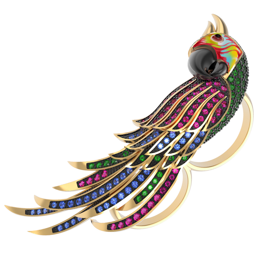 Эксклюзивное кольцо из лимонного золота 585 пробы из коллекции De Luxe — Попугаи станет ярким акцентом в вашем образе. Это ювелирное изделие воплощает в себе смелый дизайн и безупречное исполнение. Центральным элементом украшения является искусное изображение попугая, выполненное с использованием эффектной эмали красного цвета, которая придает образу живость и выразительность.