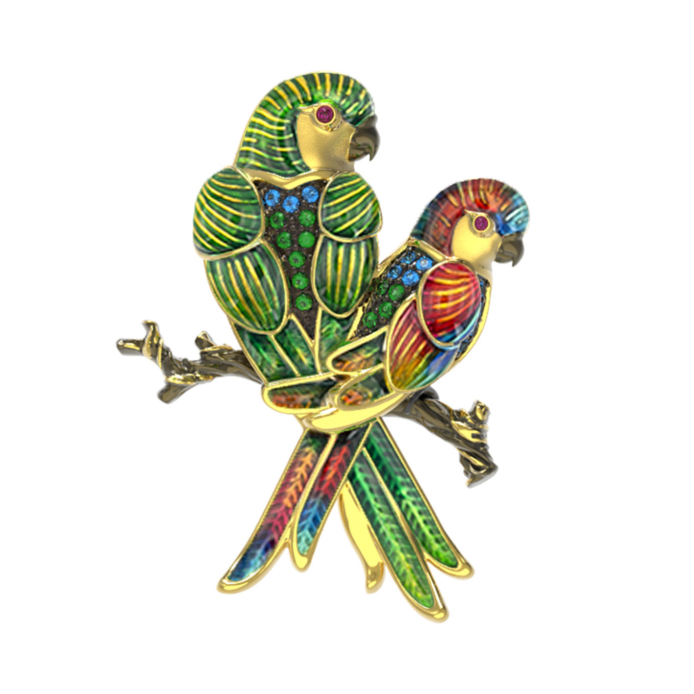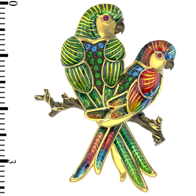 Яркая и выразительная брошь из лимонного золота 585 пробы станет центральным акцентом вашего образа. Дизайн украшения, вдохновленный экзотической красотой тропических птиц, переносит нас в мир красок и природной грации. Мастера ювелирного дела объединили благородный драгоценный металл с искусной работой по эмали, создавая детализированный и живой облик грациозных попугаев, сидящих на ветке. Это изделие, представленное в коллекции De Luxe — Попугаи, притягивает взгляд своей динамикой и безупречным художественным исполнением.