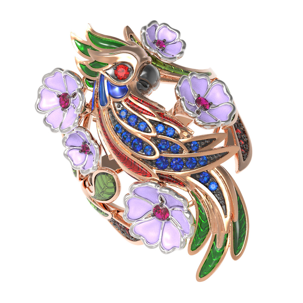Представляем вашему вниманию эксклюзивное кольцо из коллекции De Luxe — Попугаи, которое станет ярким акцентом в вашем образе. Это ювелирное изделие выполнено из красного золота 585 пробы, что подчеркивает благородство металла и придает украшению теплый, насыщенный оттенок. Дизайн изделия вдохновлен природными мотивами: искусная работа с эмалью создает живые переливы цвета, превращая кольцо в настоящее произведение искусства.