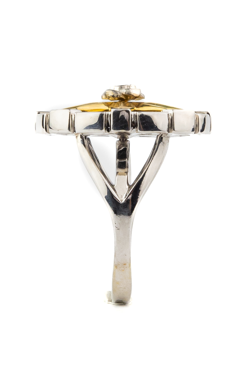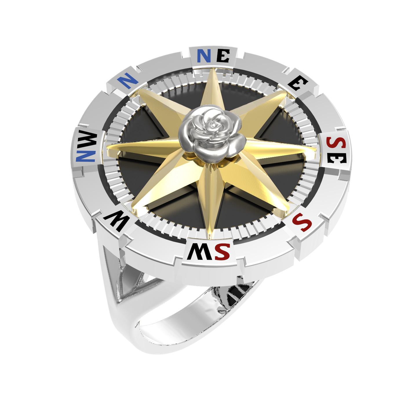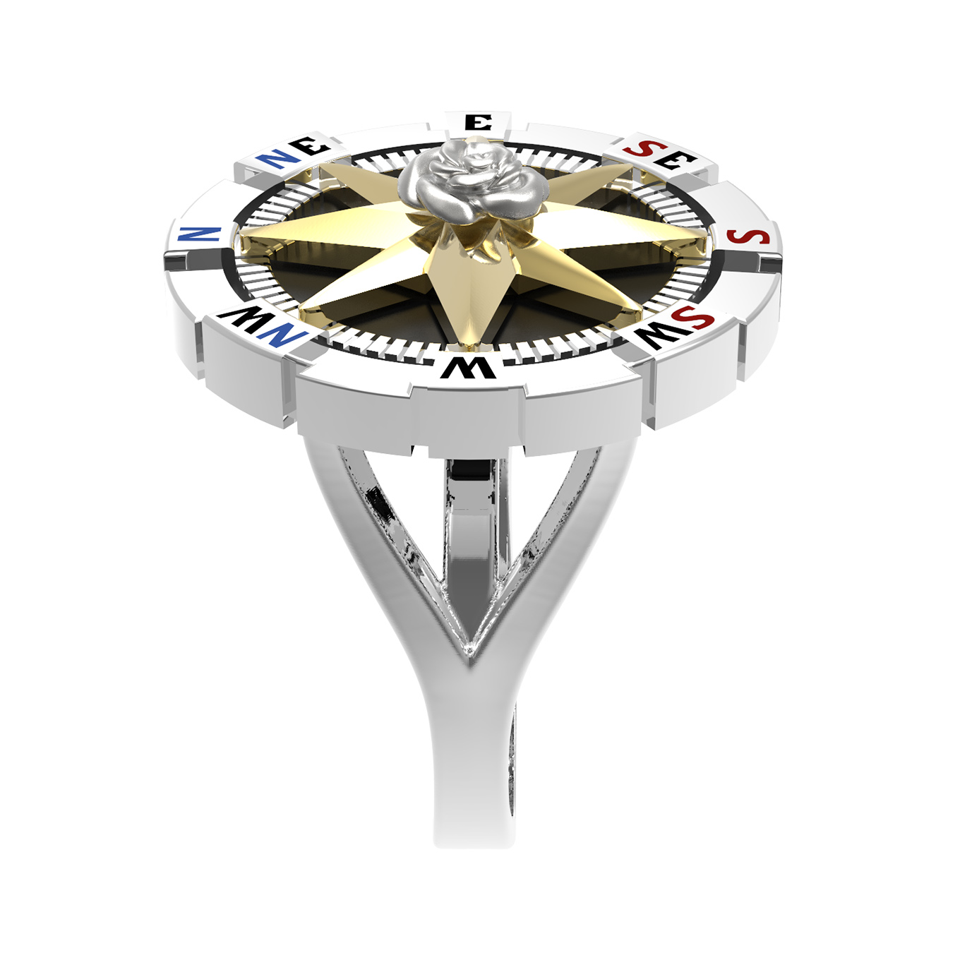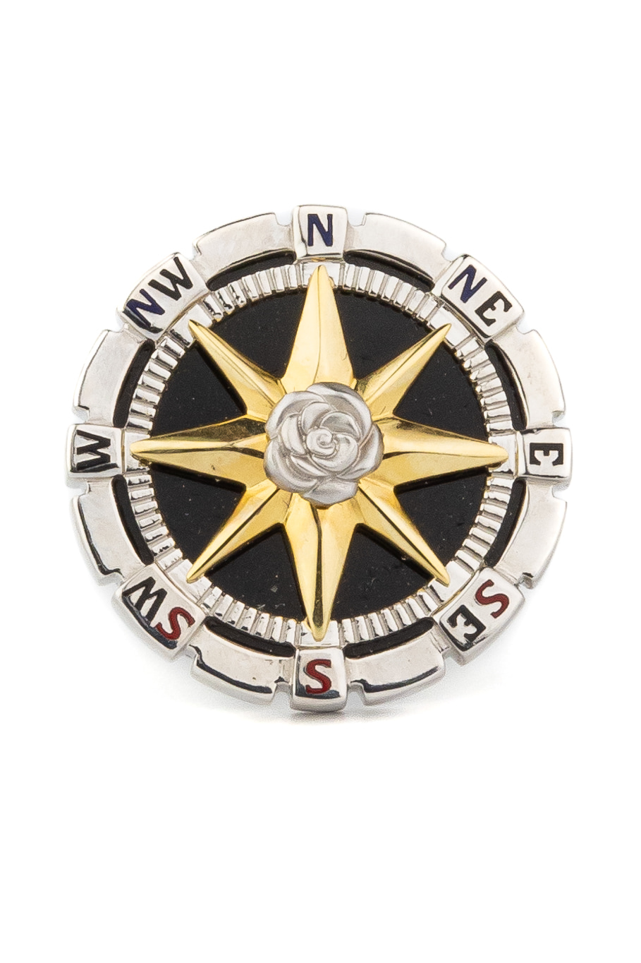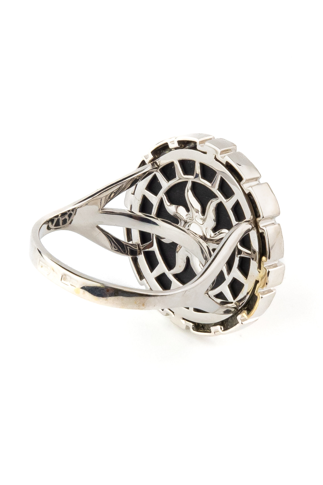 Внешний вид кольца напоминает стилизованный компас или розу ветров, где круглая форма вставки гармонично сочетается с геометрическими линиями. Это универсальное изделие подходит как для женщин, так и для мужчин, подчеркивая индивидуальность и вкус владельца. Ювелирная композиция выглядит выразительно и статусно, позволяя использовать украшение как самостоятельный аксессуар или в сочетании с другими изделиями в качестве комплекта.