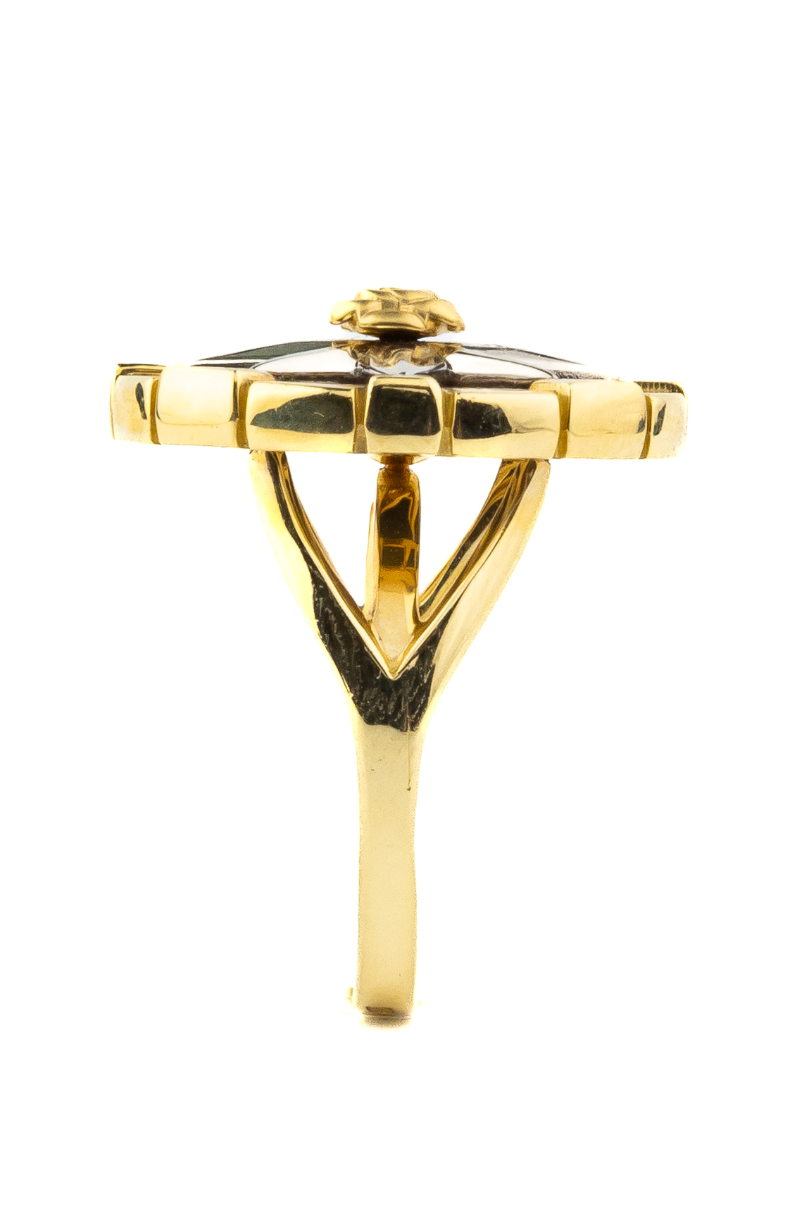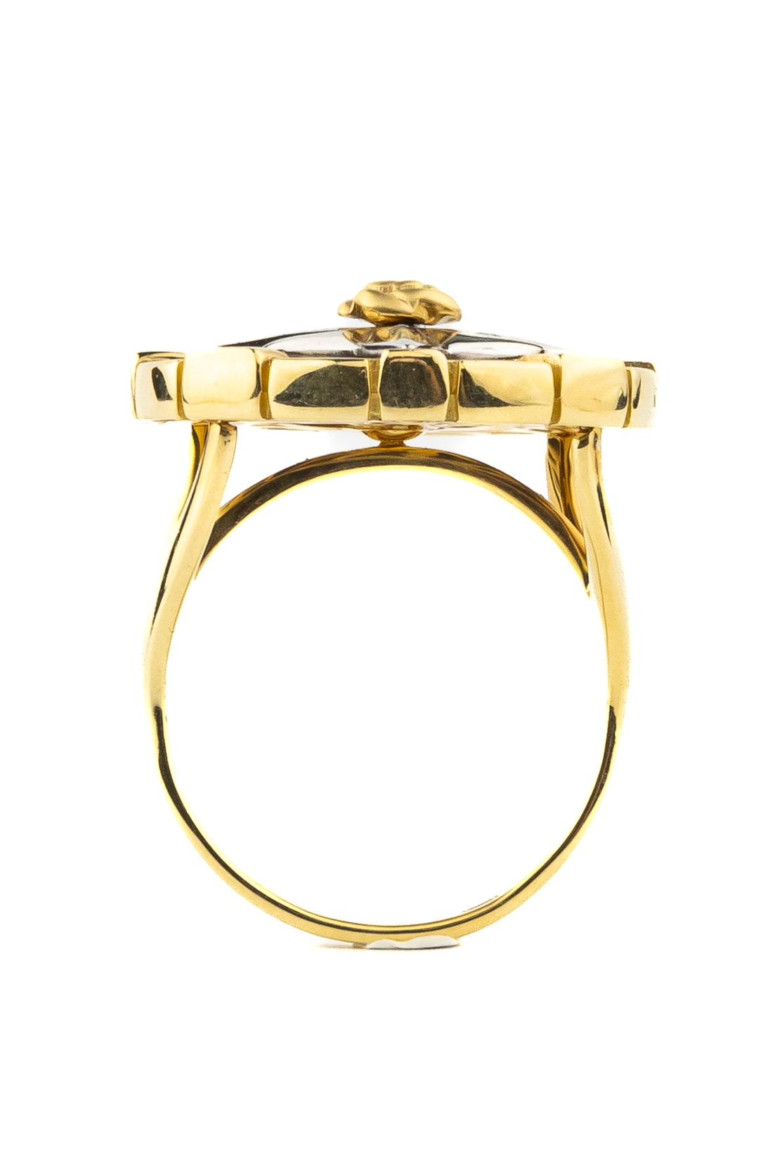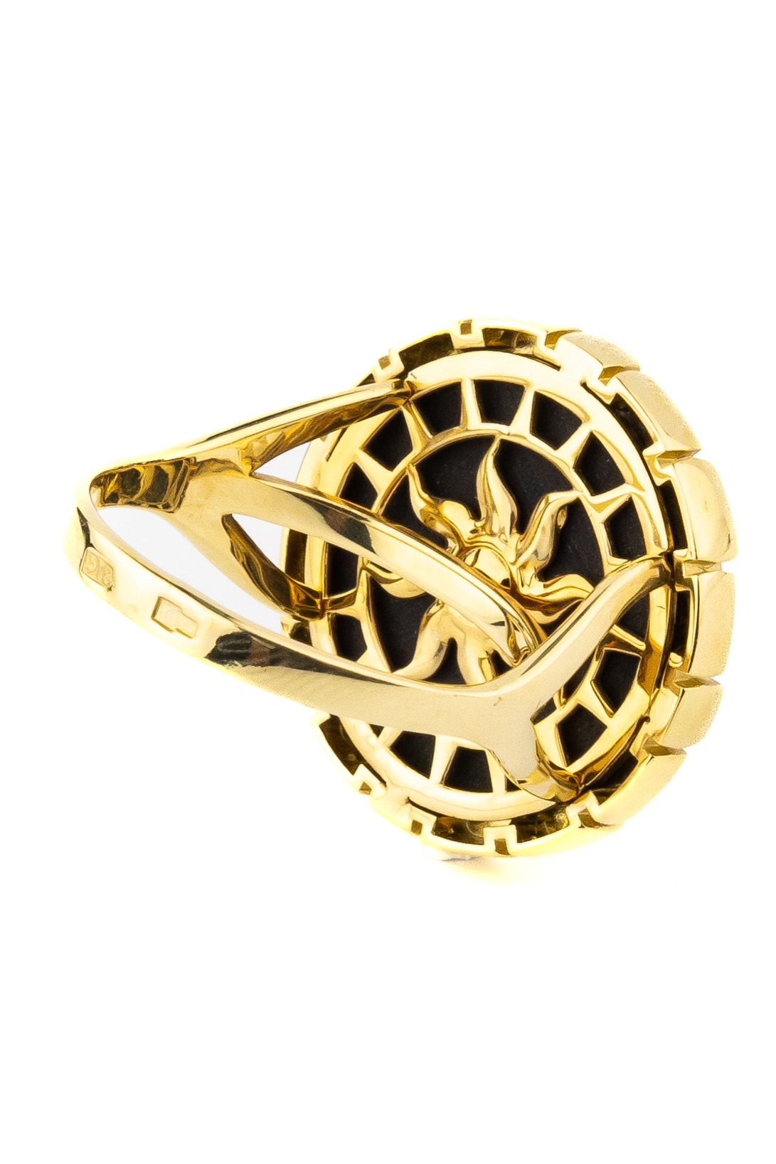 Для создания этого кольца использован благородный металл лимонного оттенка, который эффектно контрастирует с глубоким черным цветом вставки из оникса круглой формы. Акценты в виде цветной эмали делают дизайн более динамичным и современным. Такое сочетание материалов и цветов позволяет украшению выглядеть статусно и притягательно.