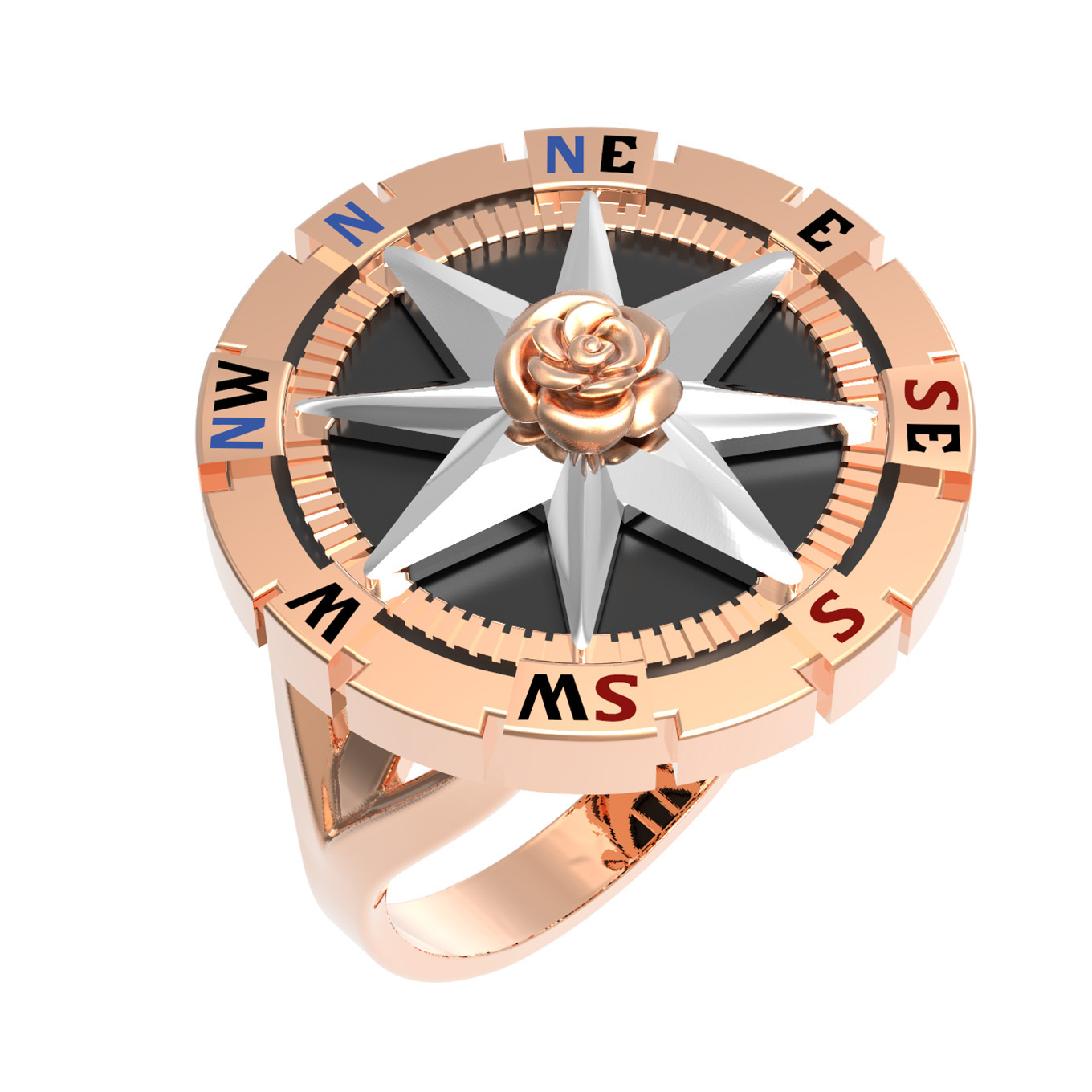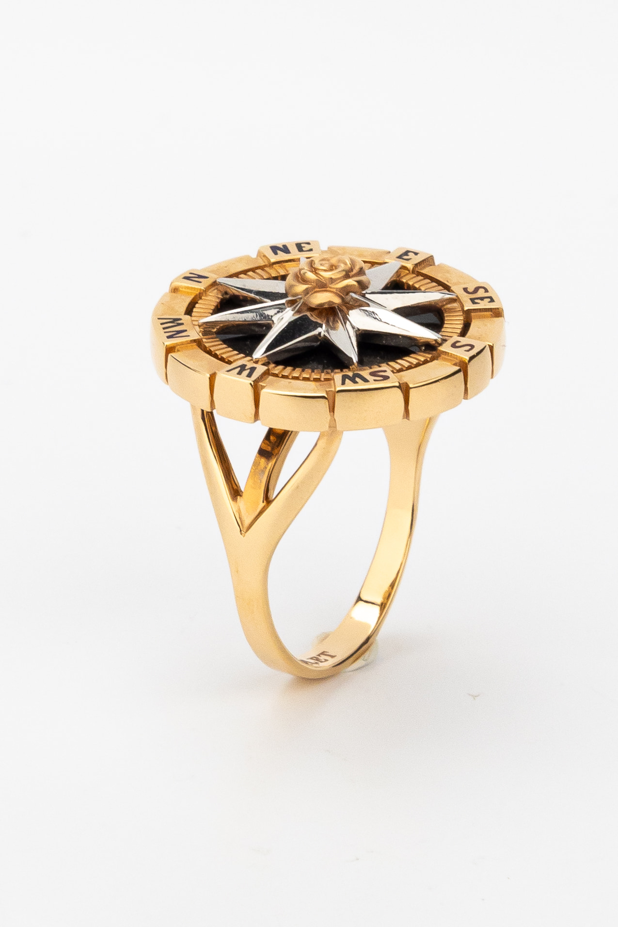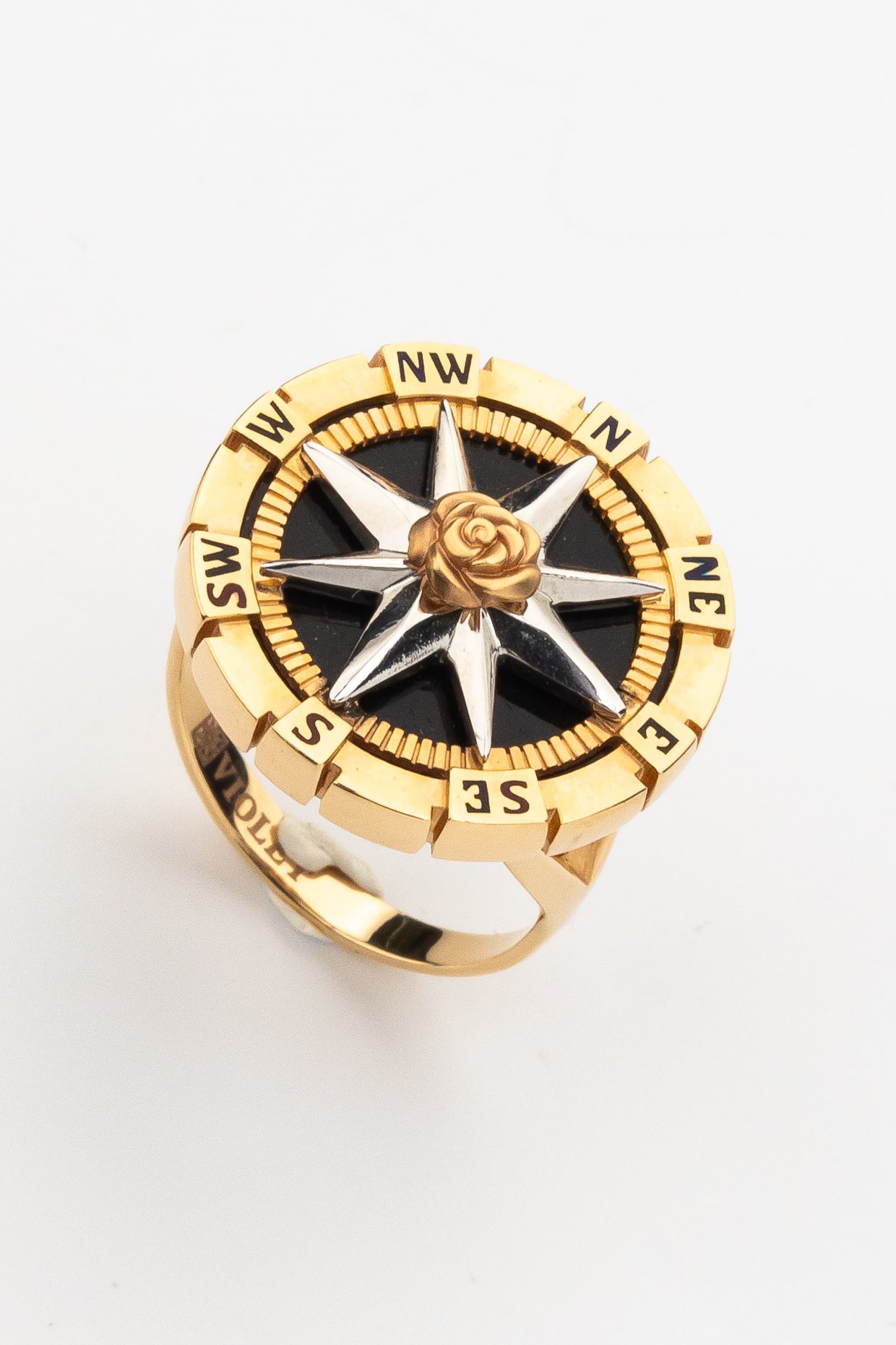 Дизайн кольца вдохновлен эстетикой морских путешествий и символикой розы ветров, что придает украшению глубокий смысл. Вставки из черного оникса круглой формы создают выразительный фон, подчеркивающий благородный блеск красного золота, а использование разноцветной эмали добавляет динамичные акценты. Данная модель универсальна в ношении и подходит как для женщин, так и для мужчин, подчеркивая индивидуальный стиль владельца.