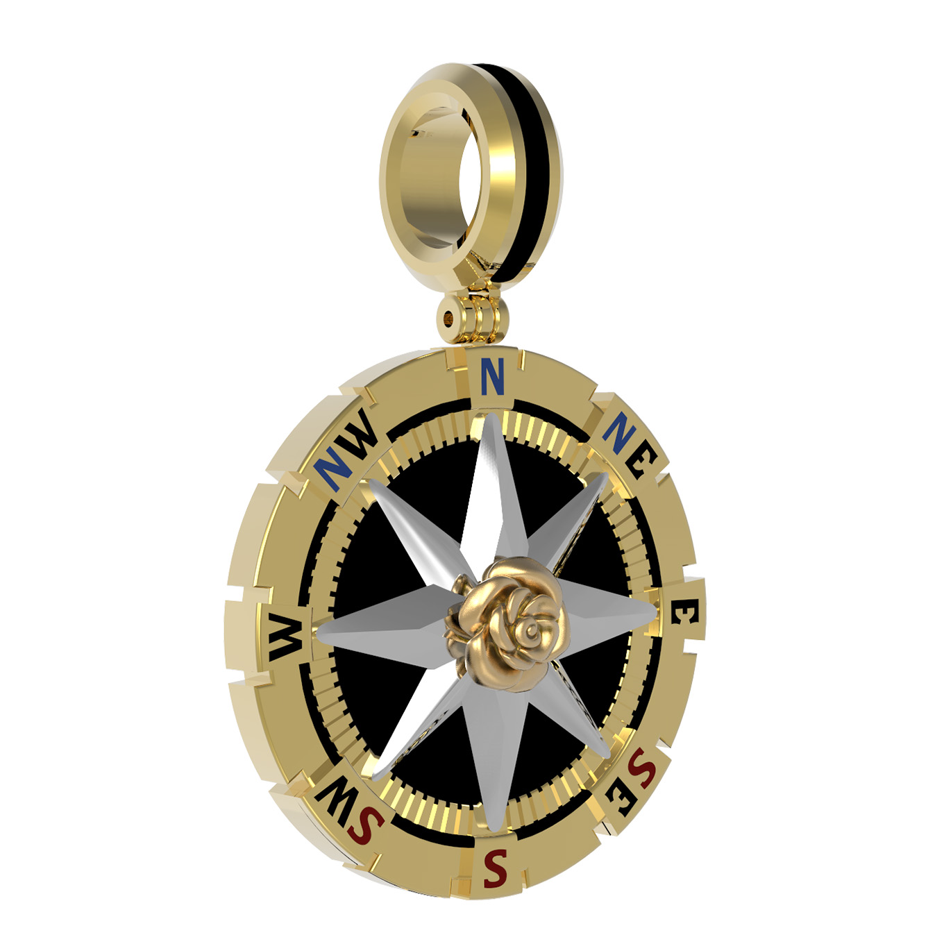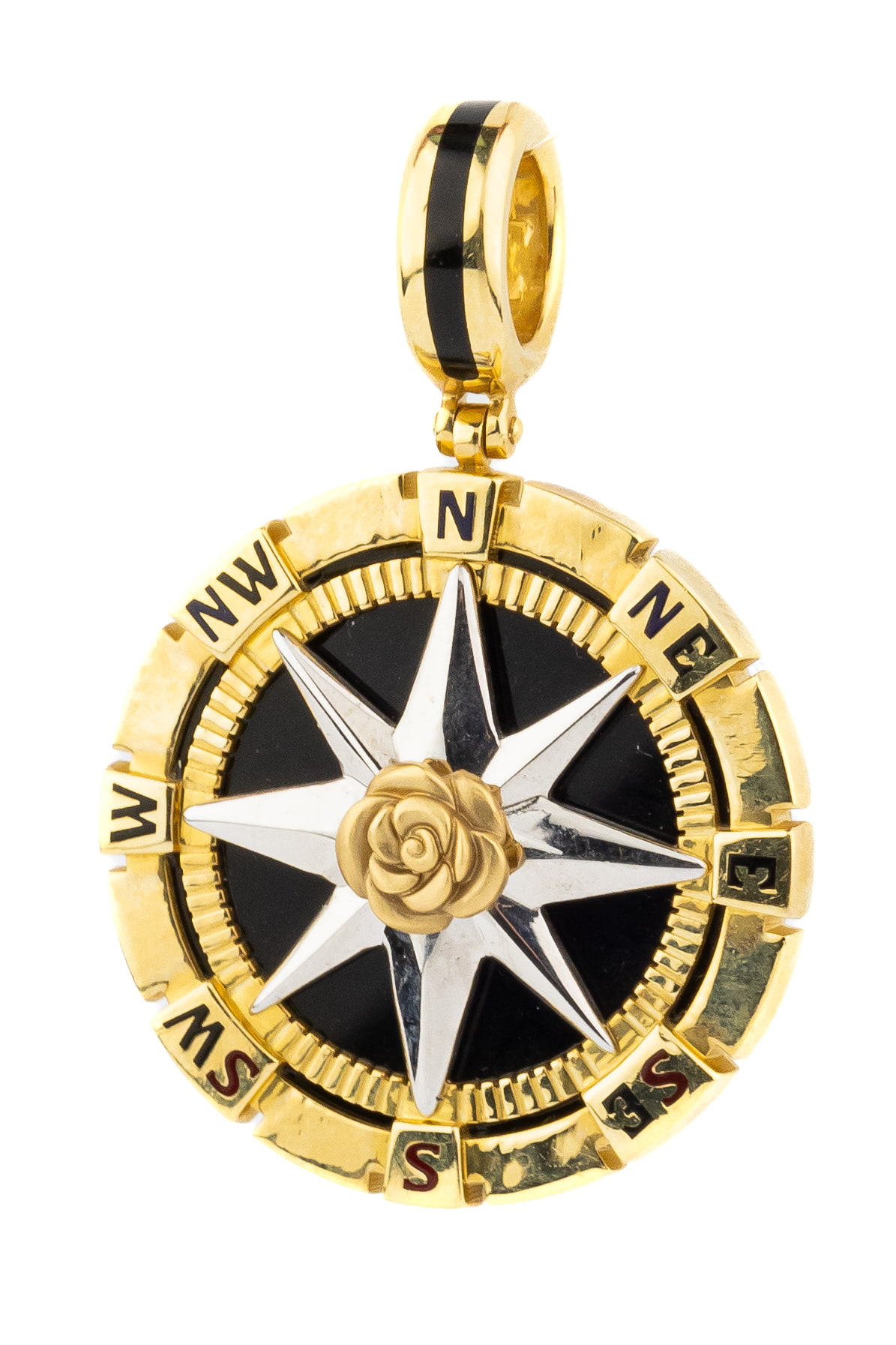 Особую выразительность аксессуару придает контрастное сочетание материалов. В основе декора лежит благородный черный оникс круглой формы, который эффектно гармонирует с ярким лимонным оттенком золота. Детализация выполнена с использованием цветной эмали, подчеркивающей стороны света, что придает украшению динамичный и современный вид. В центре композиции расположена одна вставка, акцентирующая внимание на мастерстве исполнения.