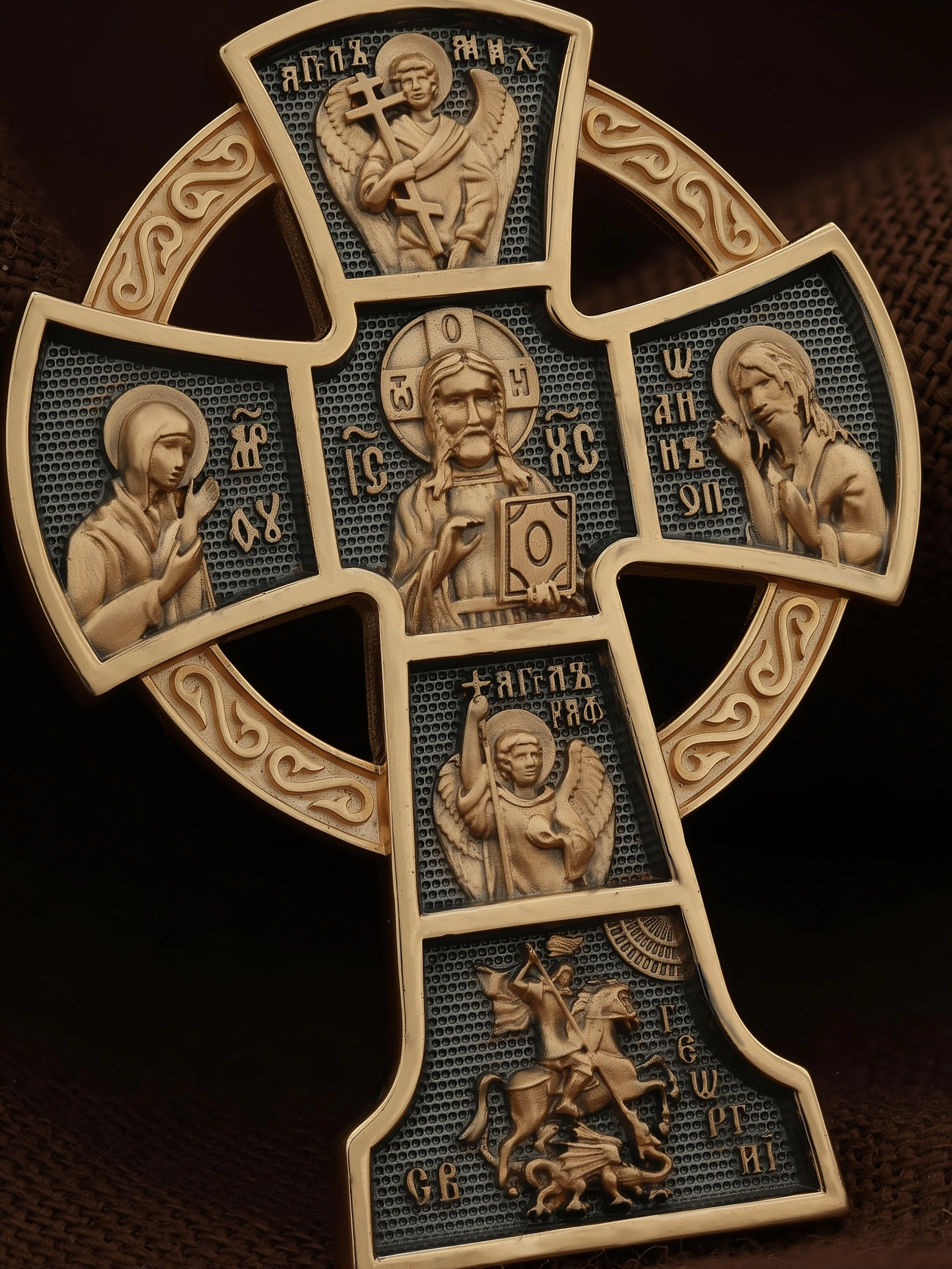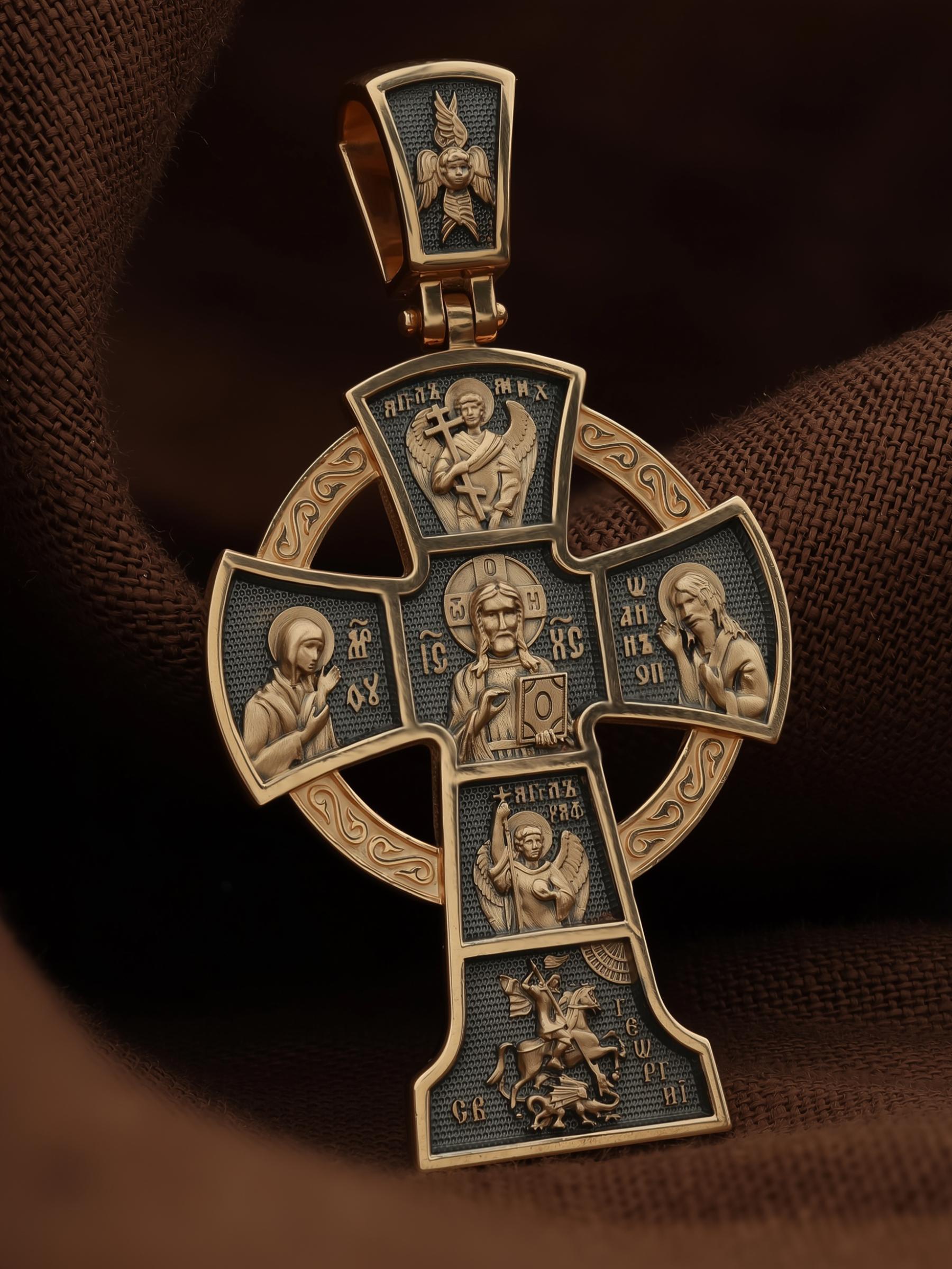 Вверху и внизу от спасителя предстоят два архангела, Михаил (Первый служитель Божественной славы, страж и защитник) и Гавриил (служитель Божественной крепости и изъявитель сокровенных Божьих тайн). Внизу помещен образ свт. Георгия Победоносца. Святой при жизни прославился не только как храбрый воин и твердый исповедник веры, но и как сострадательный, милосердный целитель и чудотворец. Святому молятся о покровительстве воинам и армии, о защите государства, сохранении и спасения России.