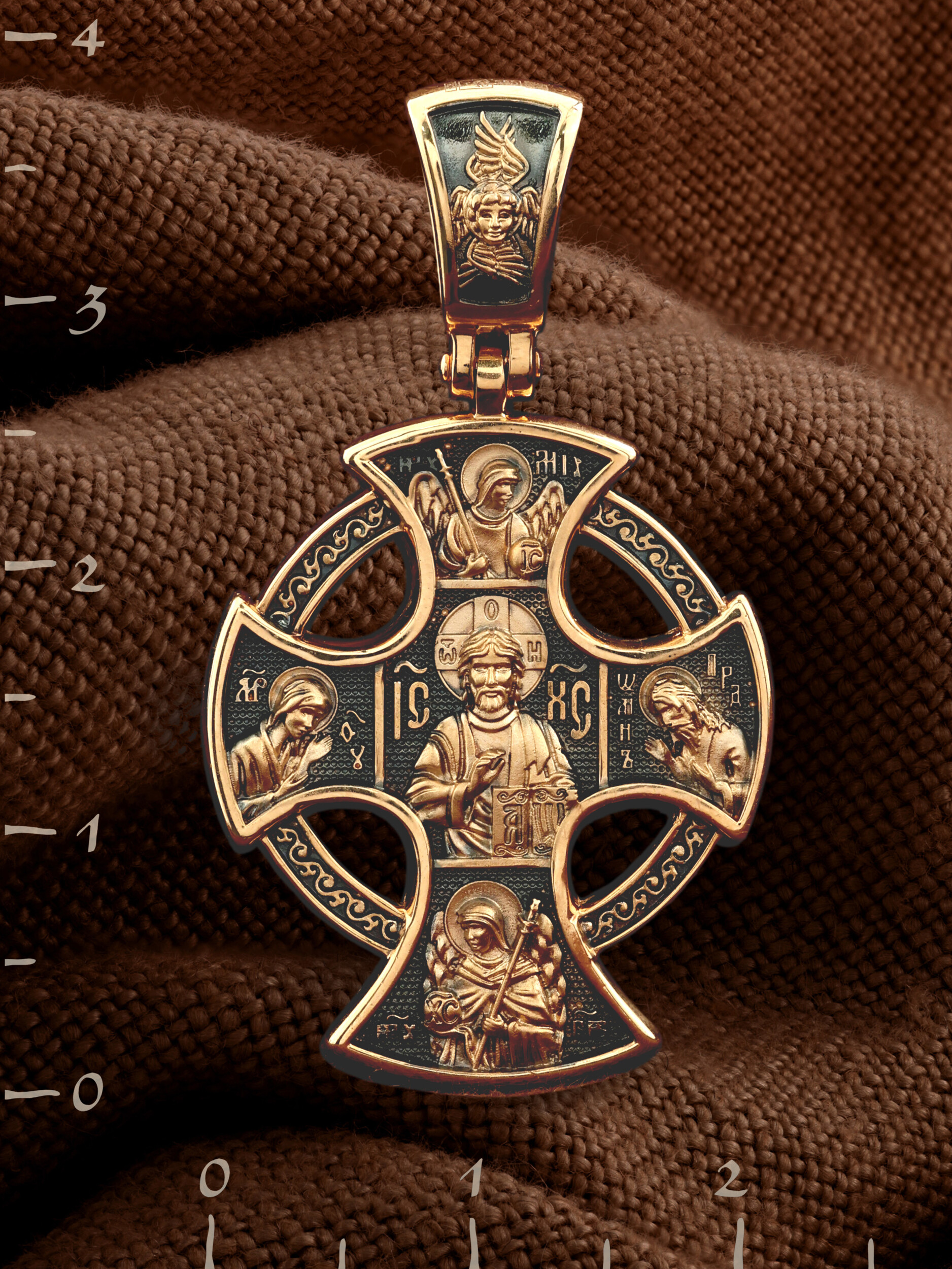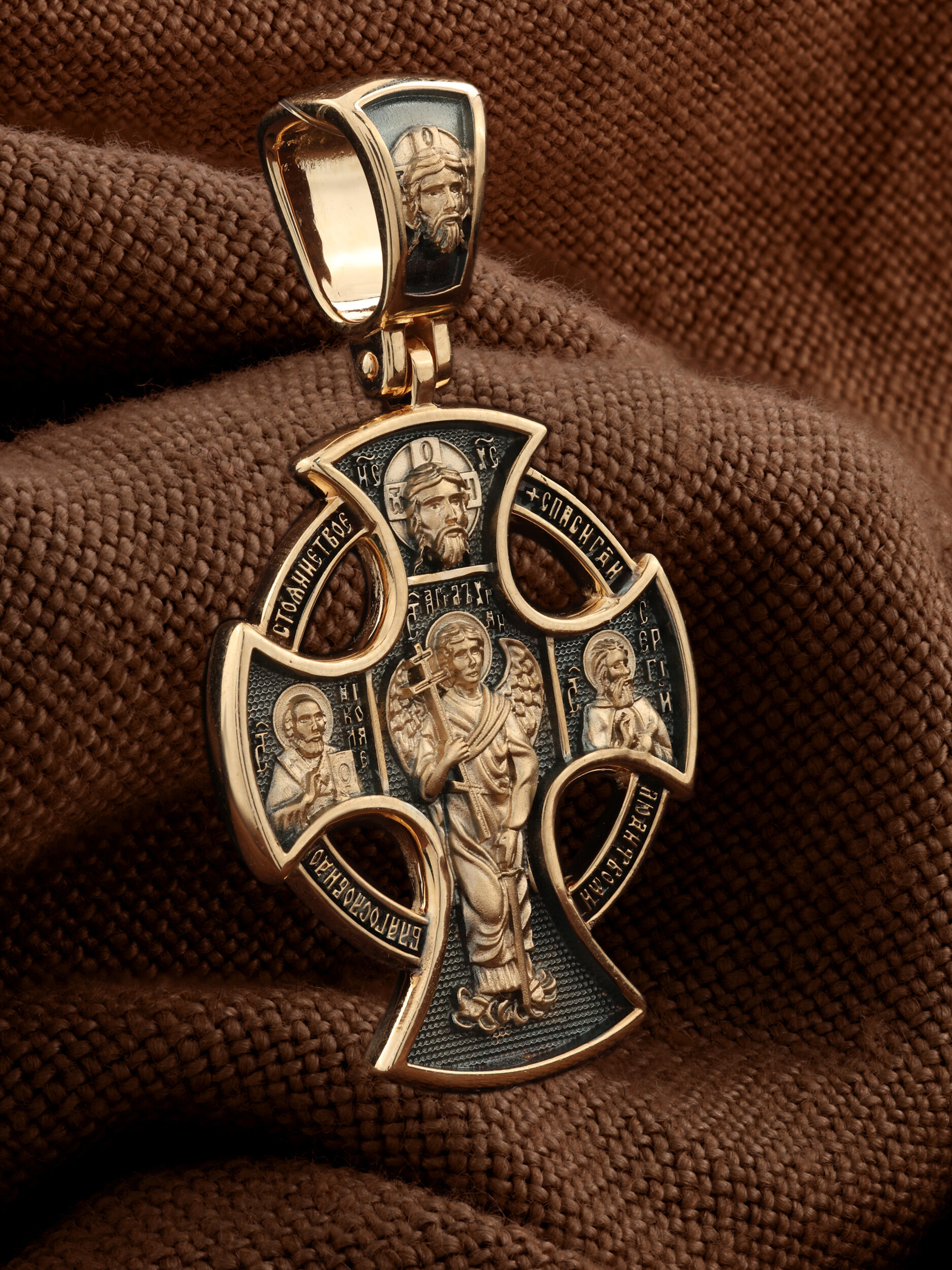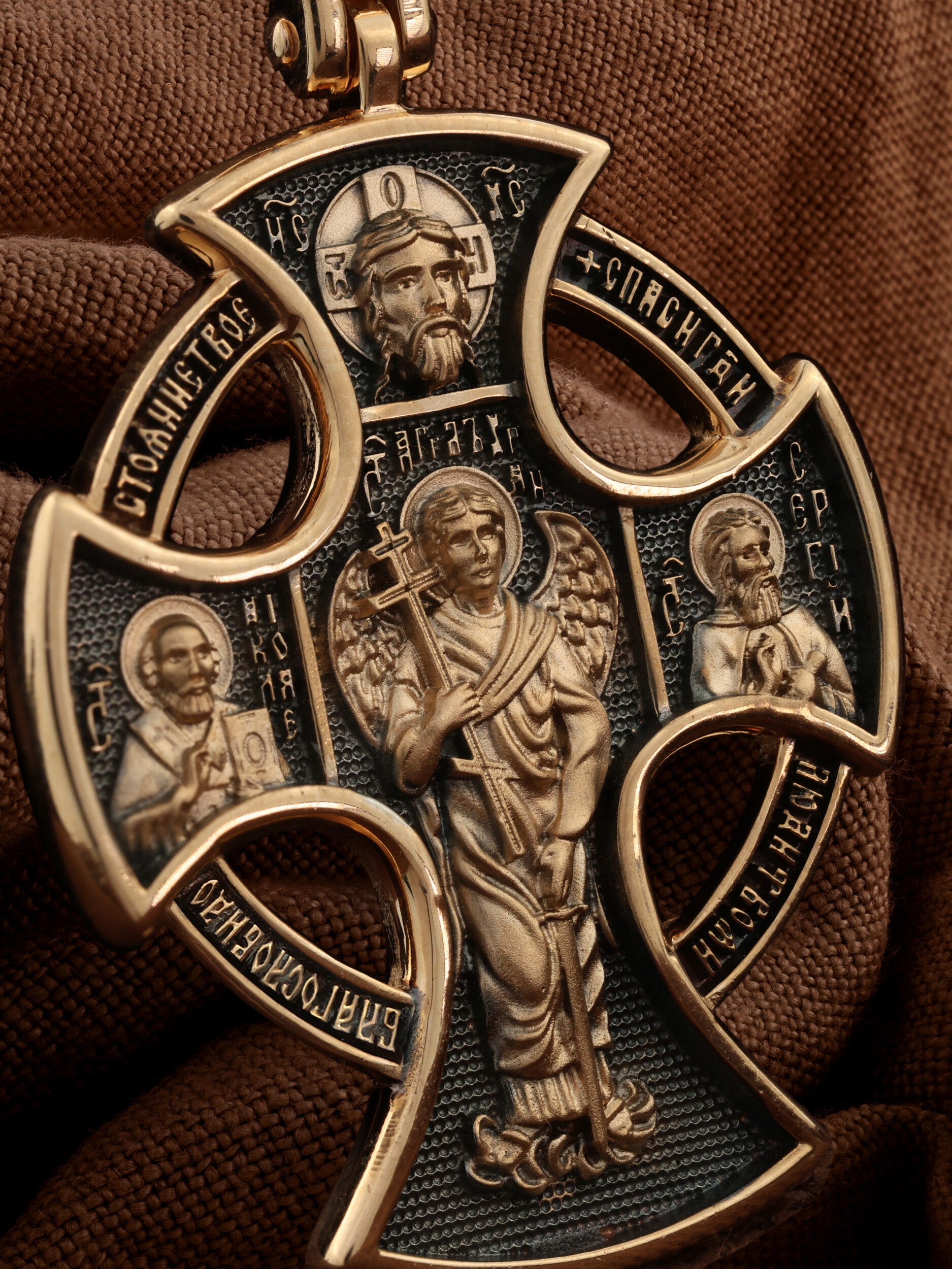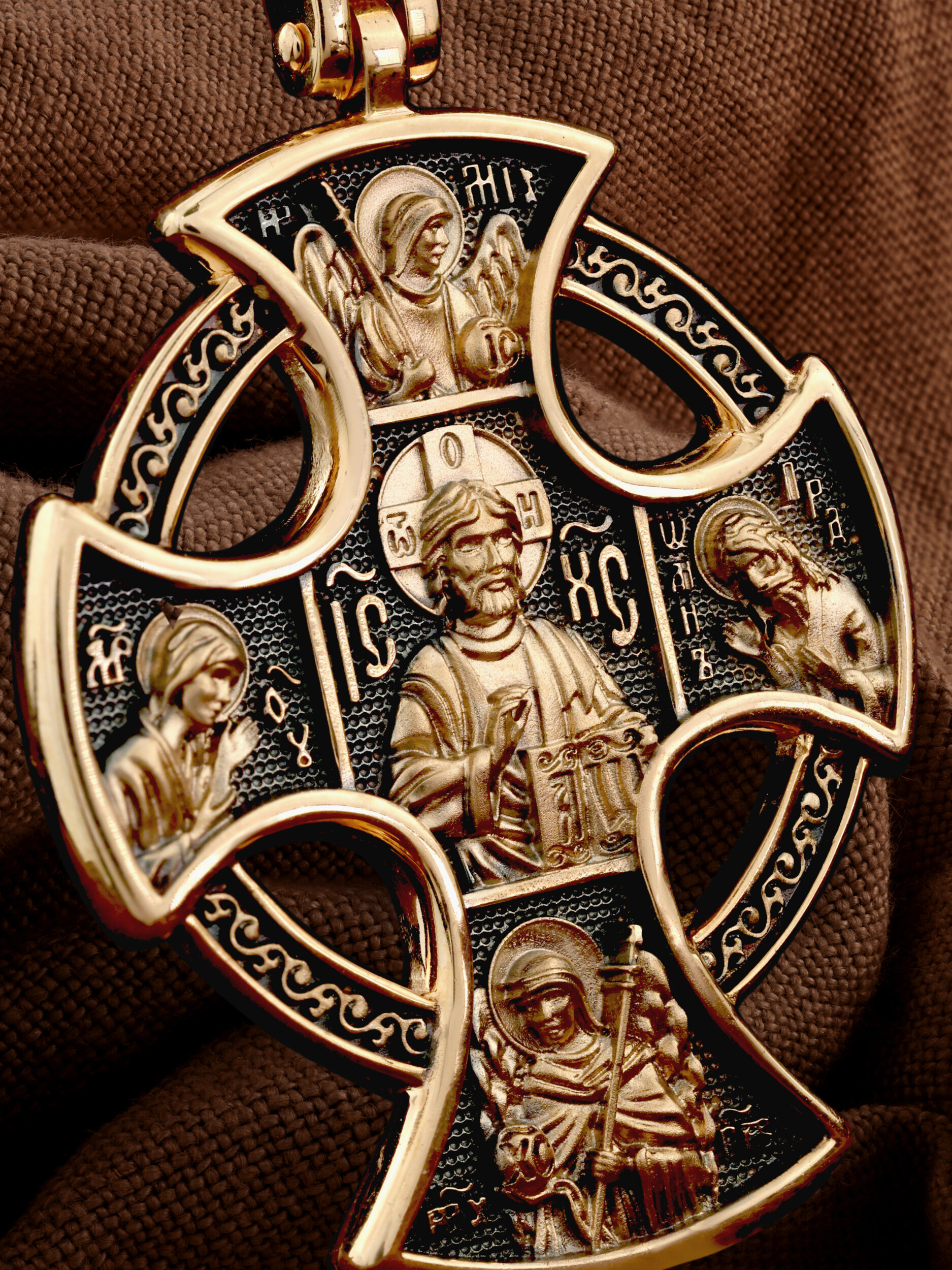 В центре лицевой стороны изображена ипостась Сына Божьего в окружении Пресвятой Богородицы и св. пророка и Предтечи Господня Иоанна Крестителя, которые имеют особое дерзновение перед Богом молиться за всех людей. Над образом Иисуса Христа изображен архангел Михаил, в нижней части креста — архангел Гавриил. В руках у Иисуса Христа находится Новый Завет. В кулонное кольцо помещено изображение Спаса Нерукотворного, образ Спасителя, который Он запечатлел на плате и передал для исцеления больному проказой царю Эдессы.