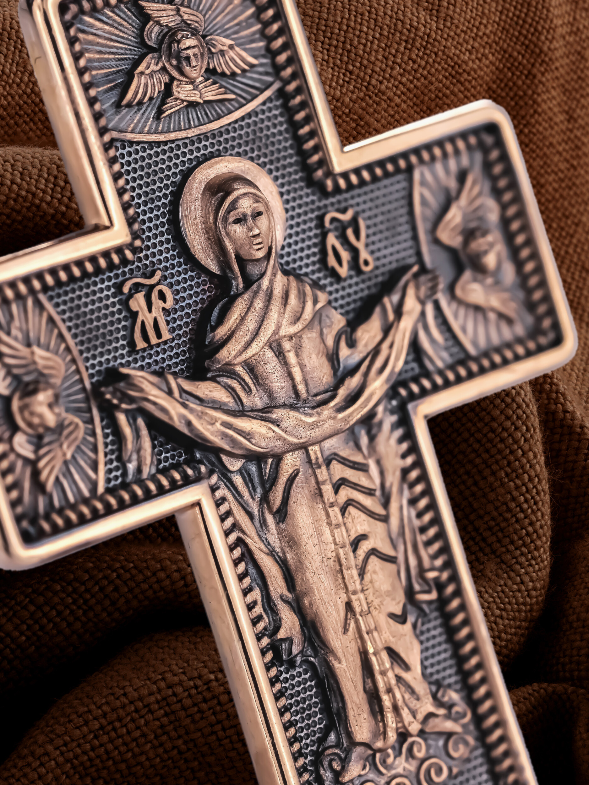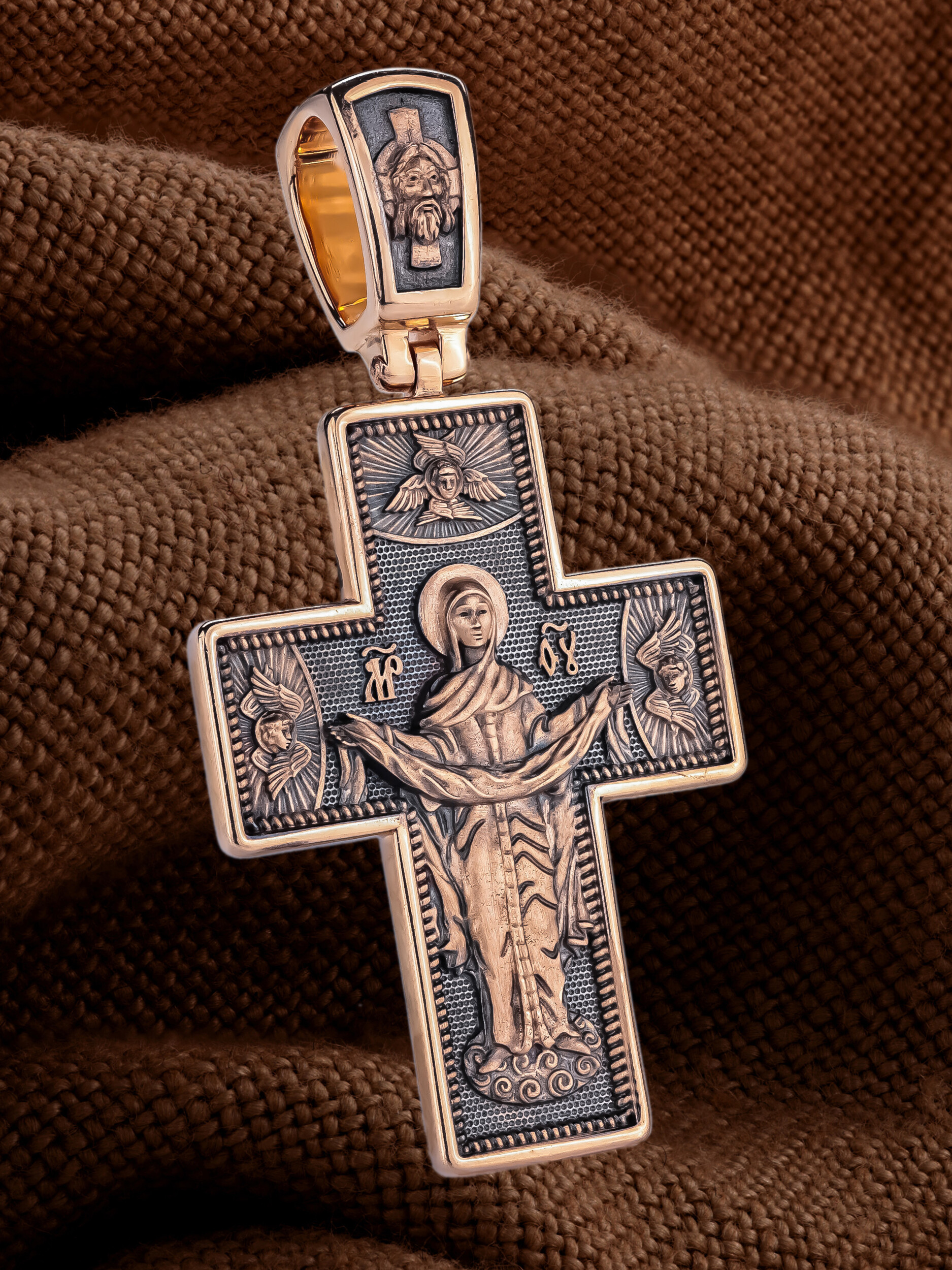 На обороте креста, в окружении крылатых Серафимов, изображена икона Покрова Пресвятой Богородицы. Праздник Покрова Божией Матери является воспоминанием чуда, которое произошло во Влахнернской церкви 1 (14) октября 910 года: Пресвятая Богородица явилась верующим над алтарем храма и распростерла над ними Свое покрывало. В этот день Божья Матерь открыла людям, что Она является Ходатаицей за них перед Богом. Богородица простирает Свой молитвенный покров над всеми православными христианами и умоляет Сына Своего о даровании вечного спасения каждому человеку.