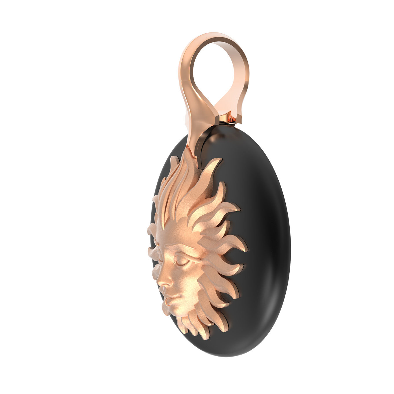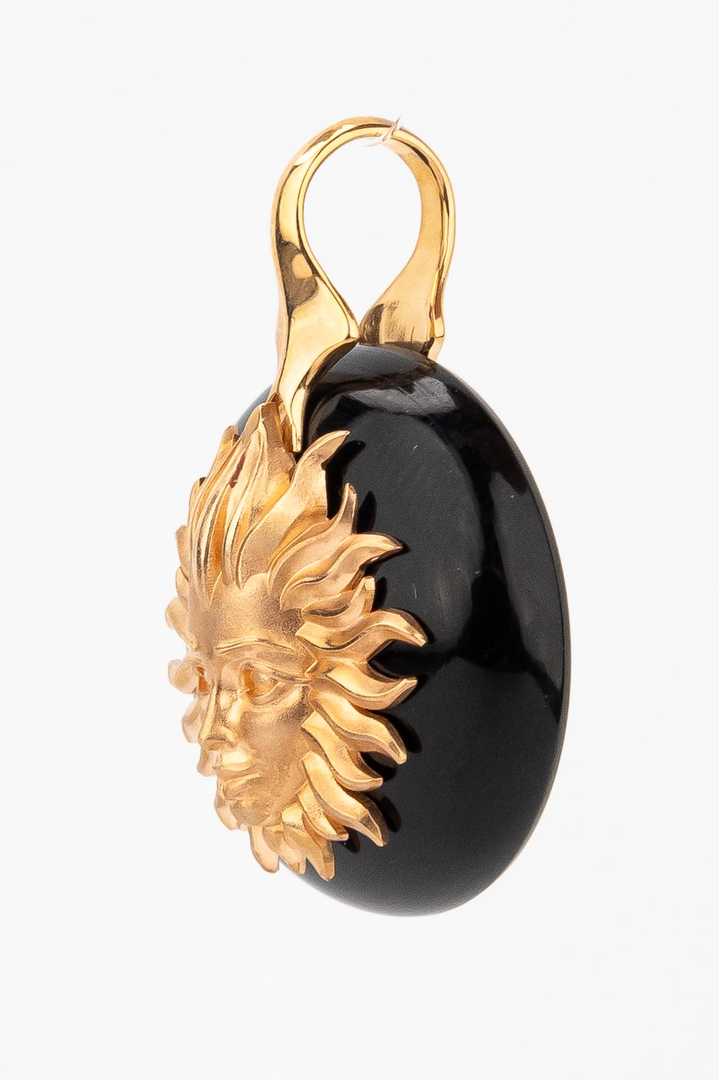 Центральным элементом композиции является изящный круглый оникс, на фоне которого расположено детально проработанное изображение солнца. Дизайн в стиле солнце/луна придает изделию философский подтекст, делая его выразительным акцентом вашего образа. Единственная вставка черного цвета гармонично сочетается с фактурным металлом, создавая запоминающийся визуальный эффект.