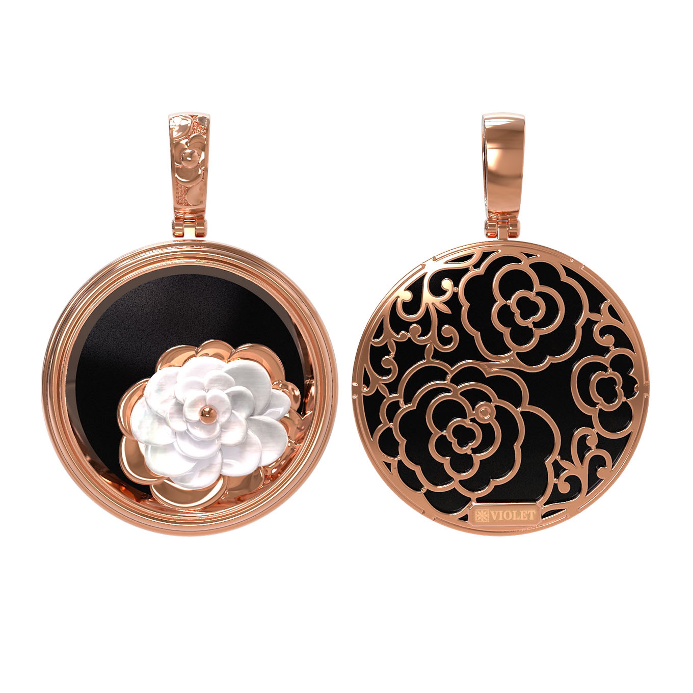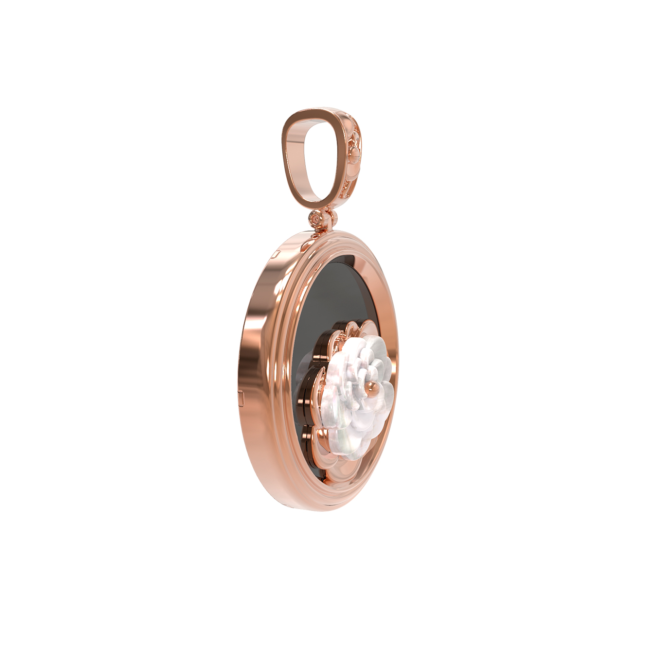 Центральным элементом композиции является круглая форма вставки, придающая украшению строгие и выверенные линии. Искусная работа мастеров подчеркивает красоту натуральных камней, чей цвет — перламутровый и черный — образует безупречный дуэт с теплым оттенком красного золота. Такое сочетание делает подвеску универсальным дополнением к повседневному или вечернему образу, подчеркивая индивидуальность владельца.