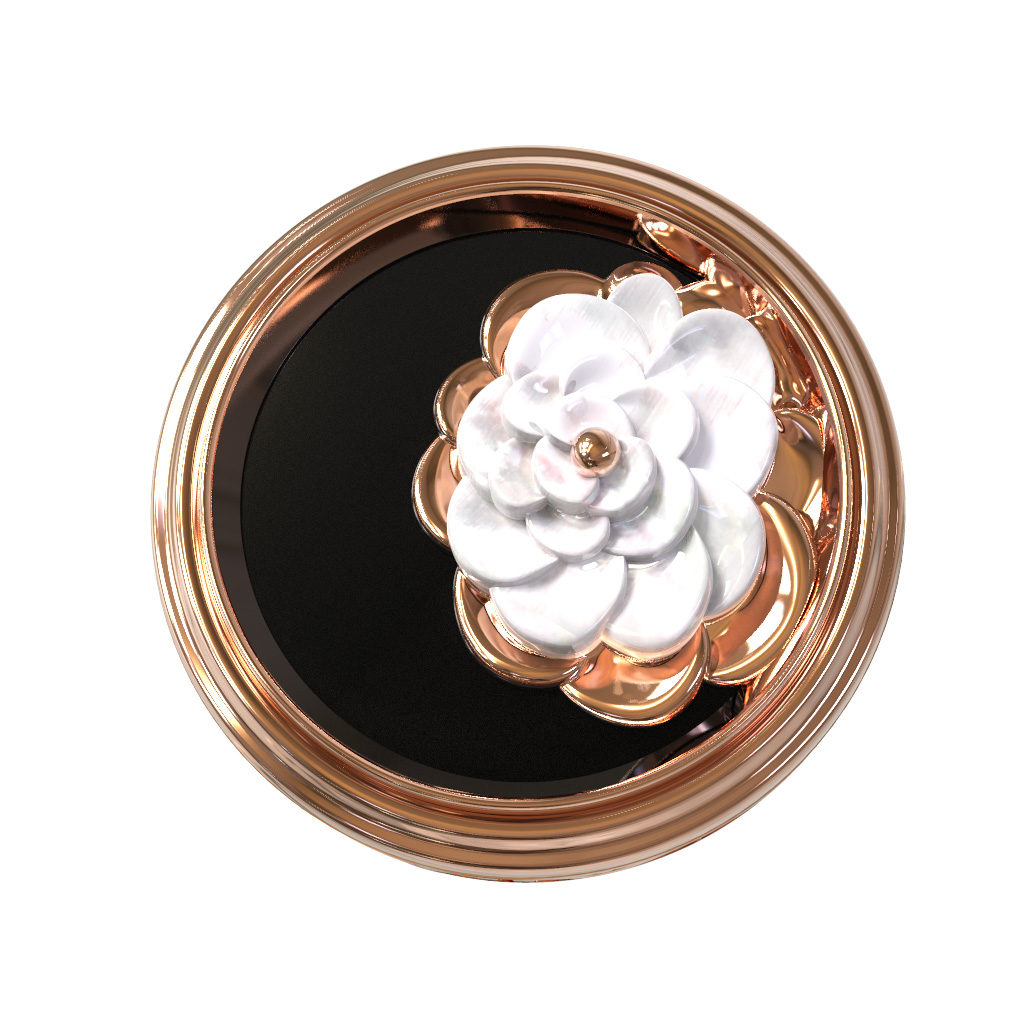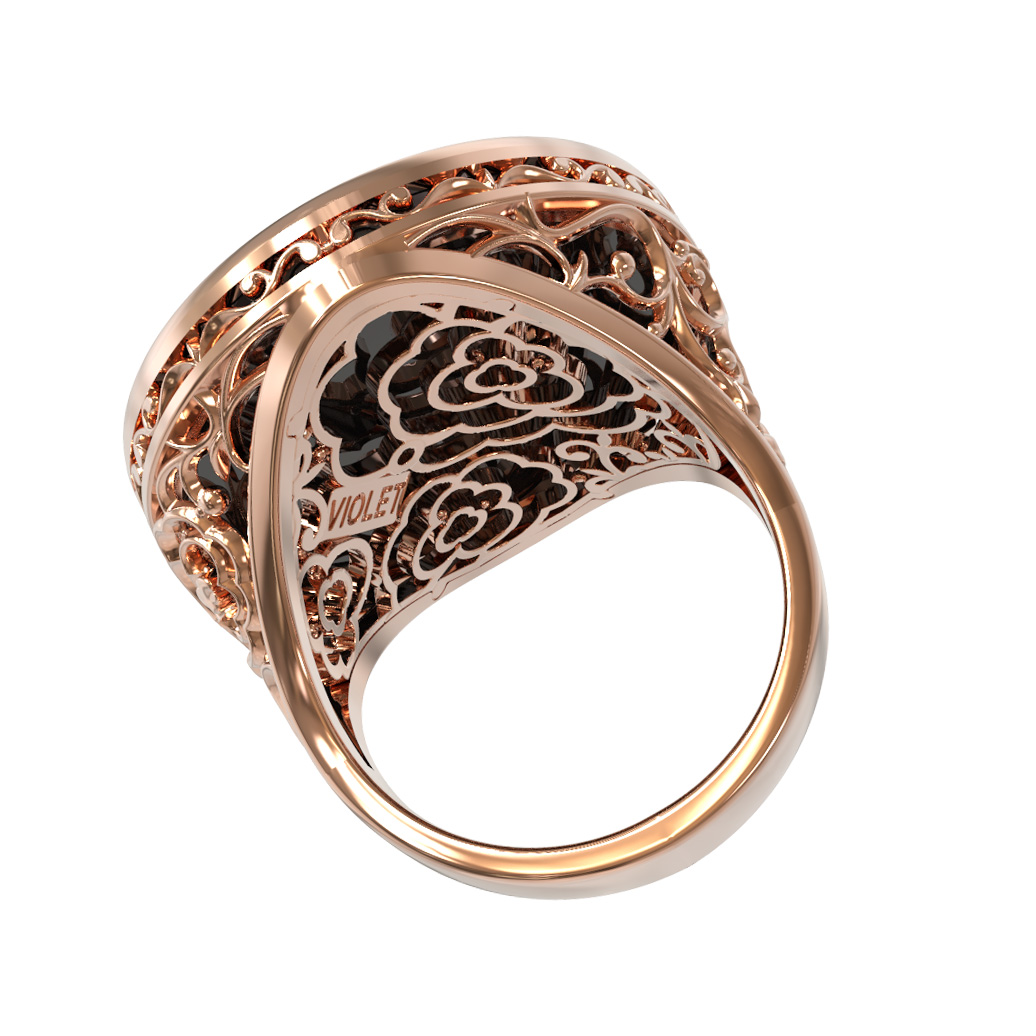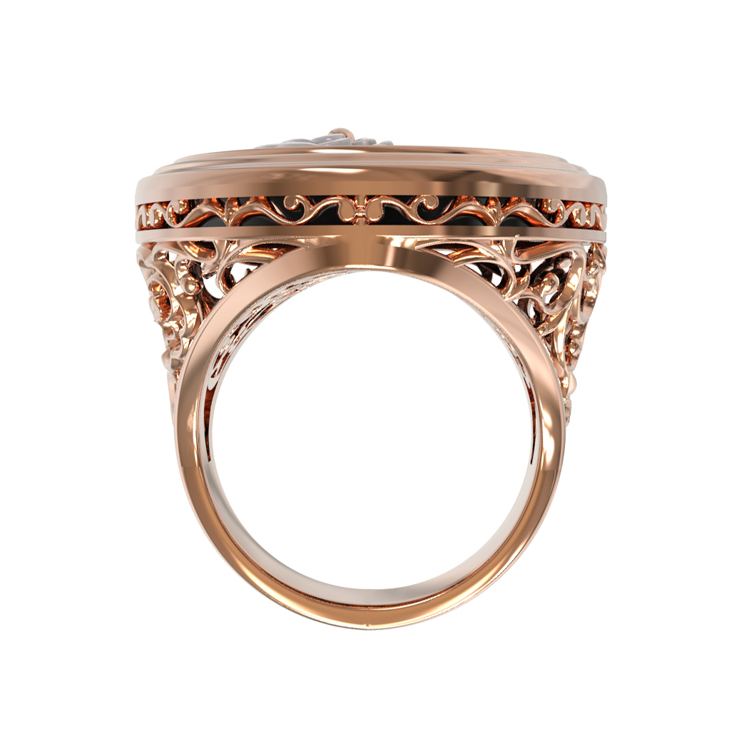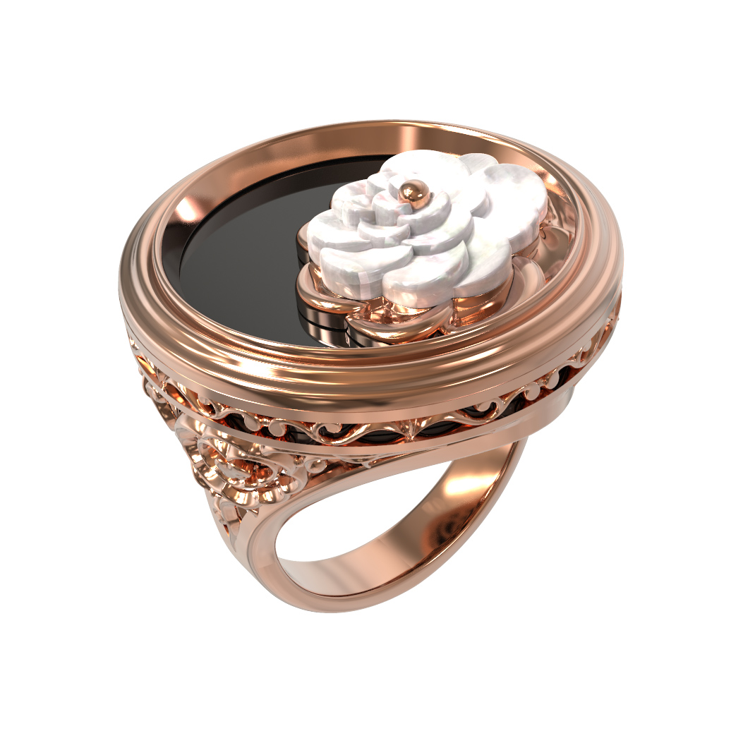Дизайн украшения вдохновлен классическими цветочными мотивами. Перламутровая роза круглой формы, расположенная поверх темного оникса, притягивает взгляд своим мягким сиянием и детализацией лепестков. Оправа кольца украшена филигранным узором, подчеркивающим художественную ценность работы.
