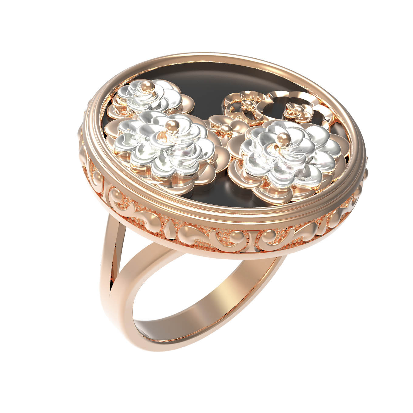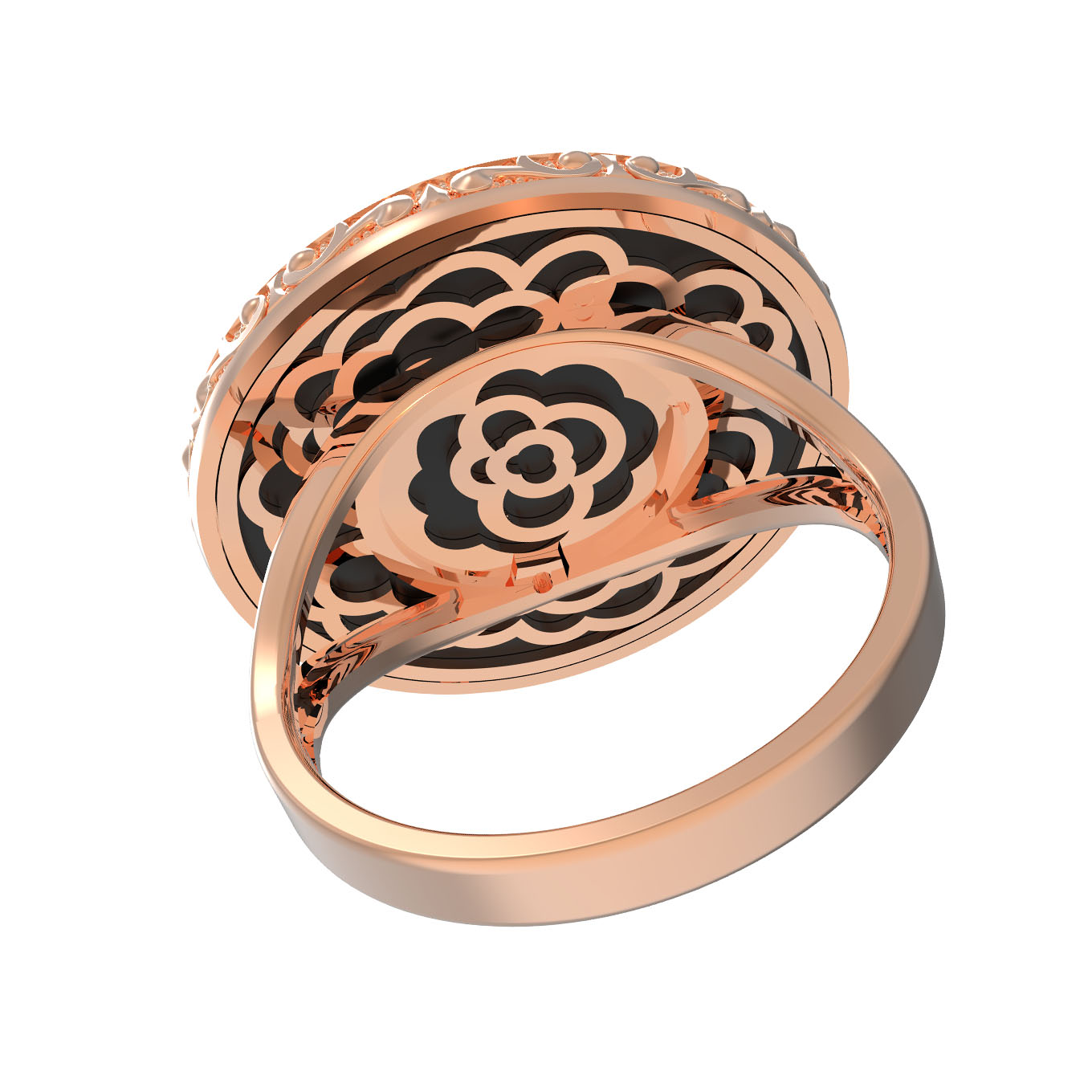 Кольцо из красного золота 585 пробы изысканно дополняет образ, объединяя в себе роскошь благородного металла и контрастное сочетание вставок. Это украшение, входящее в серию De Luxe — Роза, выполнено с утонченным дизайном в виде роз, который придает изделию особое очарование и эстетическую глубину. Центром композиции выступает круглая вставка из черного оникса, на фоне которой эффектно распускаются нежные перламутровые соцветия. Такая игра текстур и оттенков делает аксессуар выразительным акцентом, привлекающим внимание к каждой детали.