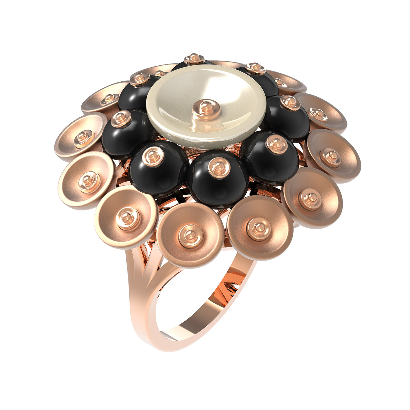 Кольцо из красного золота 585 пробы из коллекции De Luxe — Симфония — это смелое прочтение ювелирного искусства, сочетающее в себе безупречную форму и выразительную игру контрастов. Данное украшение привлекает внимание сложным дизайнерским исполнением, в котором центральная композиция дополнена 8 вставками в форме бусин. Глубокий черный цвет оникса эффектно перекликается с нежным перламутром, создавая гармоничную палитру, подчеркнутую благородным теплым оттенком красного металла.
