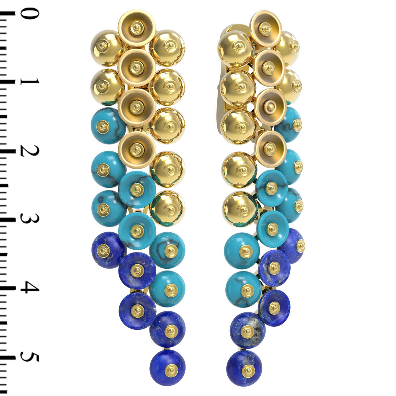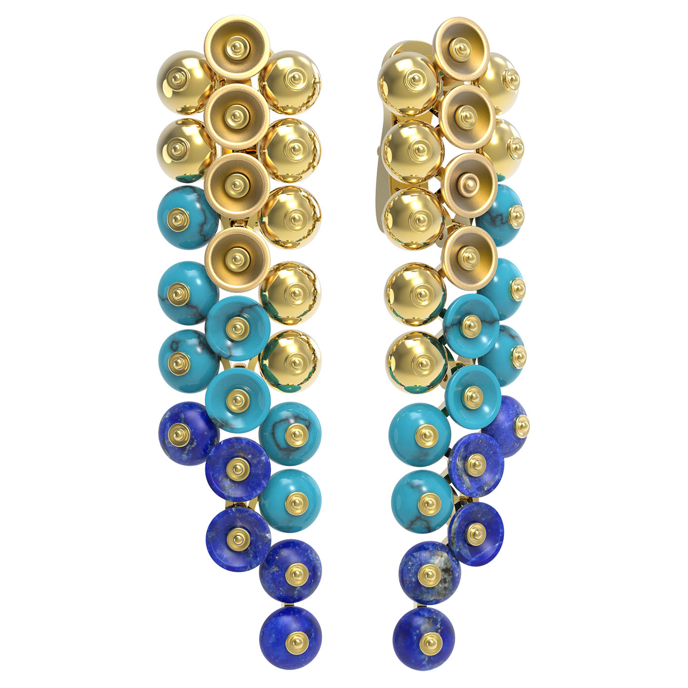 Цветовая палитра композиции построена на глубоком контрасте: яркий бирюзовый цвет бирюзы плавно переходит в глубокий синий оттенок лазурита. Такое сочетание придает серьгам особую динамику и стиль. Изделие спроектировано как универсальный аксессуар — эти серьги одинаково органично смотрятся как в женском, так и в мужском гардеробе, подчеркивая индивидуальность владельца. Лимонный цвет материала благородно обрамляет каждую бусину, добавляя украшению торжественности и блеска.