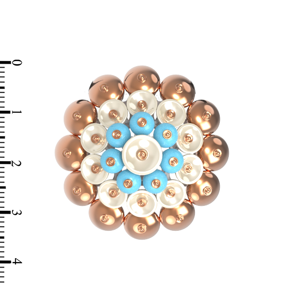 Центральный элемент композиции — семь вставок в форме бусин, выполненных из натуральной бирюзы бирюзового цвета и нежного перламутра. Сочетание теплых оттенков красного золота с прохладным сиянием камней создает выразительный контраст, привлекающий внимание к зоне декольте. Форма вставок в виде бусин придает украшению объем и динамику, позволяя ему эффектно играть на свету при каждом движении.