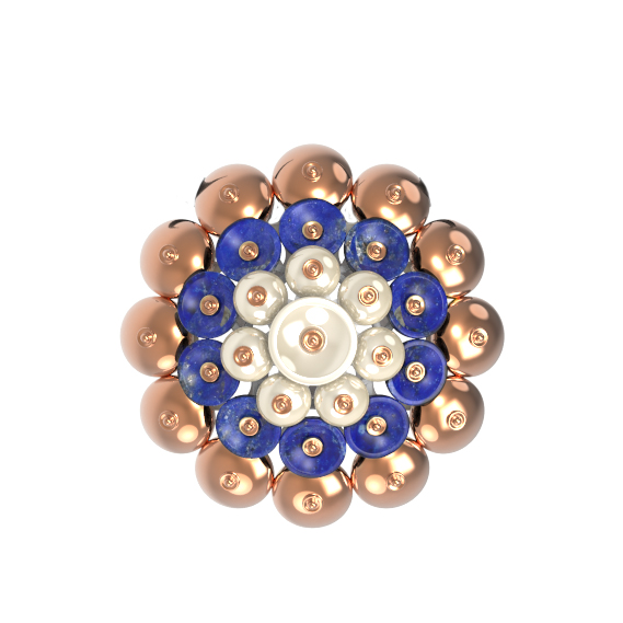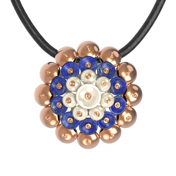 Эффектная подвеска из коллекции De Luxe — Симфония станет воплощением вашего безупречного вкуса и любви к нестандартным дизайнерским решениям. Ювелирное изделие выполнено из красного золота 585 пробы, чей теплый оттенок гармонично сочетается с выразительной инкрустацией. Основа композиции выстроена на контрасте фактур и глубоких оттенков: центральным элементом выступает нежный перламутр, который обрамляют насыщенные синие бусины из лазурита. В общей сложности модель насчитывает 10 вставок, образующих сложный, геометрически выверенный орнамент, напоминающий распустившийся цветок.