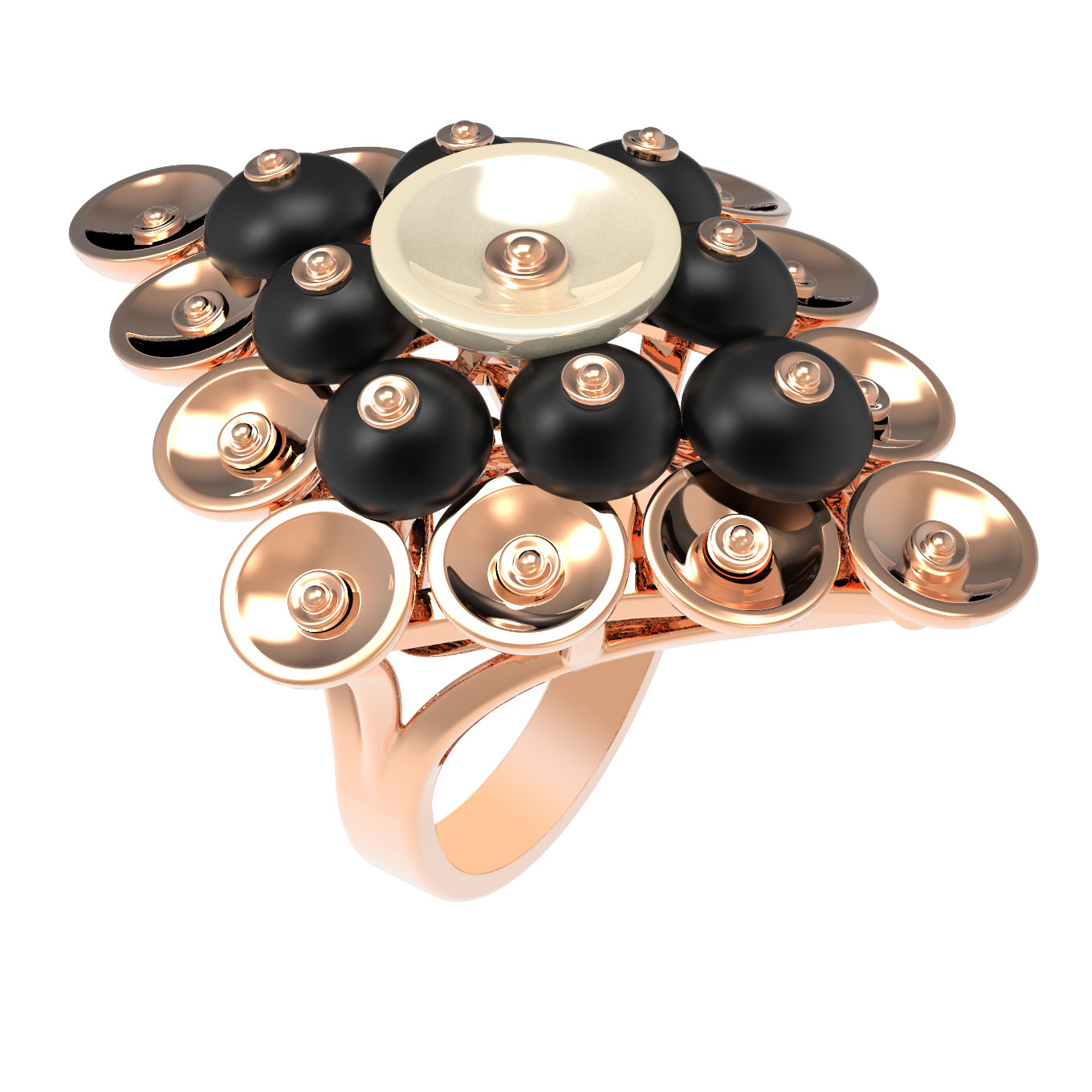Кольцо из коллекции De Luxe — Симфония — это выразительное украшение, которое притягивает взгляды своей нетривиальной формой и игрой контрастов. Основа изделия выполнена из благородного красного золота 585 пробы, чей теплый оттенок идеально подчеркивает глубину вставок. Дизайн представляет собой эффектную композицию из восьми вставок в форме бусин, где строгий черный оникс сочетается с нежным, переливающимся перламутром. Такая комбинация материалов создает баланс между торжественностью и утонченным стилем.