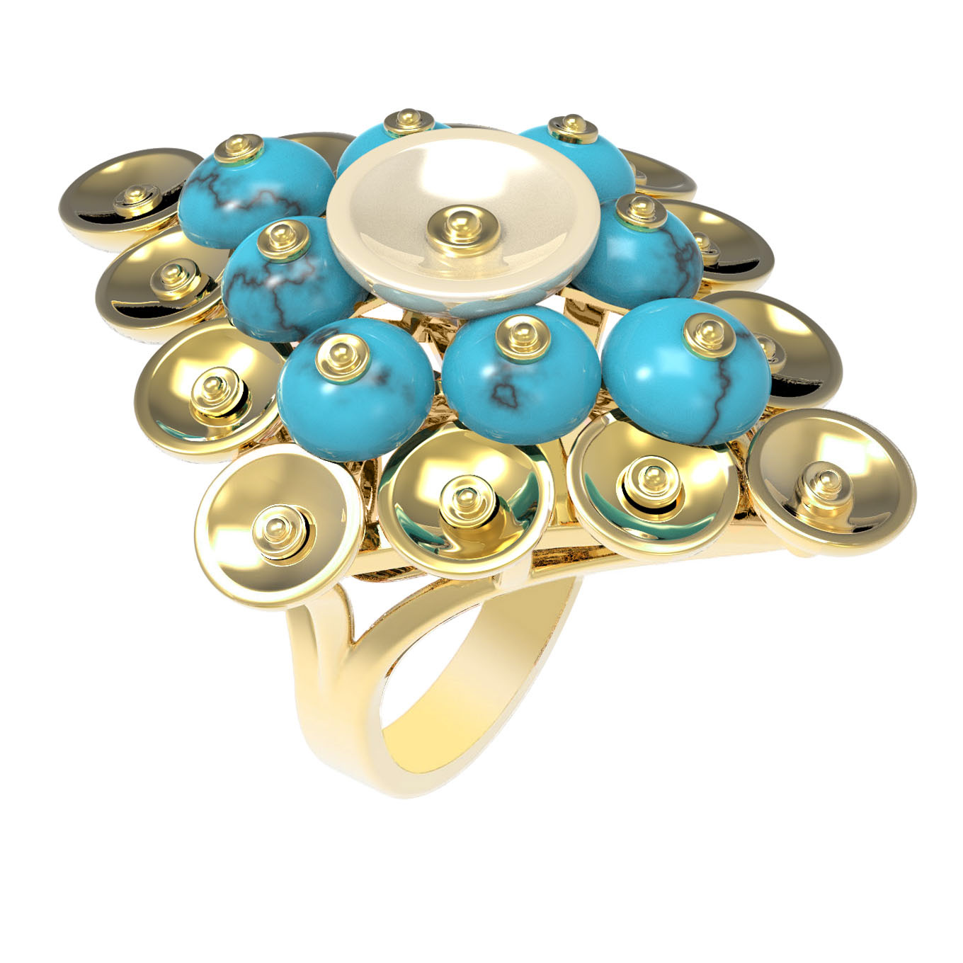 Роскошное кольцо из лимонного золота 585 пробы из коллекции De Luxe — Симфония станет воплощением изысканного вкуса и утонченности. Это оригинальное ювелирное изделие привлекает внимание своей необычной формой и мастерским сочетанием материалов. Центральным акцентом композиции выступает благородный перламутр, который великолепно гармонирует с восемью вставками из бирюзы. Камни имеют форму бусин и обладают насыщенным бирюзовым цветом, подчеркивающим солнечное сияние лимонного золота.