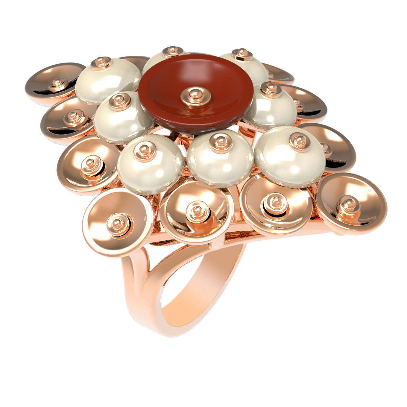 Центральным элементом композиции является изысканная вставка в форме бусины, выполненная из контрастного красного агата и нежного перламутра. Сочетание глубокого красного цвета агата и мягкого, переливающегося перламутра придает кольцу особый шарм и выразительность. Использование одной крупной вставки-бусины делает украшение центром внимания любого образа.