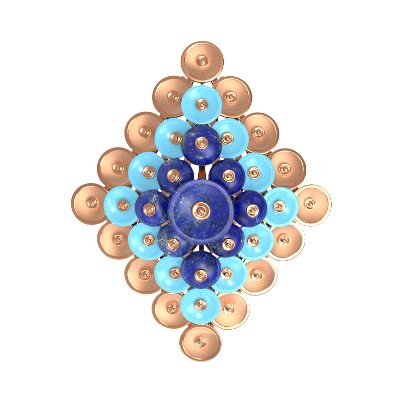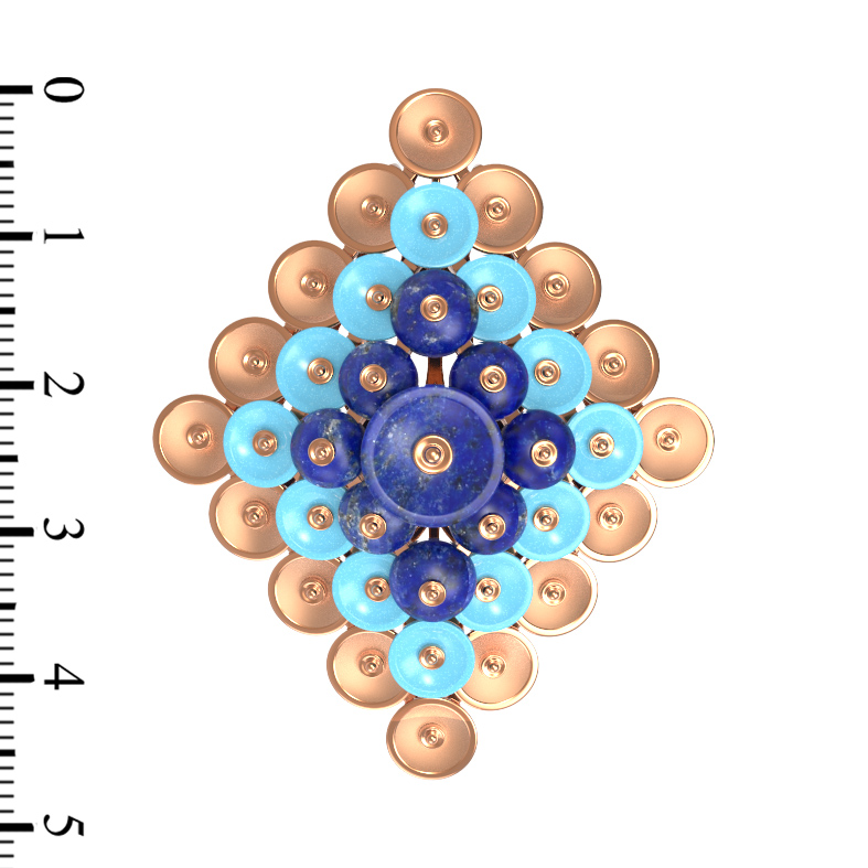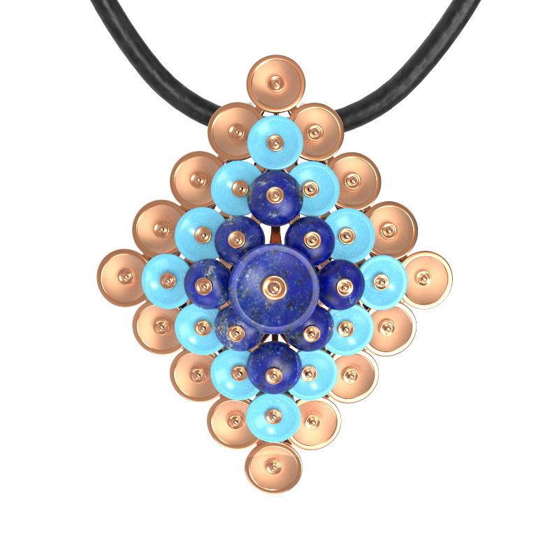 Контрастный дуэт бирюзового и синего цветов создает выразительный акцент: нежная, небесно-голубая бирюза деликатно обрамляет центральные элементы из глубокого лазурита. Благодаря такой цветовой палитре, изделие выглядит ярко и благородно одновременно. Подвеска универсальна по своему характеру — она отлично подойдет как для женщин, так и для мужчин, предпочитающих смелые и статусные аксессуары.