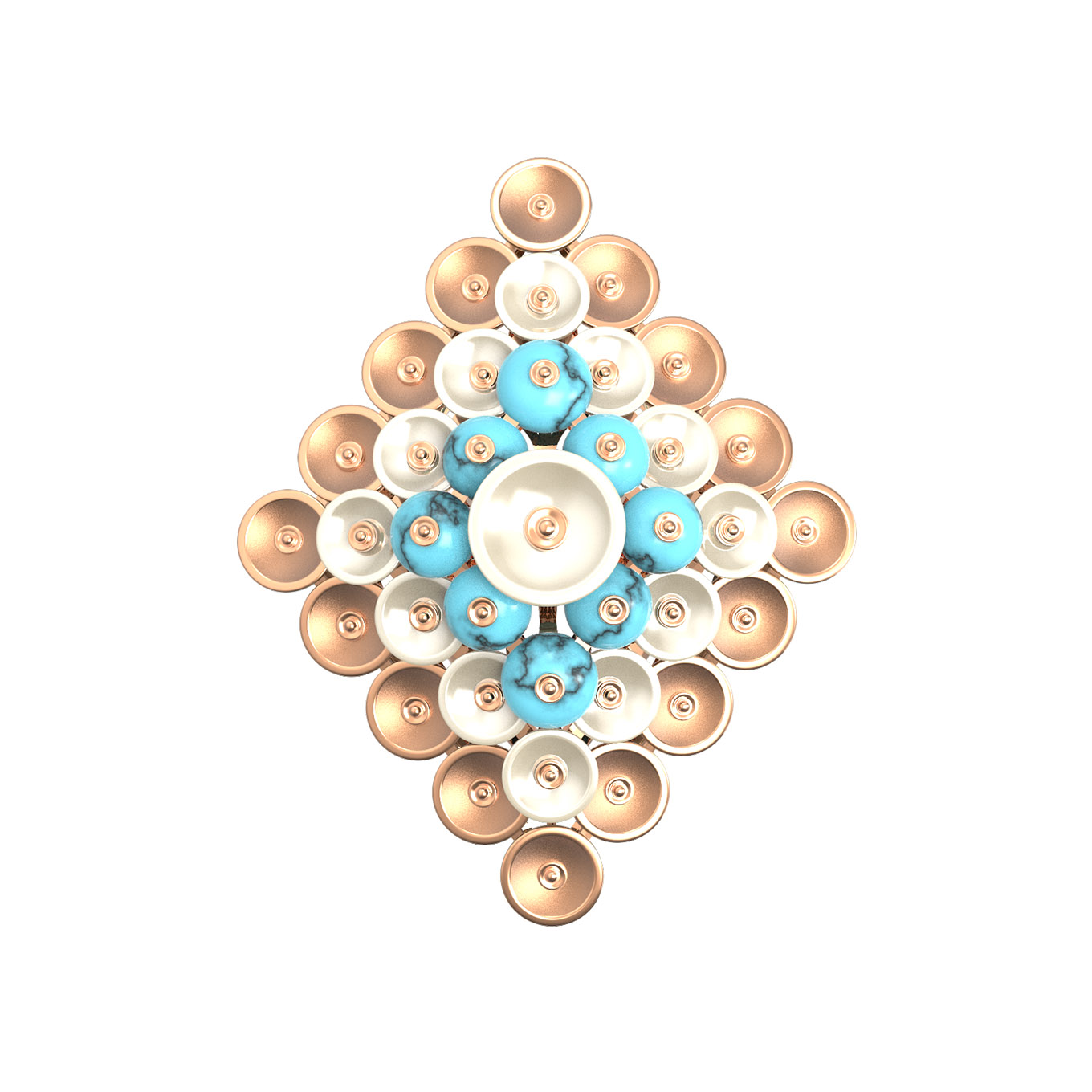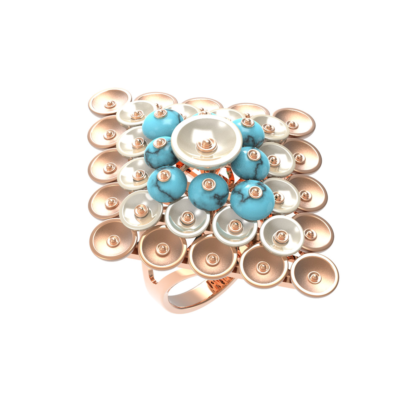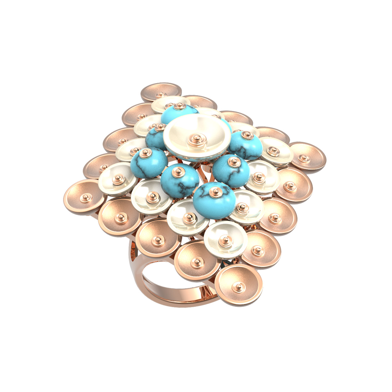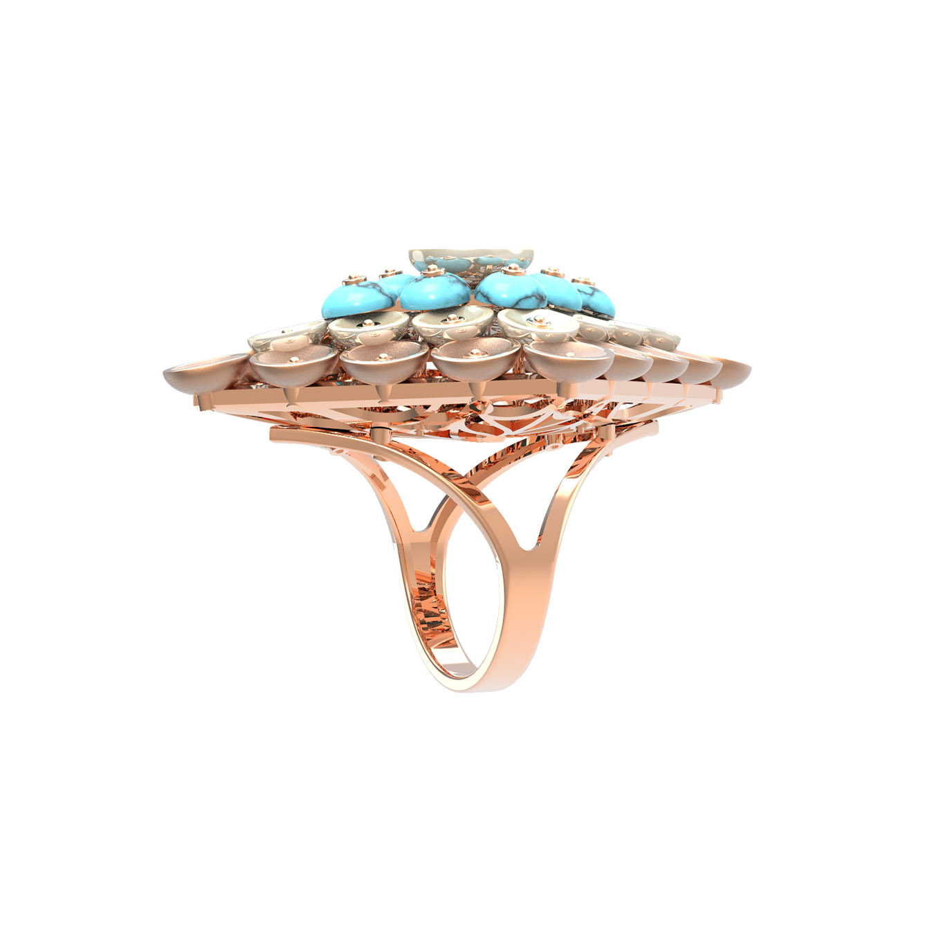 Роскошное кольцо из красного золота 585 пробы — это воплощение оригинального дизайна, вдохновленного эстетикой коллекции De Luxe — Симфония. Данное ювелирное изделие привлекает внимание своей необычной геометрической формой и сложной детализацией, превращая украшение в настоящий арт-объект на вашей руке. Центральная композиция украшена восьмью вставками в форме бусин, где небесно-голубой оттенок бирюзы гармонично сочетается с мягким сиянием перламутра.