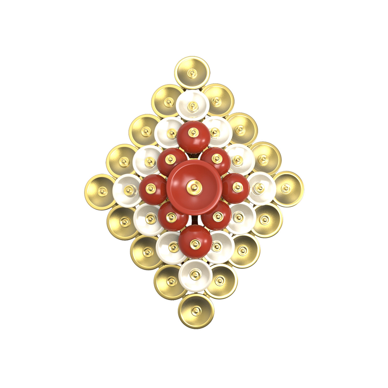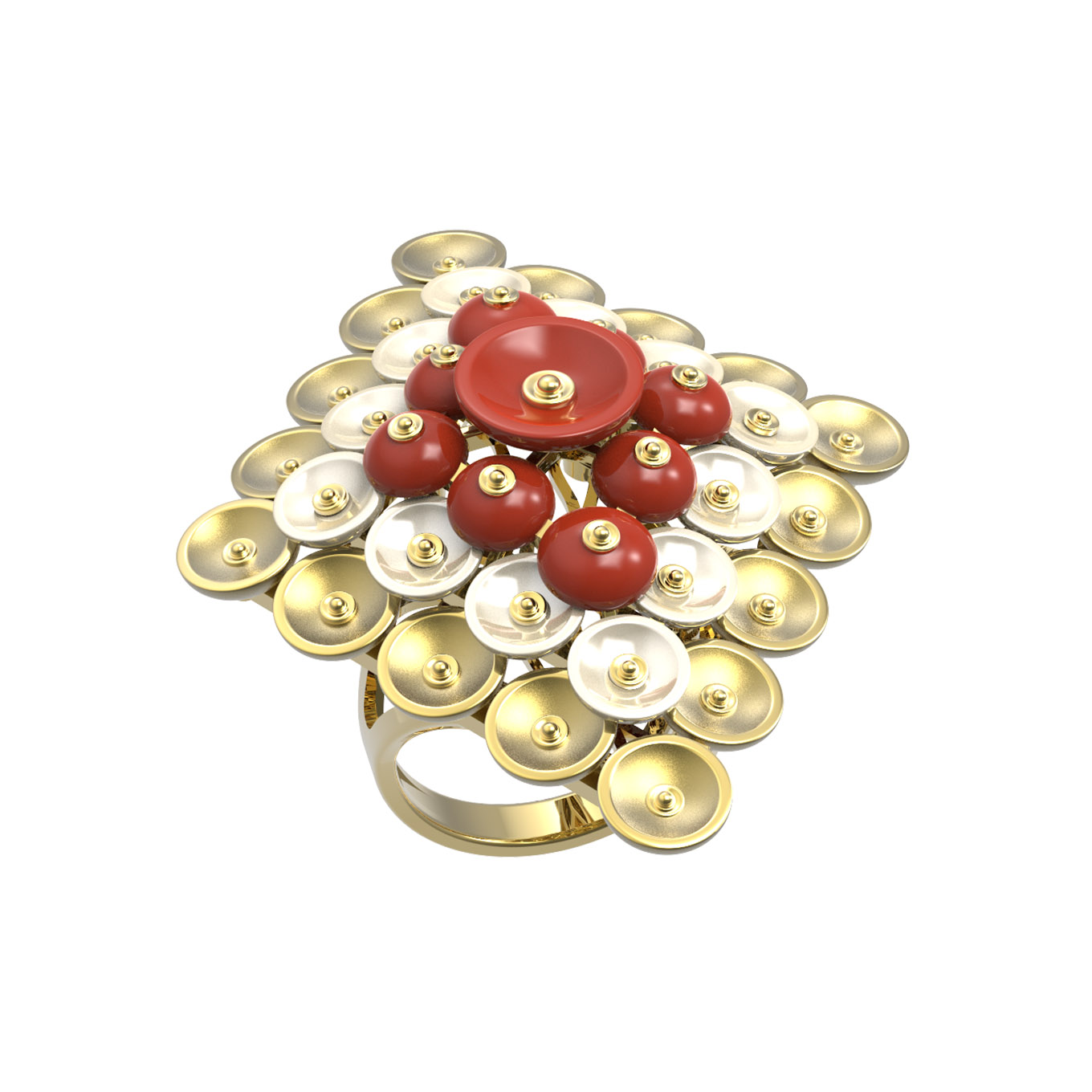 Центральным элементом композиции стали 9 вставок, выполненных в виде элегантных бусин. Контрастное сочетание красного агата и нежного перламутра создает неповторимую игру света и цвета, которая притягивает взгляд. Лимонный оттенок золота гармонично обрамляет вставки, добавляя изделию яркости и благородства. Геометрическая композиция из плоских и объемных элементов придает кольцу выразительный, современный вид.