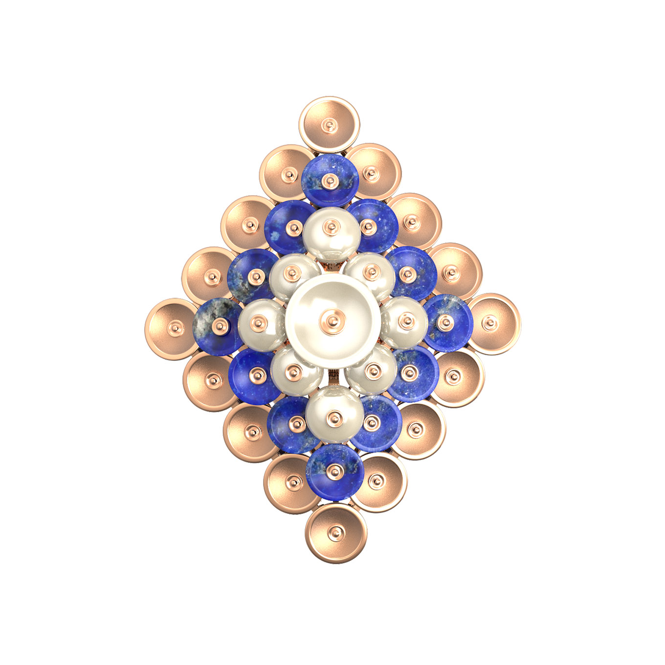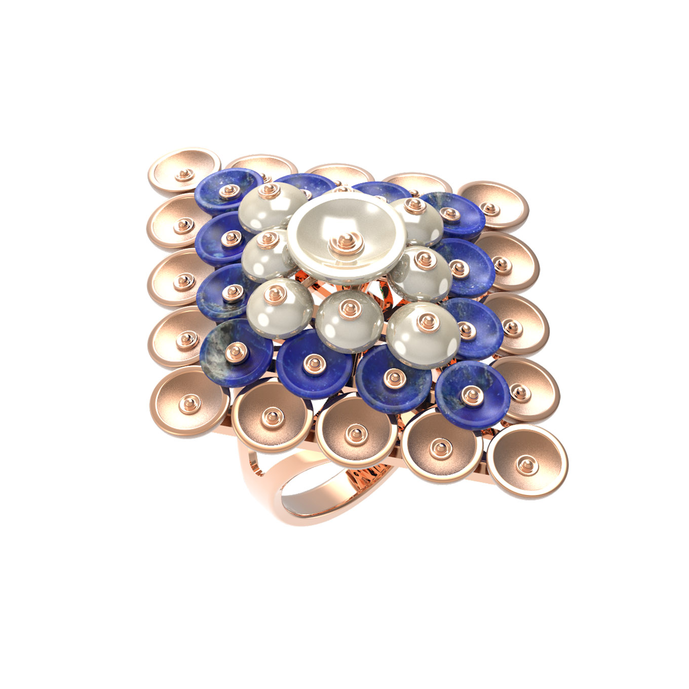 В оформлении кольца использовано 12 вставок: выразительный синий лазурит и нежный перламутр в форме бусин. Контраст глубокого, насыщенного цвета лазурита с мягким сиянием перламутра создает гармоничный дуэт, который эффектно подчеркивается теплым блеском красного золота. Ювелирная работа впечатляет своей детализацией — каждый элемент композиции выверен до мелочей.