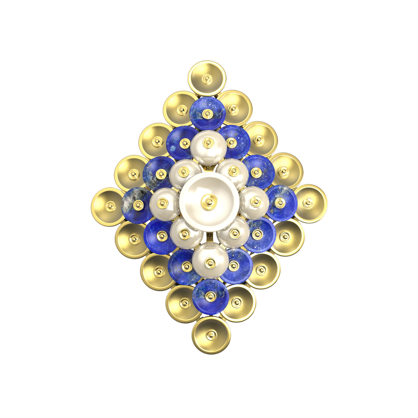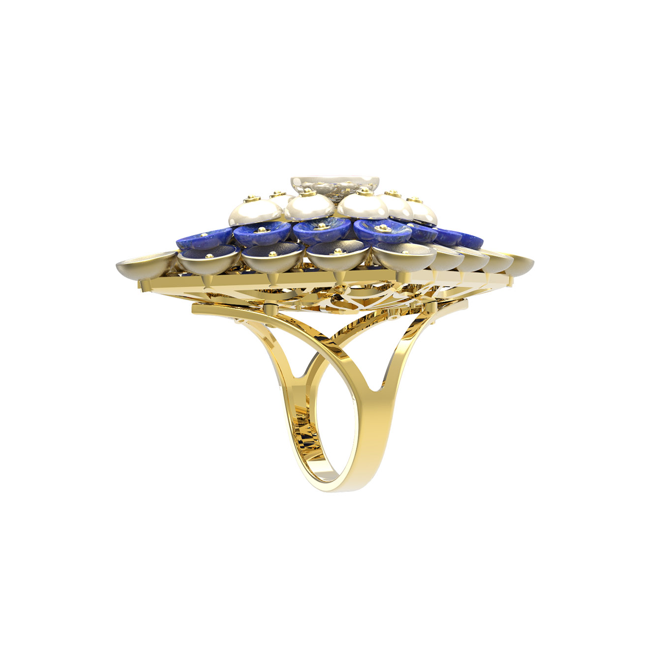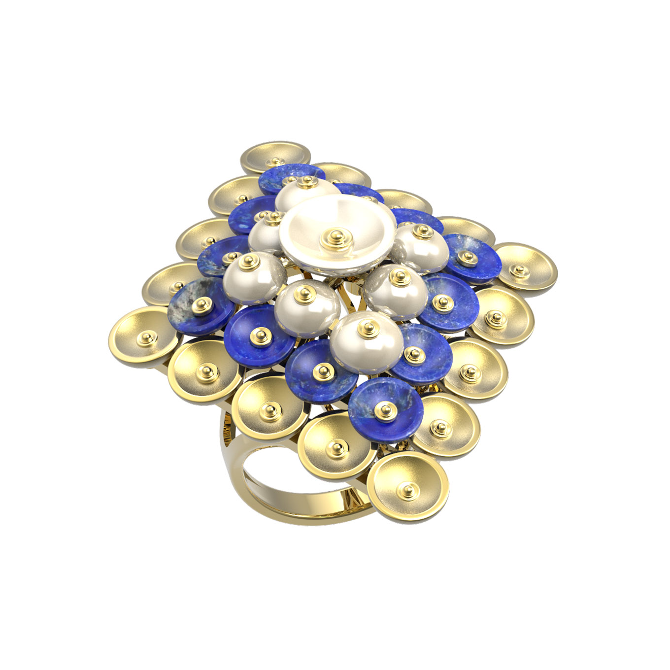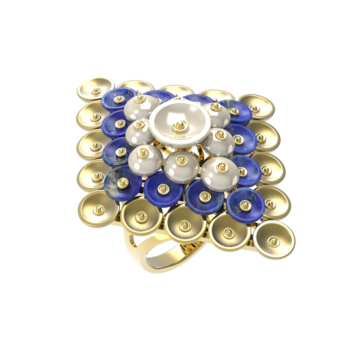 Кольцо из коллекции De Luxe — Симфония — это воплощение смелого дизайна и безупречного ювелирного мастерства. Изделие выполнено из благородного лимонного золота 585 пробы, чей мягкий, солнечный оттенок создает идеальный фон для выразительной игры контрастов. Главным акцентом украшения выступают 12 вставок в форме бусин, гармонично сочетающих в себе насыщенный синий цвет лазурита и нежный перламутр.