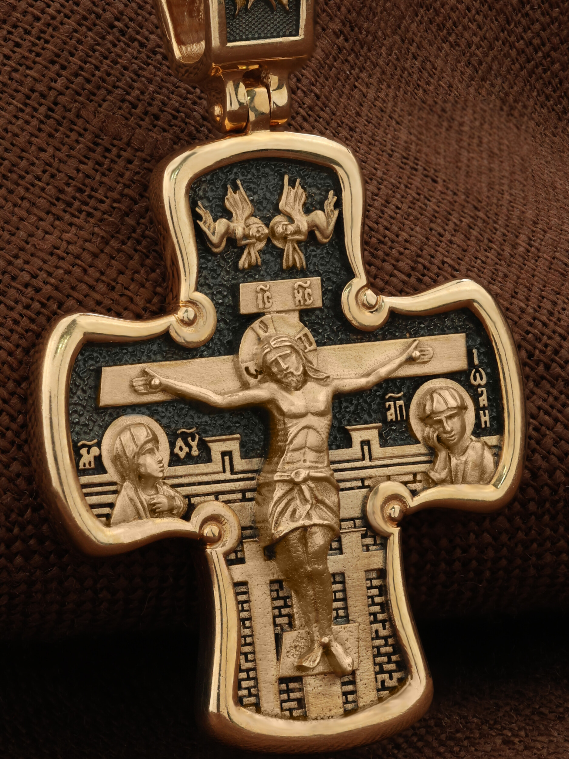 Лицевая сторона креста по канону посвящена Господу Иисусу Христу. Чаще всего на нательных крестах изображается Распятие, которое символизирует победу над грехом и смертью. Своими страданиями Господь искупил грехи человечества: умерев и сошествовав во ад, Он победил дьявола, освободил души праведников от вечной смерти и открыл им Небесные врата рая. Жертва Христа сделала возможным спасение для каждого человека. Поэтому на православных крестах Господь изображается не страдающим, а словно возносящимся и обнимающим весь мир. Он — Спаситель человечества, поправший смертию смерть и призывающий к Себе «все концы земли» (Ис. 45, 22). С двух сторон от Христа изображаются Его Мать, Пресвятая Богородица, и любимый ученик, апостол Иоанн Богослов. Они стояли у Креста неотлучно до самого конца, пока Господь не предал дух Свой Небесному Отцу. Позади — Иерусалимская стена. На иконах она обозначает место казни и символизирует Небесный Иерусалим, путь в который открылся для человечества через Голгофу.
