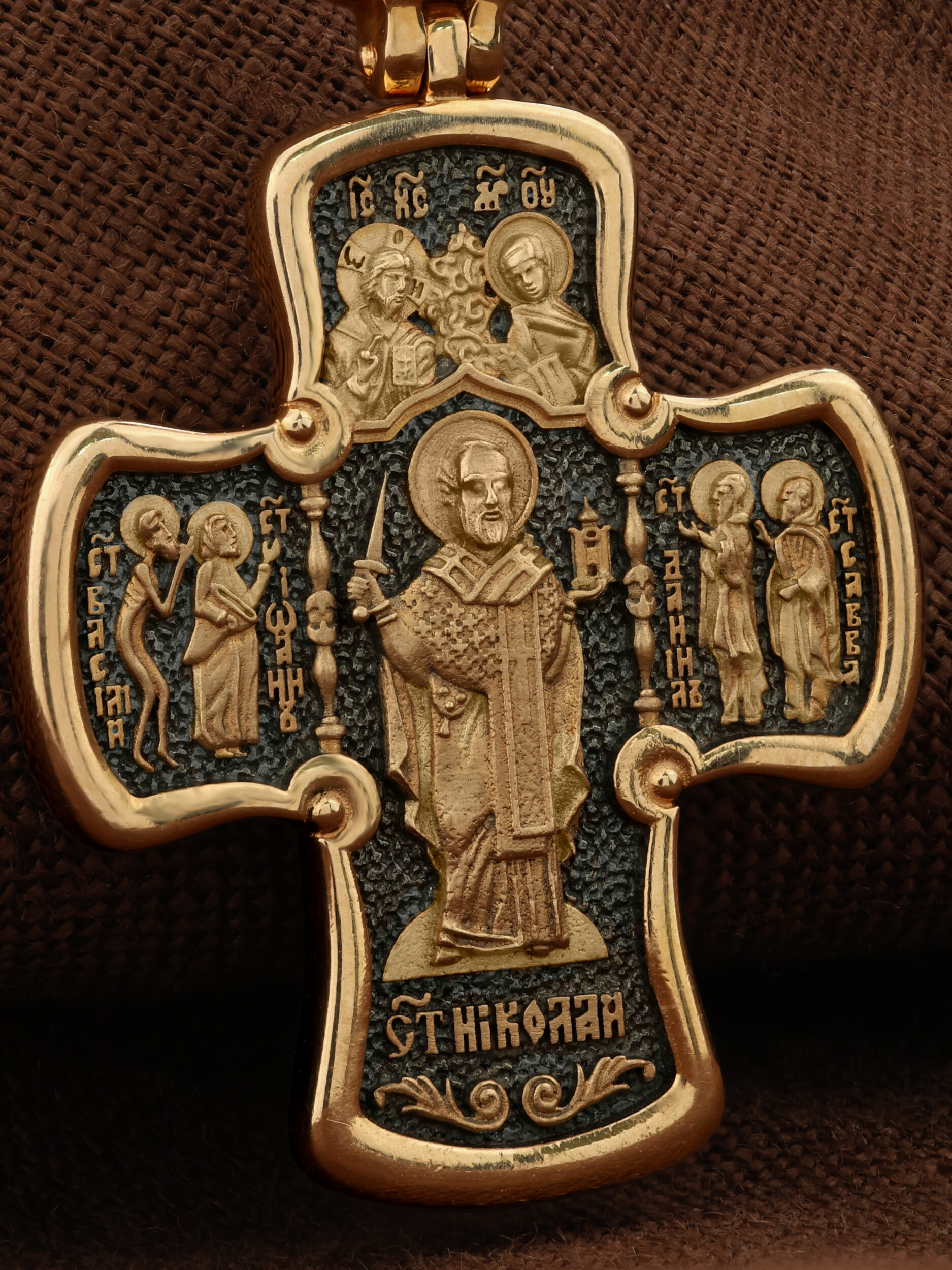 На обороте креста помещена икона самого почитаемого на Руси Святого — Николая Чудотворца (втор. пол. III в.).В руках Они держат знаки епископского достоинства. Чудотворец получил омофор и Евангелие лично из рук Богородицы и Спасителя как защитник и проповедник веры. С двух сторон от Святителя Николая помещены образы великих московских святых, прославившихся чудесами на всю Россию. Слева стоят Христа ради юродивые XVI века: Василий Блаженный, в честь которого назван самый знаменитый русский собор на Красной площади в Москве, и Иоанн Большой Колпак, блаженный, который похоронен в этом храме вместе с Василием Блаженным. Слева — преподобные чудотворцы Даниил Московский, младший сын Александра Невского, и Савва Сторожевский. Оба святых были основателями великих русских монастырей XIV века — Свято-Данилова в Москве и Саввино-Сторожевского в Звенигороде.