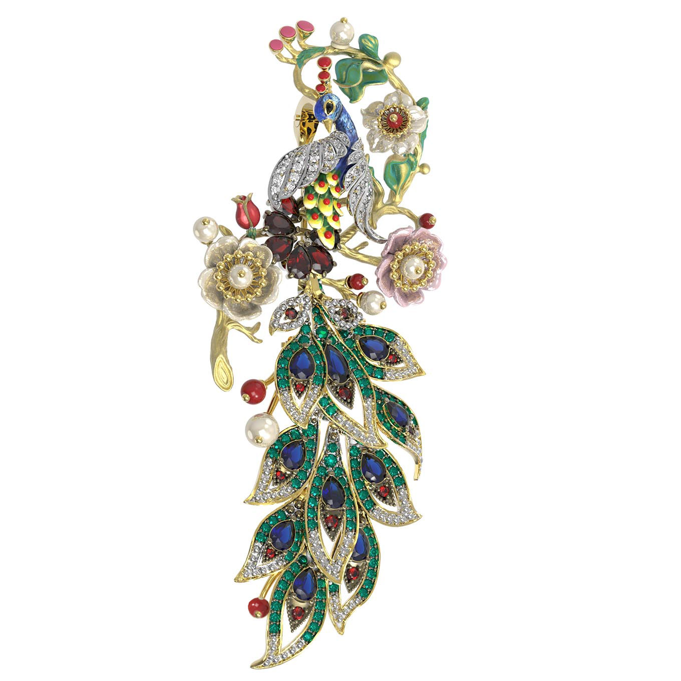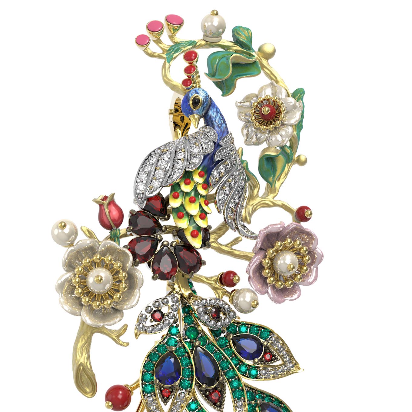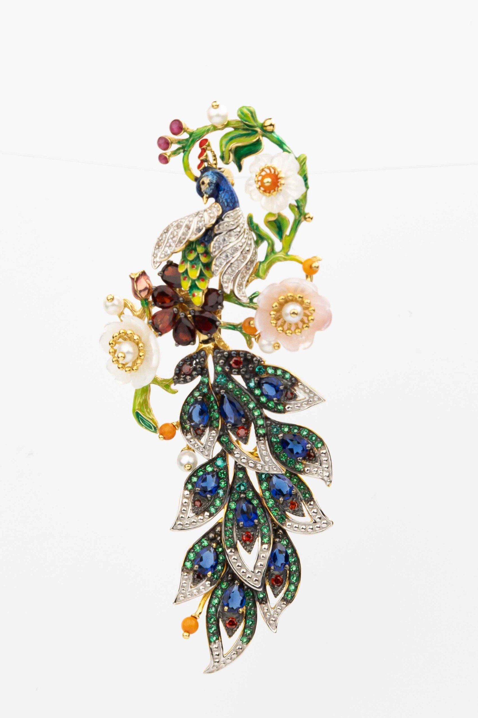 Ювелирная композиция поражает богатством декора: брошь украшают 172 вставки, среди которых благородные гранаты, нежные жемчужины, изысканный коралл и перламутр, глубокие сапфиры и сверкающие фианиты. Яркие акценты расставляет эмаль, добавляя изделию художественной глубины и выразительности. Форма вставок — круглая, грушевидная и бусины — гармонично переплетается в сложном узоре, создавая эффектный цветовой микс из белых, красных, синих и перламутровых оттенков.