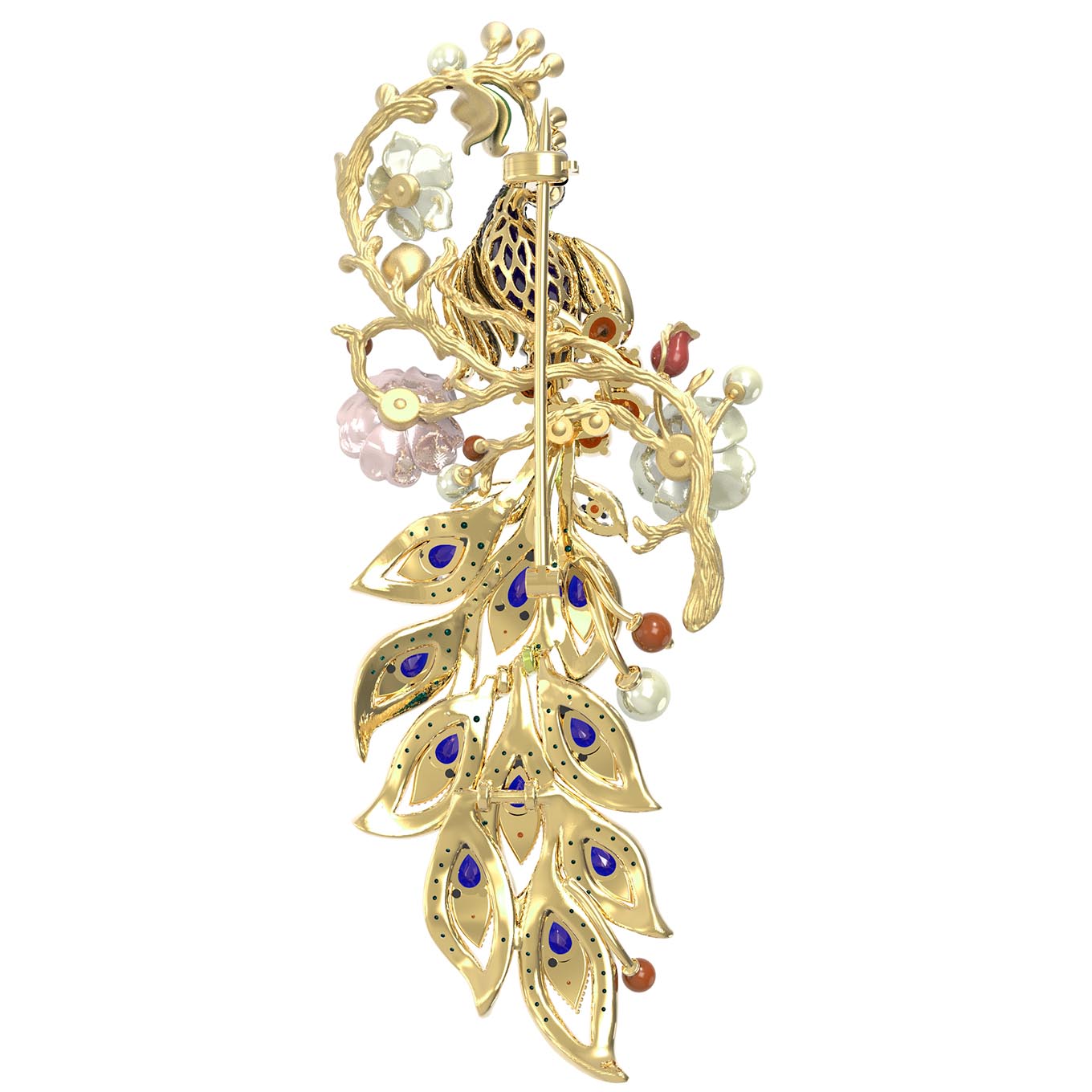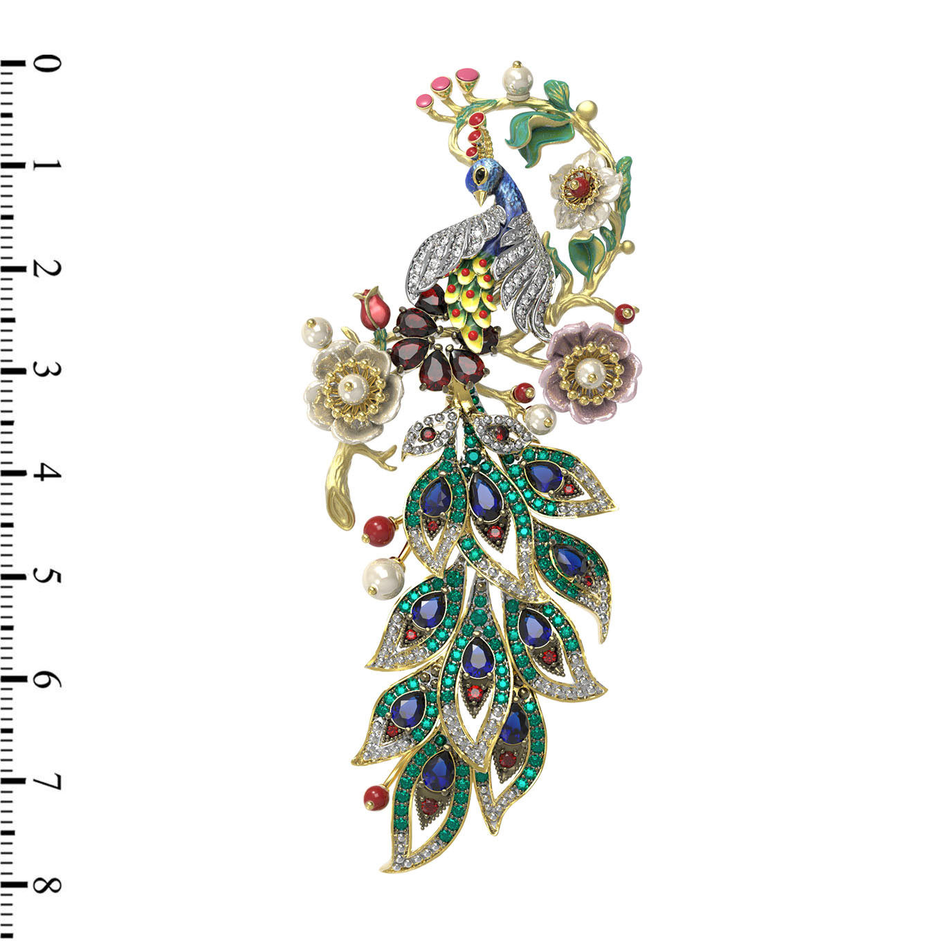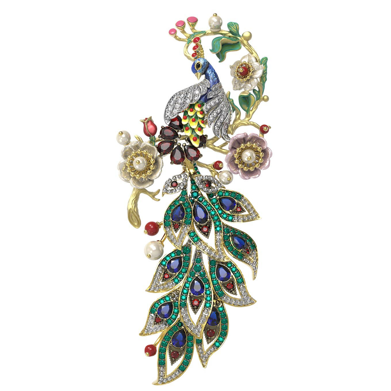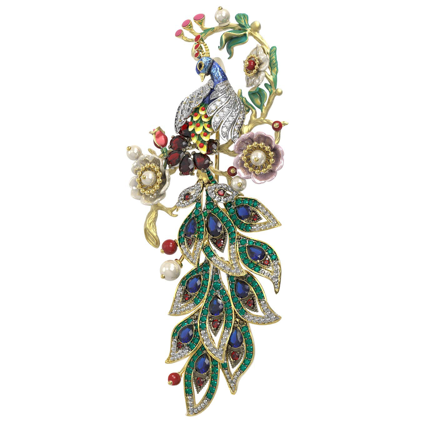Ювелирная композиция поражает богатством декора: брошь украшают 172 вставки, среди которых благородные гранаты, нежные жемчужины, изысканный коралл и перламутр, глубокие сапфиры и сверкающие фианиты. Яркие акценты расставляет эмаль, добавляя изделию художественной глубины и выразительности. Форма вставок — круглая, грушевидная и бусины — гармонично переплетается в сложном узоре, создавая эффектный цветовой микс из белых, красных, синих и перламутровых оттенков.