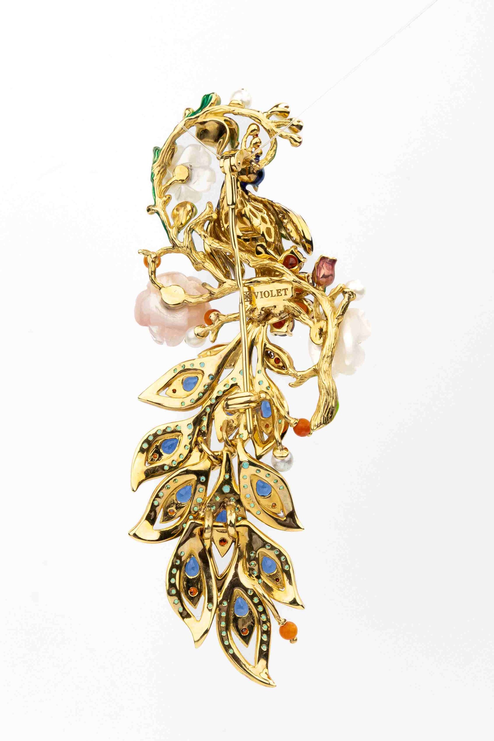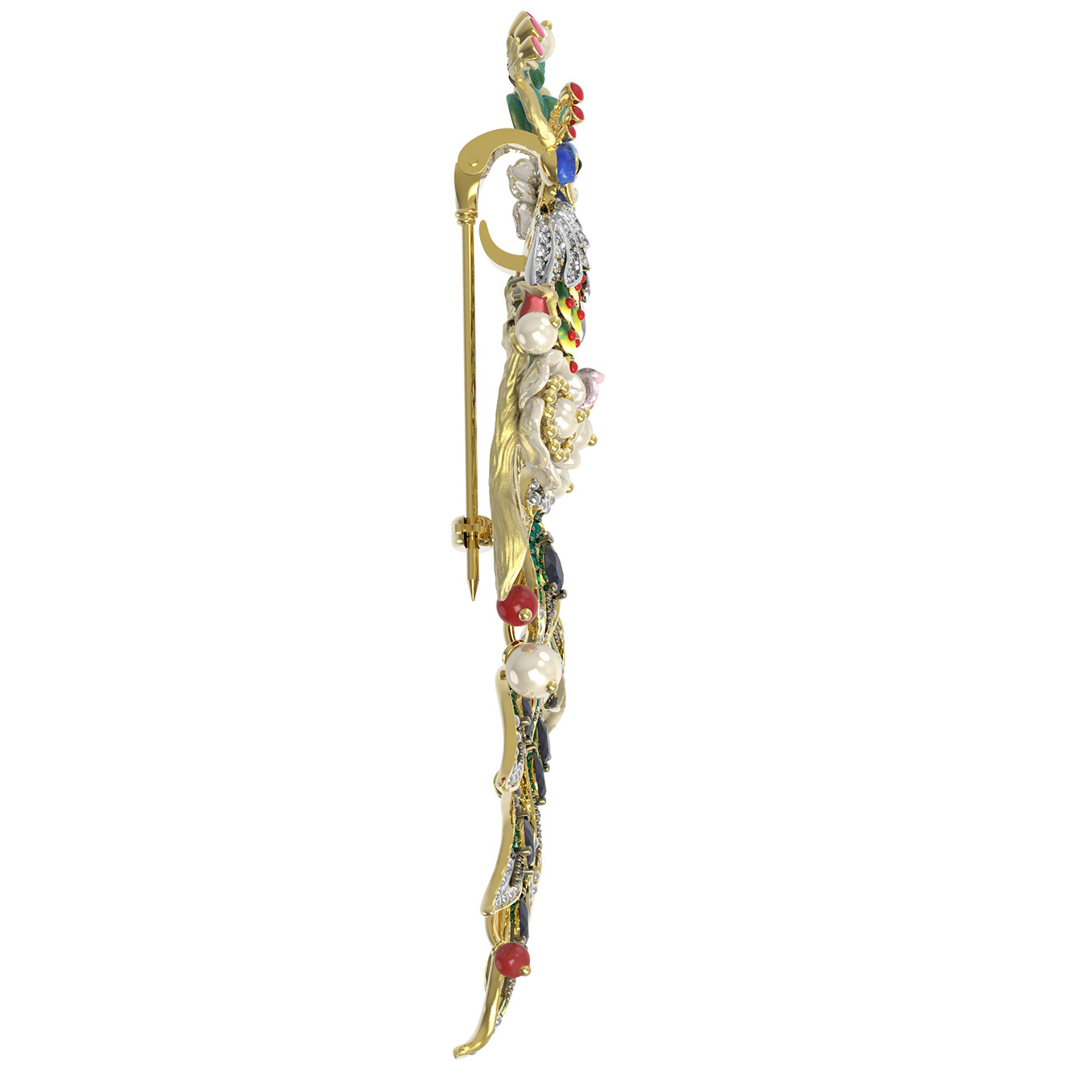 Брошь из лимонного золота c эмалью, фианитом, гранатом, жемчугом, сапфиром, кораллом и перламутром