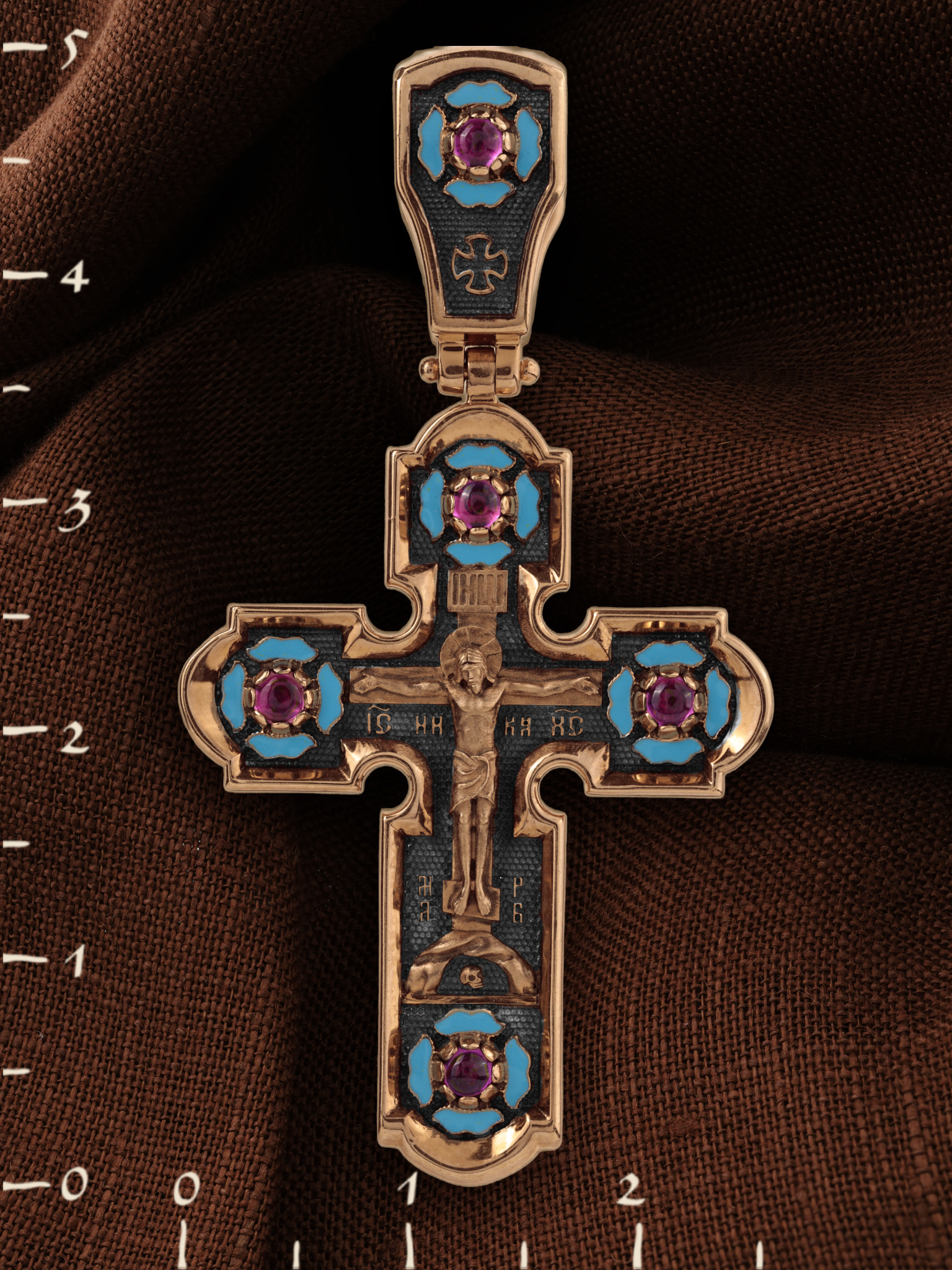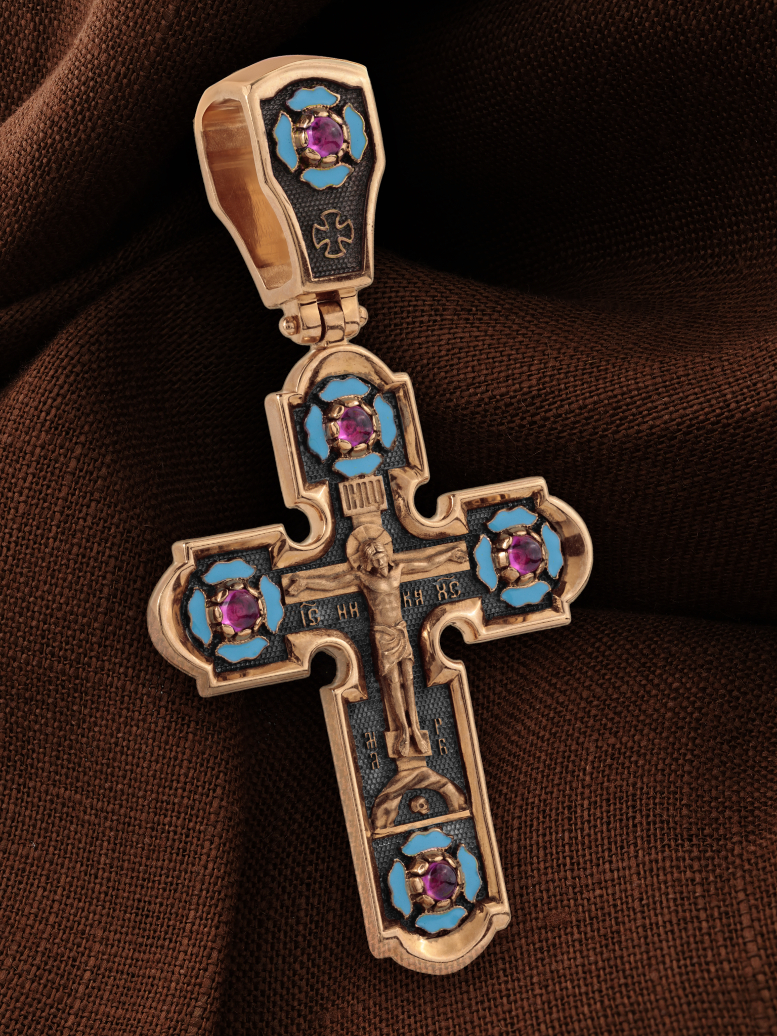 На лицевой стороне креста изображено Распятие Господа и Спасителя нашего Иисуса Христа. Христос, подвергнутый на кресте мучительной казни, своими страданиями искупил нас от древнего греха и даровал нам жизнь вечную. На верхней табличке, выше головы Иисуса, расположена надпись, составленная Понтием Пилатом — «IНЦI». Она означает «Иисус Назорей, Царь Иудейский». Надпись «IС» « ХС» означает Иисус Христос и слово «НИКА», что означает «победитель», помещаются на разных сторонах поперечной перекладины креста. В нижней части креста находится надпись «МЛРБ» — «место лобное рай бысть» означает, что место лобное стало раем. Крест стоит на горе камней, символизирующих Голгофу. Под подножием Креста изображена покоящаяся голова (череп) Адама, грехи которого Христос омыл Своею Кровью. Христос в Своей Божественной любви, над которой смерть не властна и которая, страдая, и не страдает в обычном смысле, простирает к людям со Креста Свои объятия, в которые призывается и привлекается весь мир.