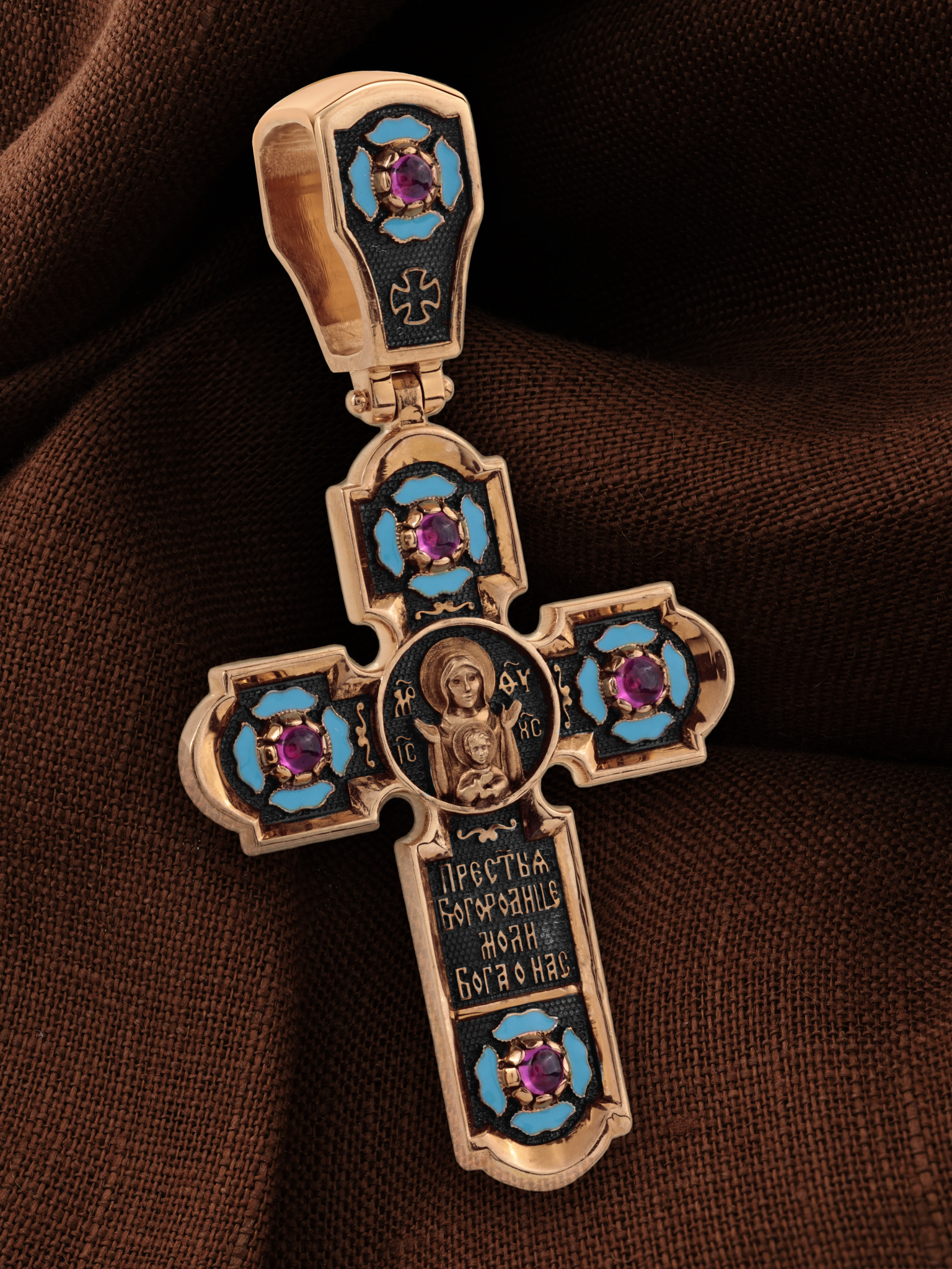 На оборотной стороне креста изображена икона Божией Матери «Знамение». Икона изображает Пресвятую Богородицу, молитвенно поднимающую Свои руки: на груди Ее, на фоне круглого щита, — благословляющий Божественный Младенец — Спас-Эммануил. Богоматерь изображена по пояс. Иконы Божией Матери, известные под именем «Знамение», появились на Руси в XI — XII веках, а называться так стали после чудесного знамения от Новгородской иконы, случившегося в 1170 году. Многочисленные списки с иконы Знамения известны по всей России. Многие из них просияли чудесами в местных храмах и были наименованы по месту явления чудес.