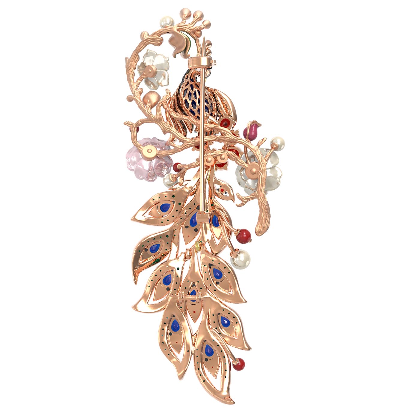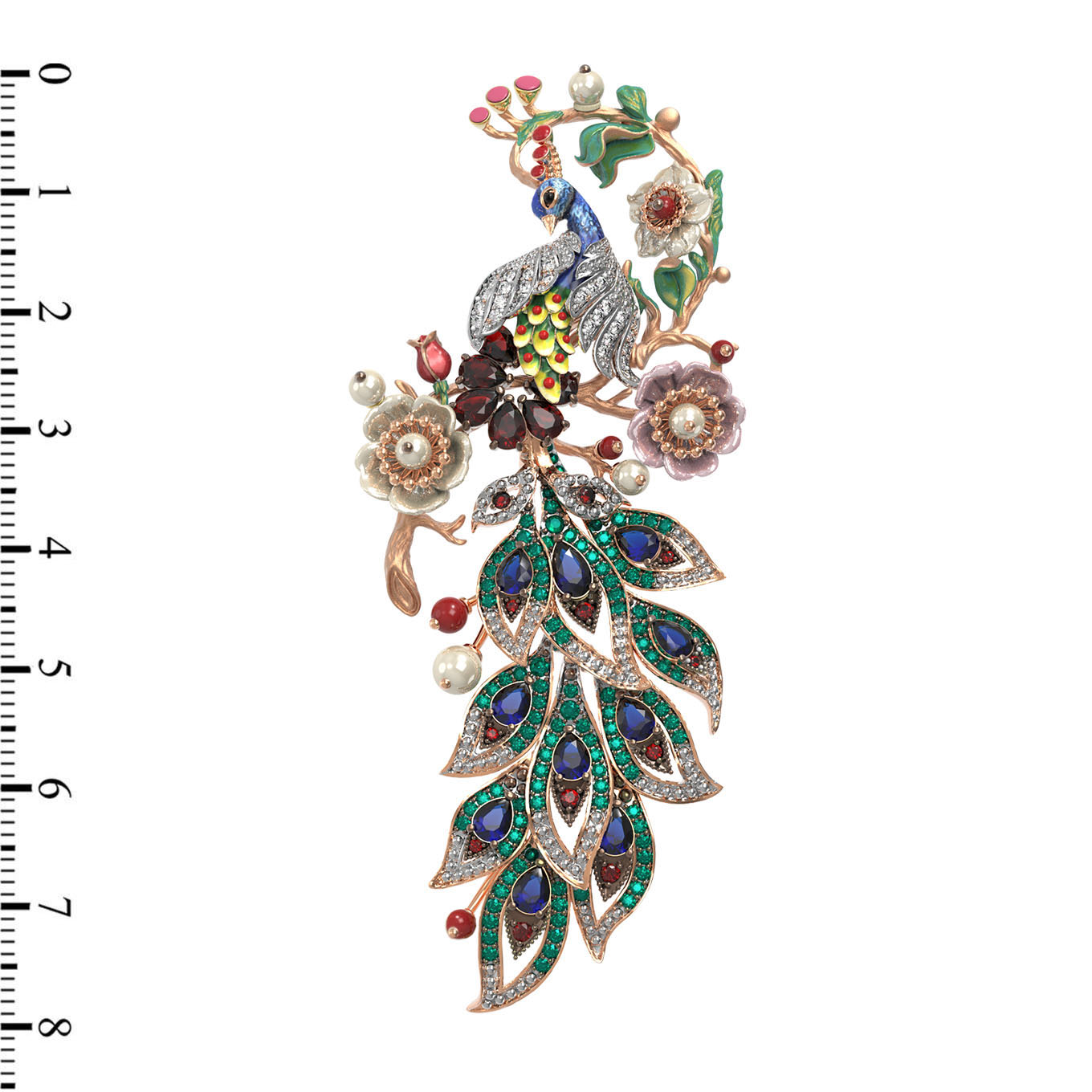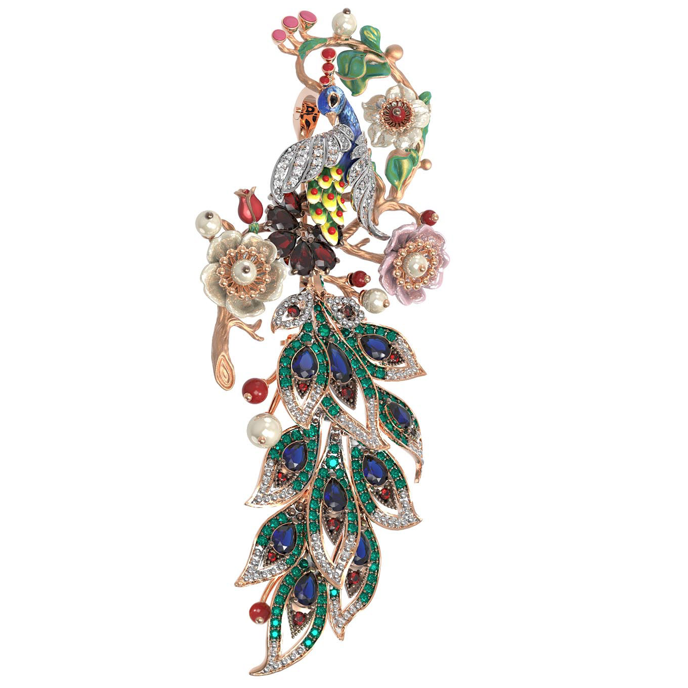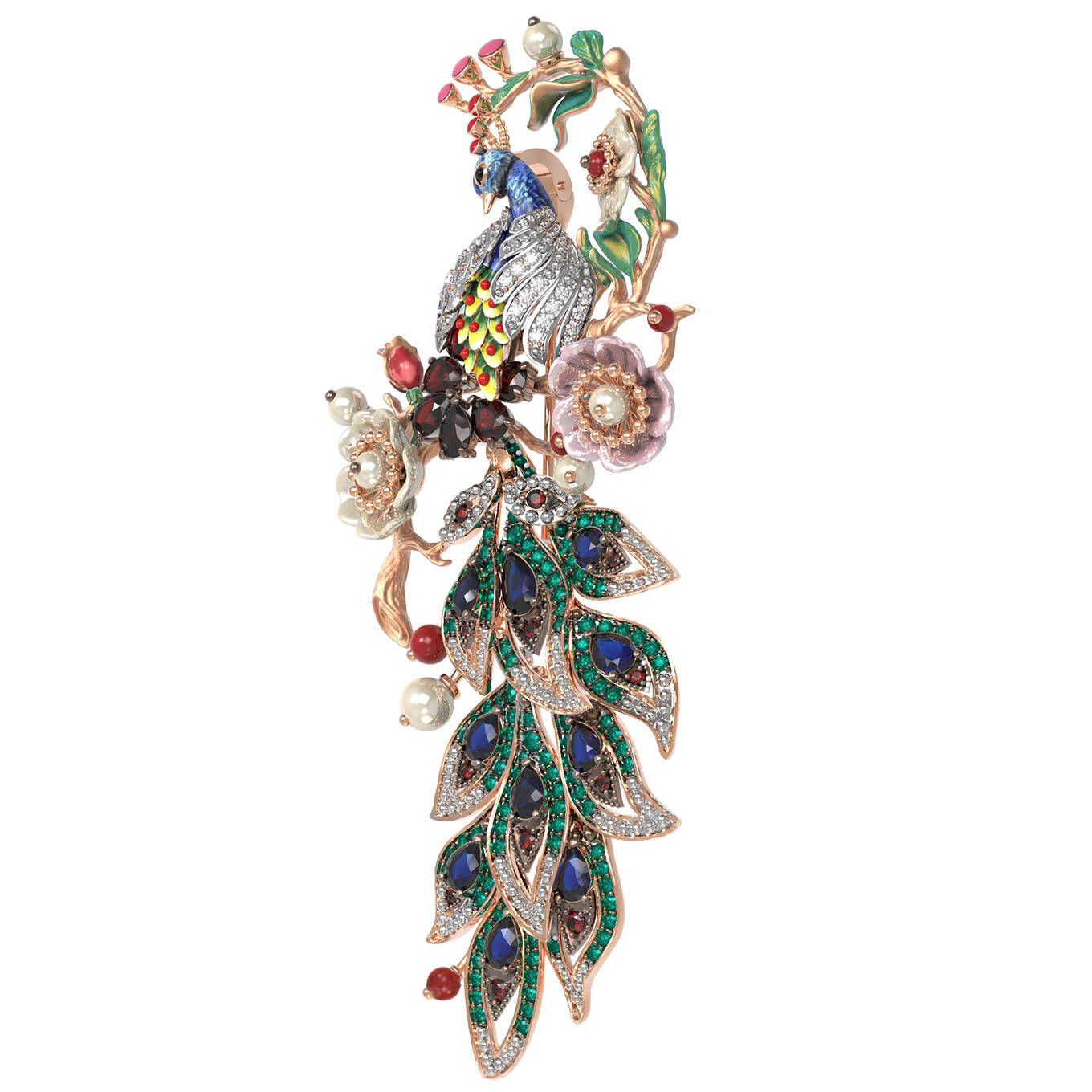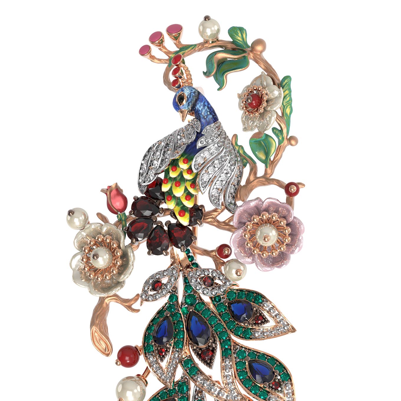 Мастера использовали 172 вставки для создания этого уникального украшения. В дизайне гармонично сочетаются глубокие оттенки граната и насыщенный синий цвет сапфира, дополненные нежным сиянием жемчуга и перламутра. Красные акценты коралла придают броши выразительность, а сверкающие фианиты подчеркивают линии узора. Яркая эмаль добавляет финальные штрихи, создавая неповторимый цветовой ансамбль. Вставки представлены в формах бусины, груши и круга, что придает изделию объем и динамику.