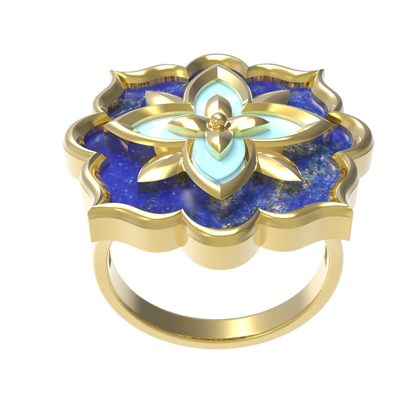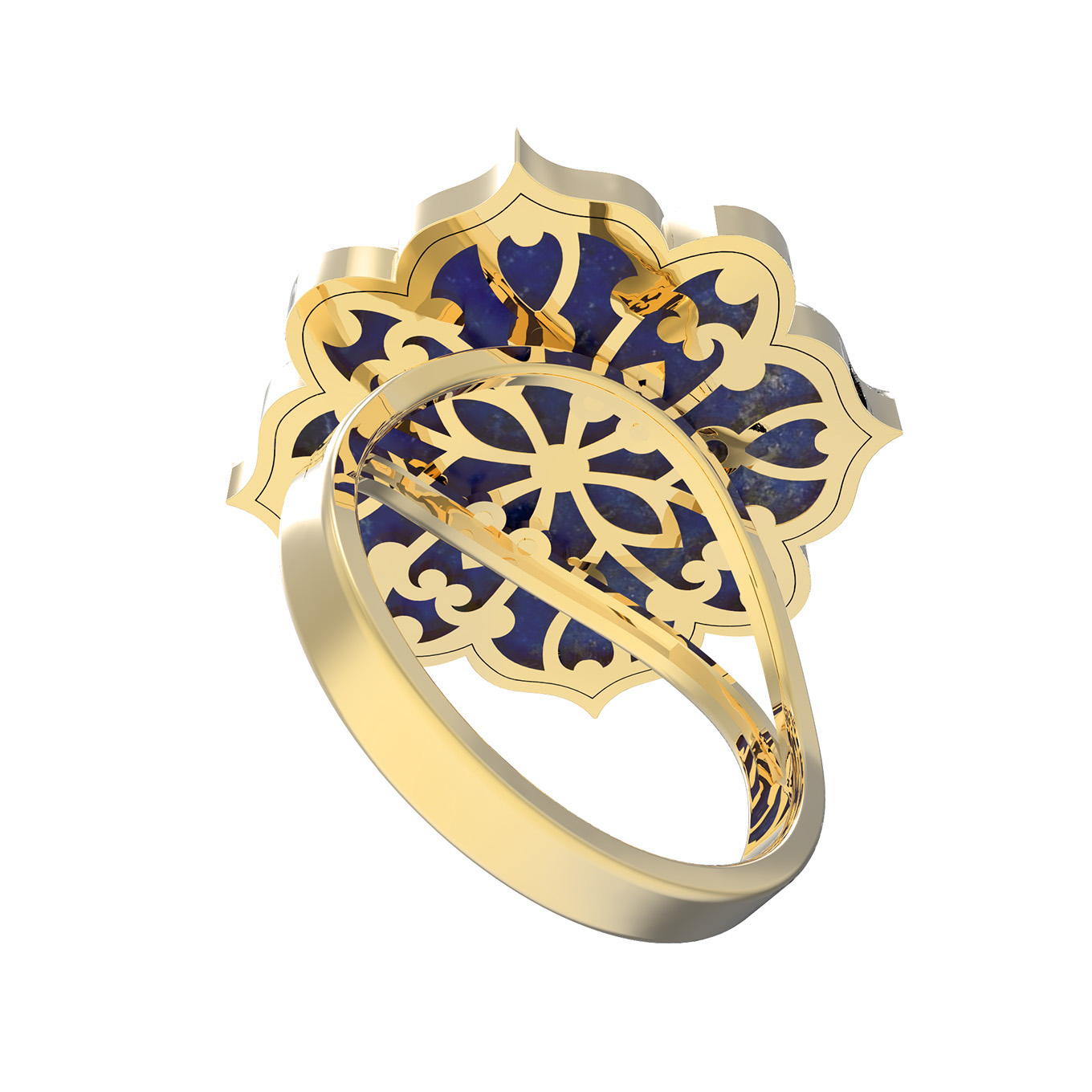 Роскошное кольцо из лимонного золота 585 пробы из коллекции De Luxe — Ренессанс воплощает в себе эстетику эпохи Ренессанс, переосмысленную в современном ювелирном прочтении. Дизайн изделия поражает своей детализацией: искусная форма цветка гармонично сочетает в себе благородный металл и природные минералы. В центре композиции расположены две вставки — нежная бирюза бирюзового цвета и глубокий синий лазурит, которые создают эффектный контраст и привлекают внимание к яркому, солнечному оттенку лимонного золота.