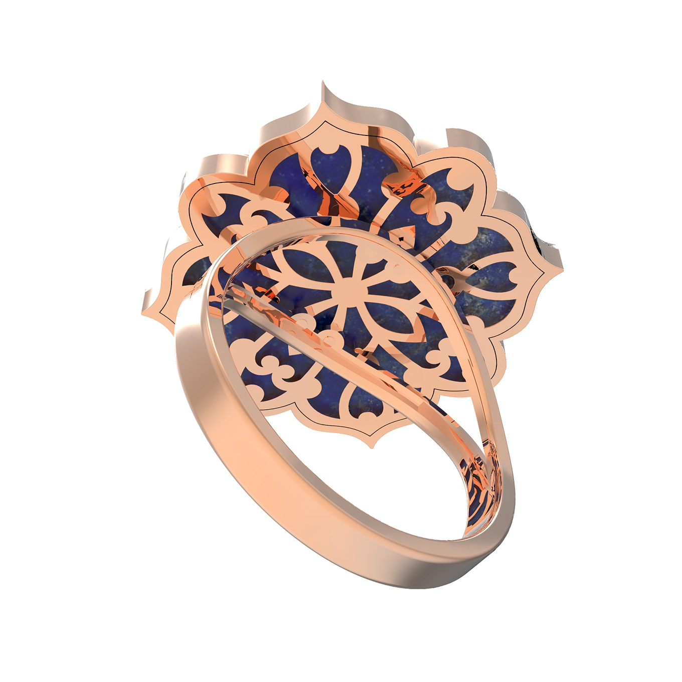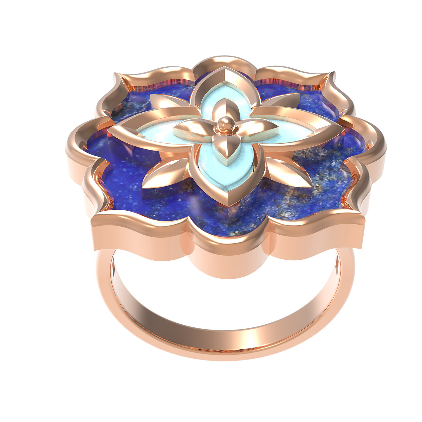 Кольцо из красного золота 585 пробы из коллекции De Luxe — Ренессанс станет изысканным акцентом вашего образа. Дизайн изделия вдохновлен эстетикой эпохи Ренессанс, где гармония форм и насыщенность цвета играют ключевую роль. Массивный декоративный элемент в виде распускающегося цветка приковывает взгляд своей многослойностью и контрастным сочетанием материалов. Центральная композиция дополнена вставками из бирюзы бирюзового цвета и глубокого синего лазурита, что создает благородный визуальный эффект.