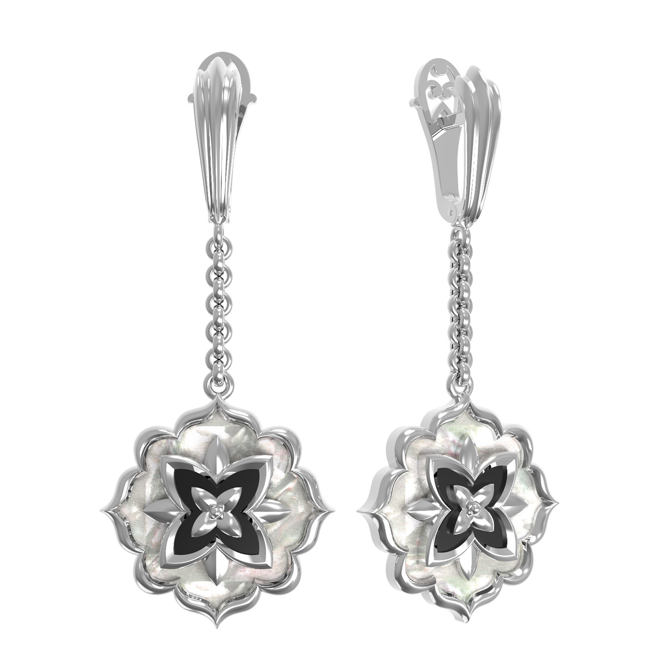 В центре композиции находится сочетание двух контрастных по фактуре камней: глубокого черного оникса и нежного перламутра. Именно этот дуэт придает серьгам статусное звучание. Дизайн Ренессанс прослеживается в филигранных линиях оправы, напоминающих старинные архитектурные элементы. Две вставки с перламутровым переливом и черным глянцем создают эффектный визуальный акцент.