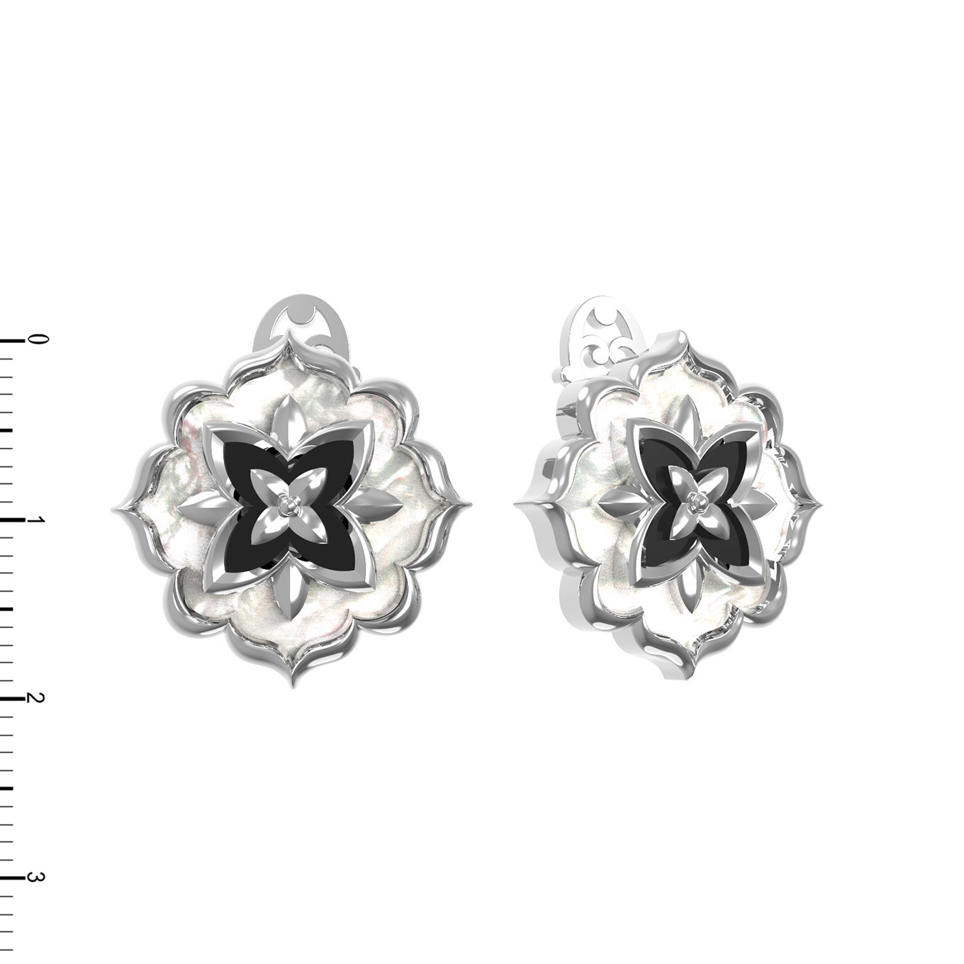 Центральным элементом композиции выступает искусное сочетание черного оникса и нежного перламутра. Две вставки, выполненные в виде стилизованного цветка с глубоким черным центром и перламутровым обрамлением, придают изделию особую выразительность. Геометрически выверенные линии оправы в духе эпохи Возрождения создают объемный и глубокий эффект, который подчеркивает статус владельца.