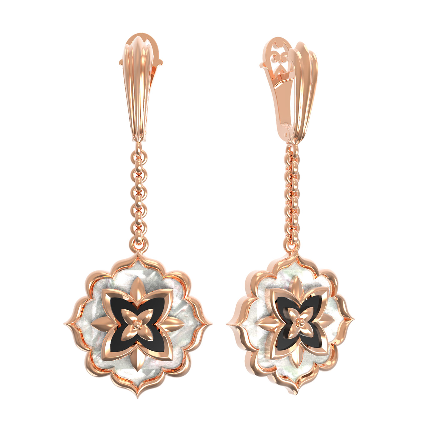 Центральный элемент композиции — искусное сочетание контрастных материалов: глубокого черного оникса и нежного перламутра. Две вставки, искусно ограненные в форме флорального мотива, создают завораживающую игру света и цвета. Благодаря изящной цепочке серьги эффектно покачиваются при каждом движении, привлекая внимание к своей детализированной проработке. Это изделие, созданное для ценителей утонченной роскоши, станет прекрасным дополнением как к вечернему наряду, так и к изысканному деловому костюму.
