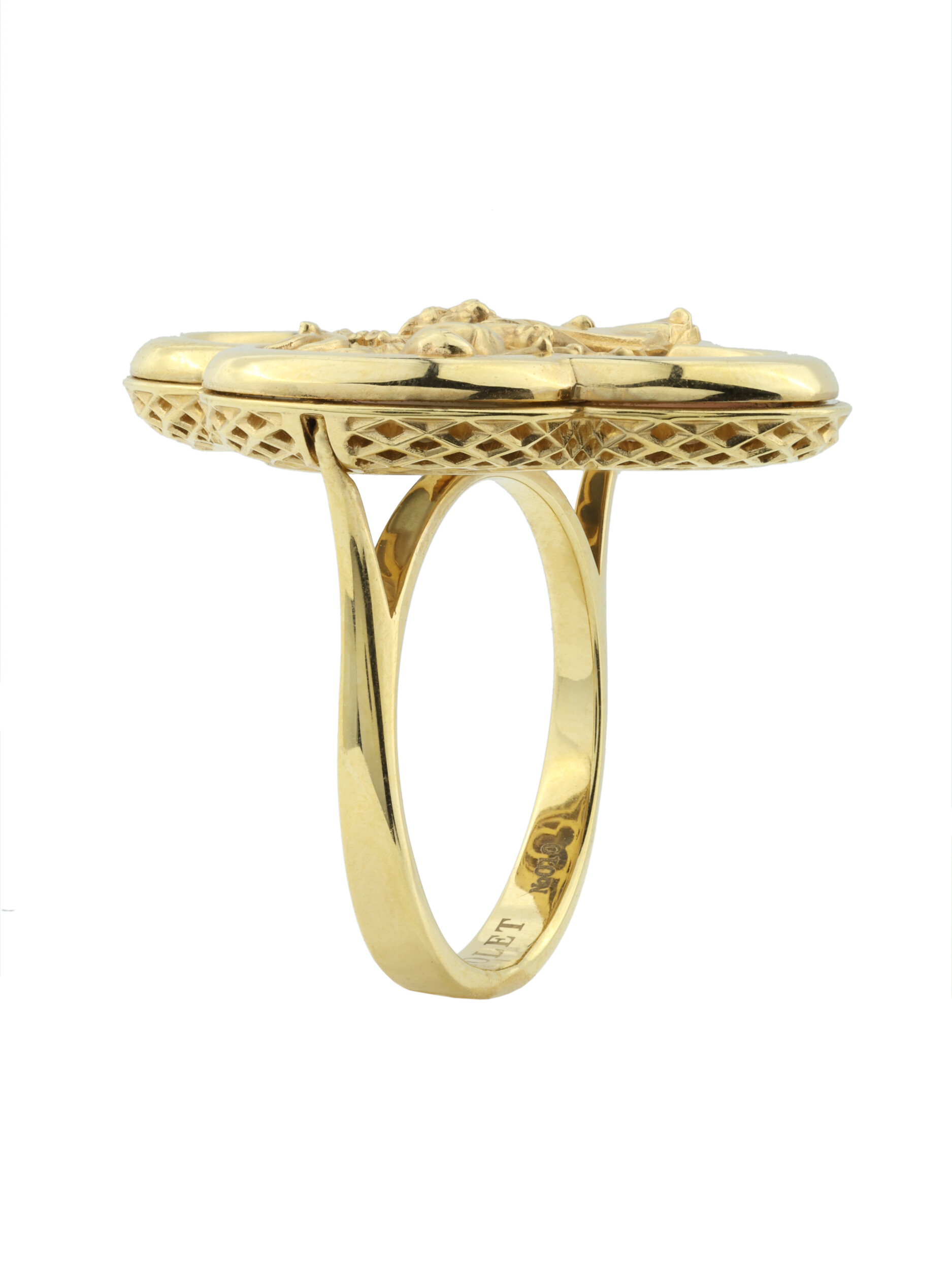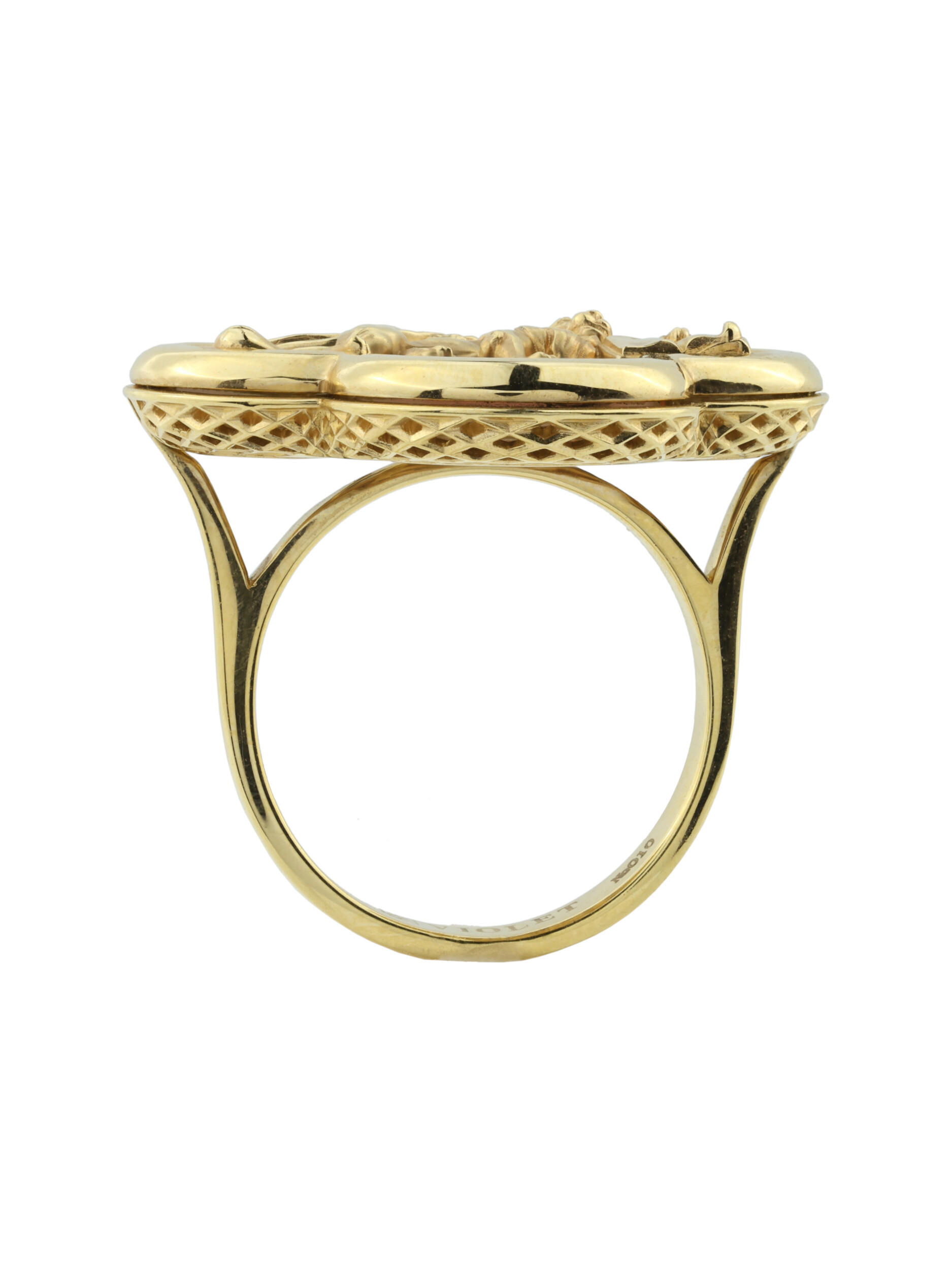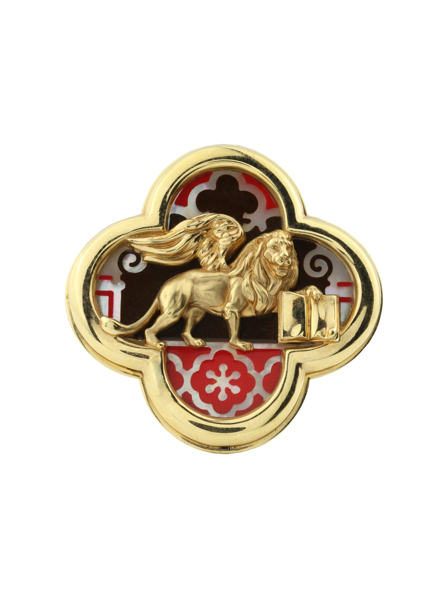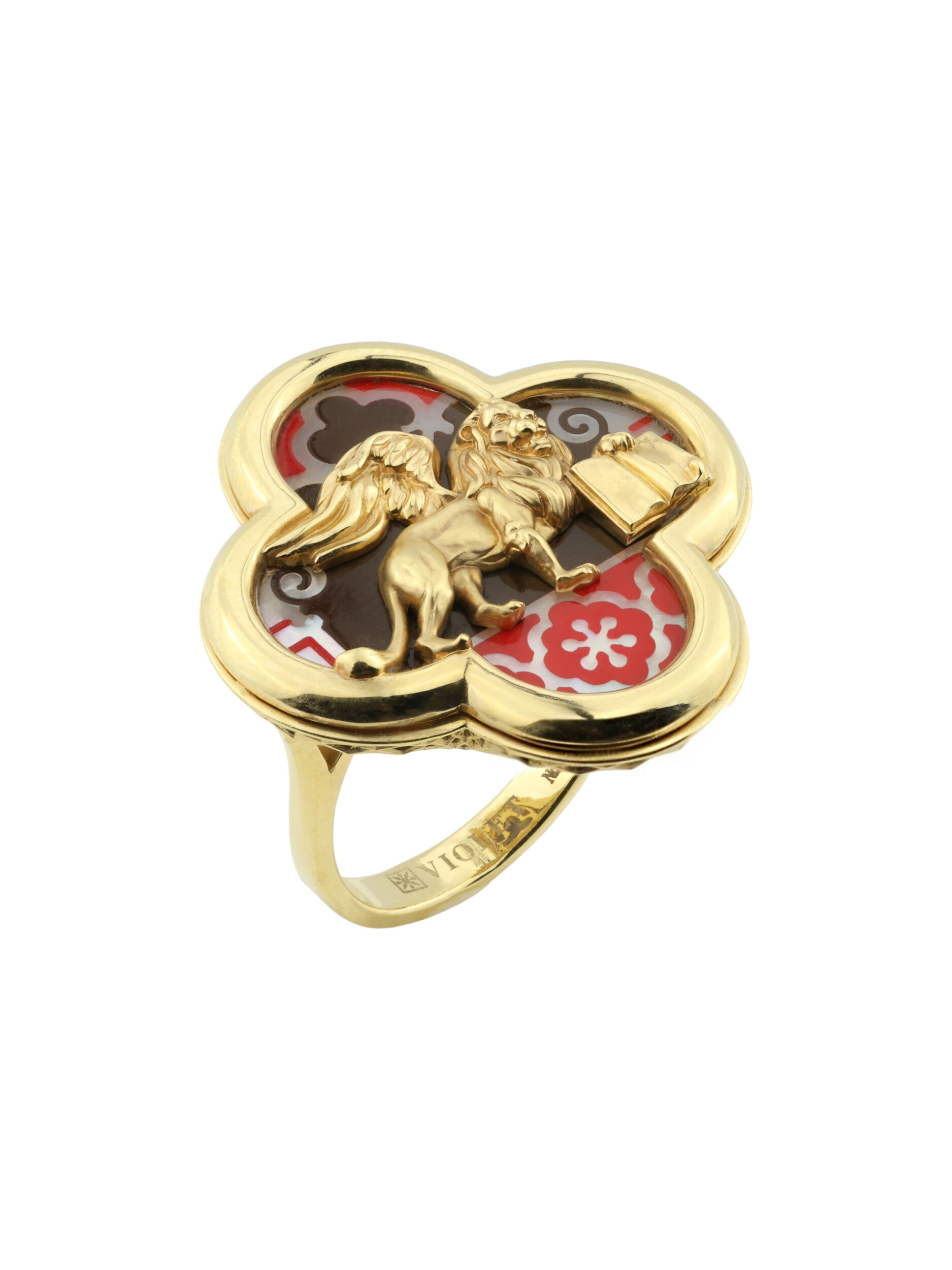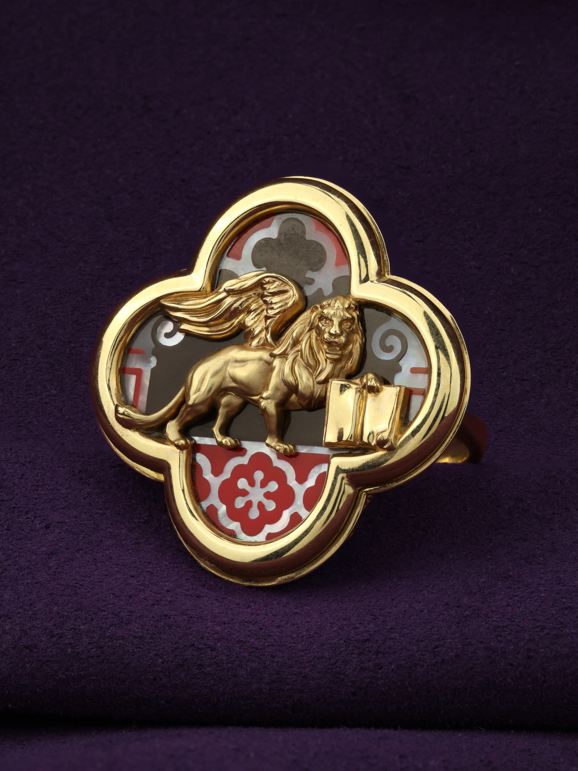Дизайн изделия отличается особой глубиной благодаря использованию вставок из перламутра и разноцветной эмали, которые создают неповторимую игру света и цвета. Лимонный оттенок золота придает кольцу благородное сияние, усиливая детализацию фигуры льва. Это украшение подойдет как женщинам, так и мужчинам, предпочитающим эксклюзивные аксессуары со смыслом. Кольцо гармонично впишется в составные комплекты, позволяя создавать завершенные ювелирные ансамбли.